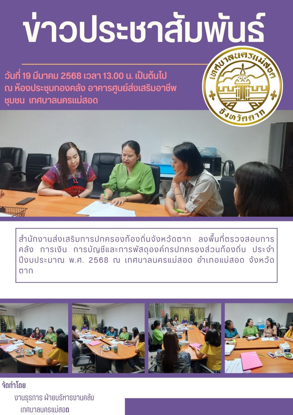 วันที่ 19 มีนาคม 2568 เวลา 13.00 น. เป็นต้นไป สำนักงานส่งเสริมการปกครองท้องถิ่นจังหวัดตาก ลงพื้นที่ตรวจสอบการคลัง การเงิน การบัญชี และการพัสดุองค์กรปกครองส่วนท้องถิ่น ประจำปีงบประมาณ พ.ศ. 2568 ณ เทศบาลนครแม่สอด อำเภอแม่สอด จังหวัดตาก