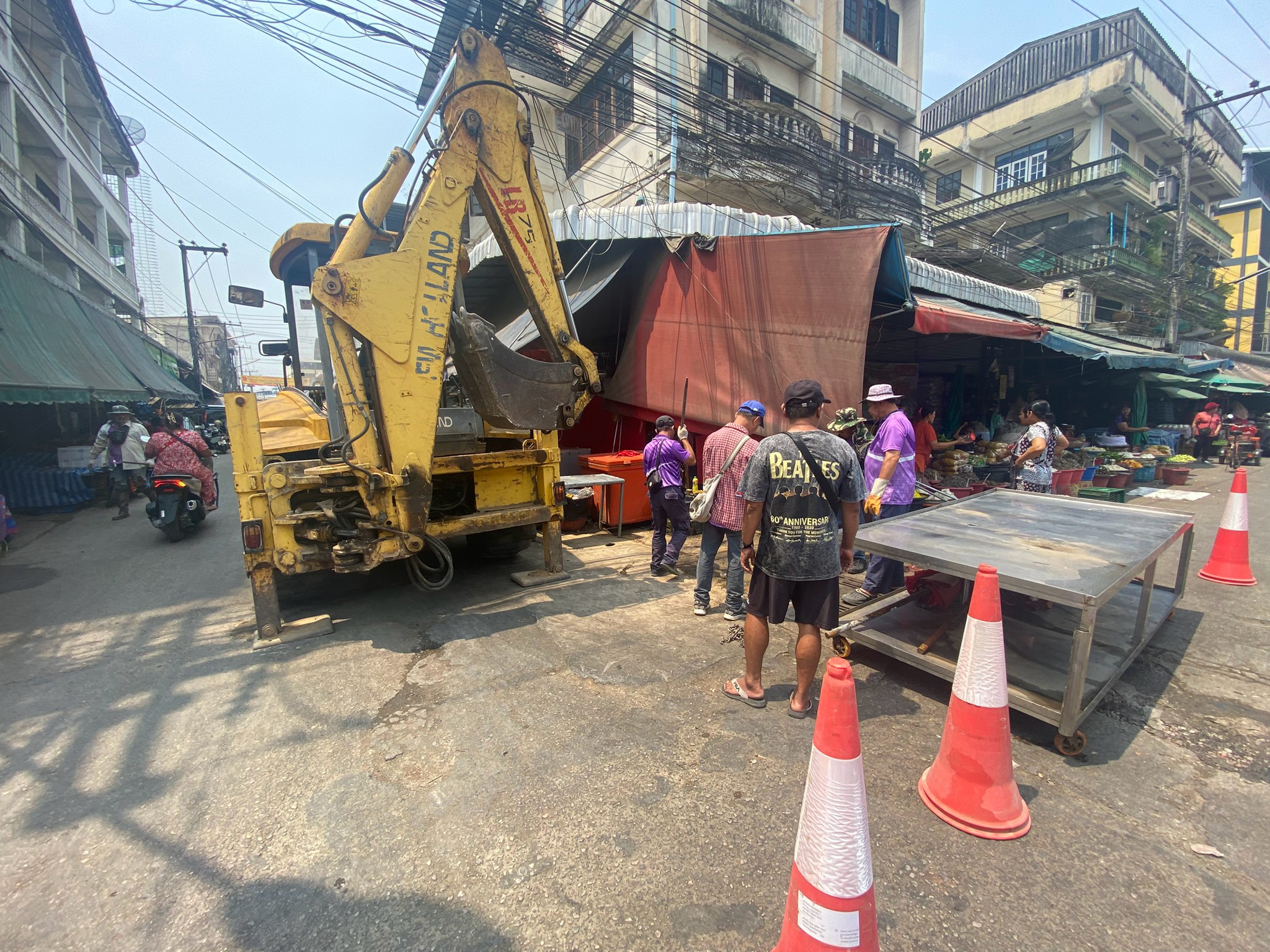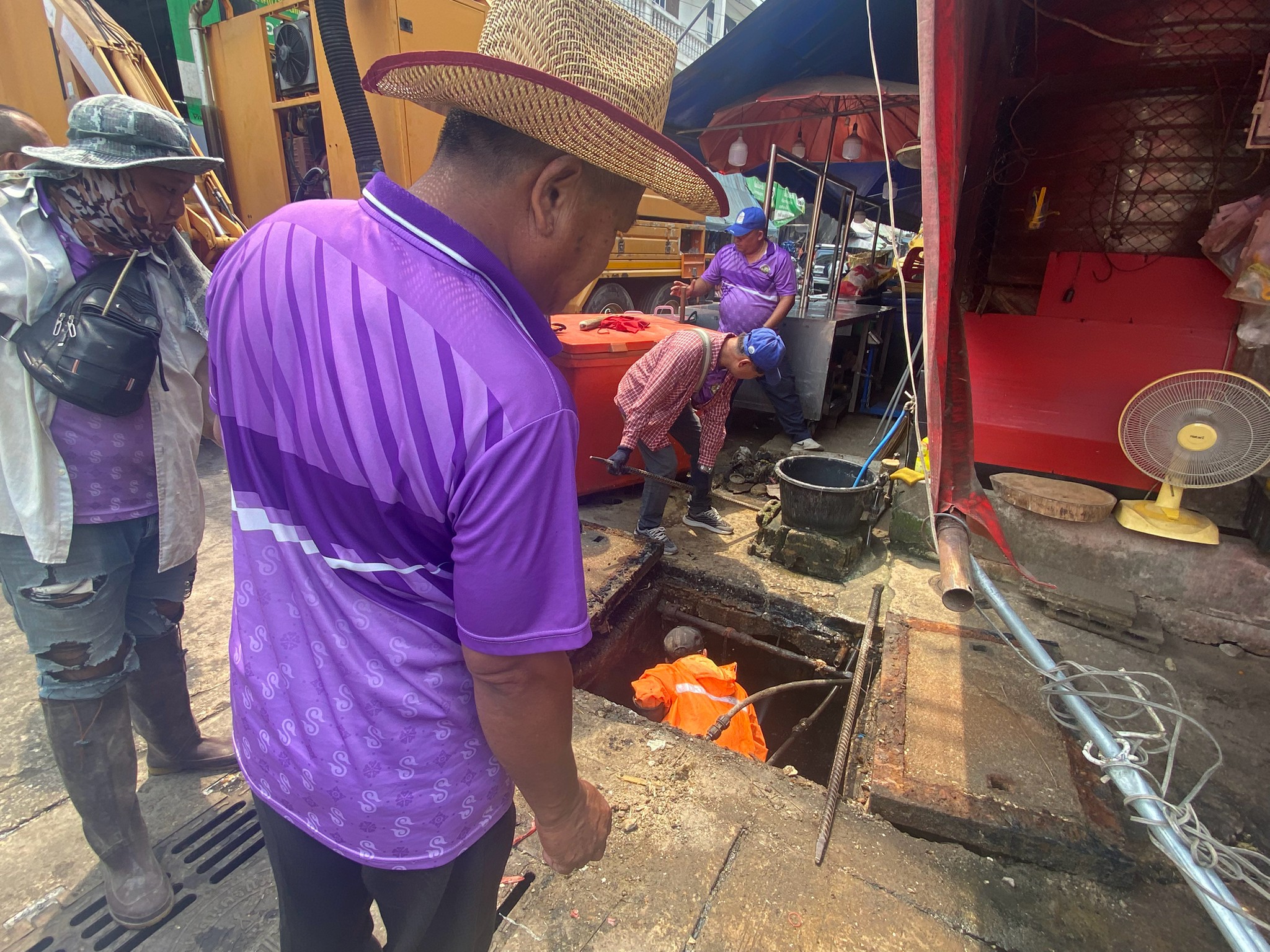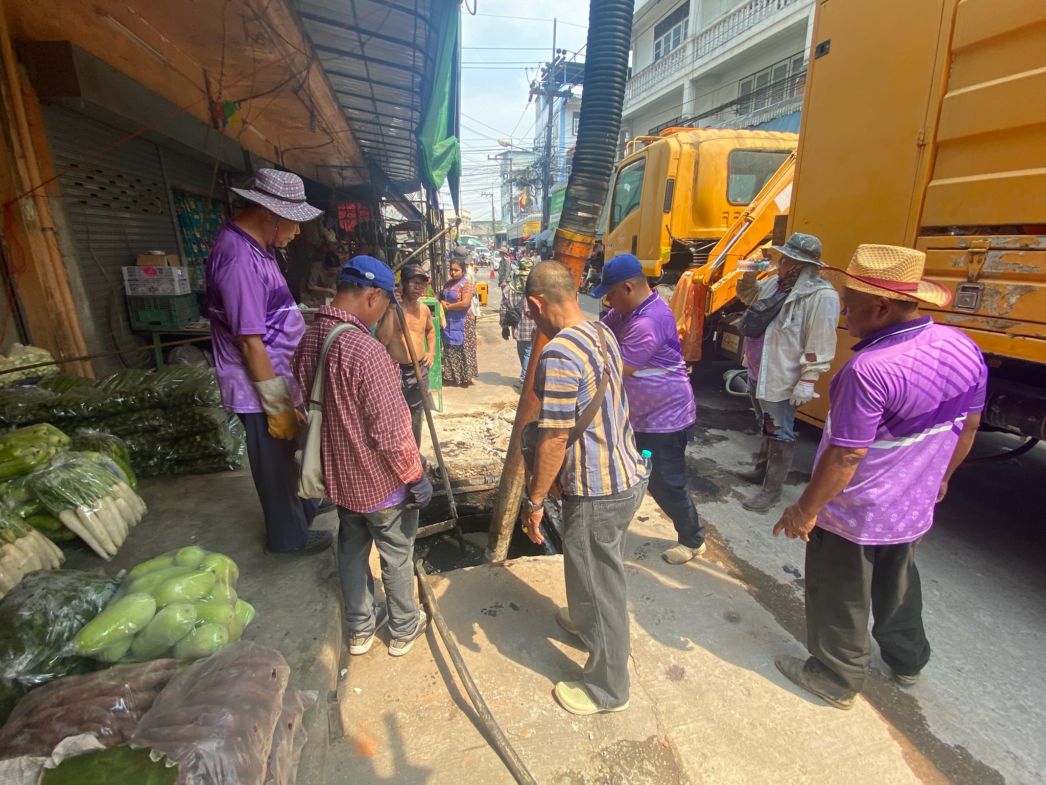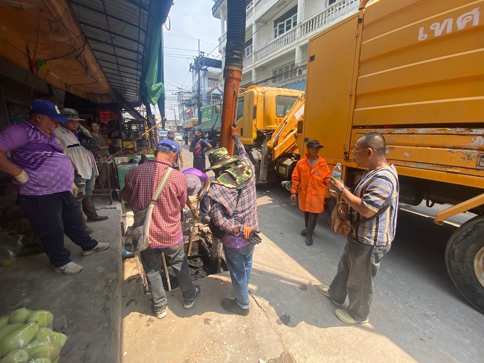ได้เข้าดำเนินการดูดโคลนลอกท่อระบายน้ำ บริเวณสี่แยกร้านขายไก่ ตลาดพาเจริญ