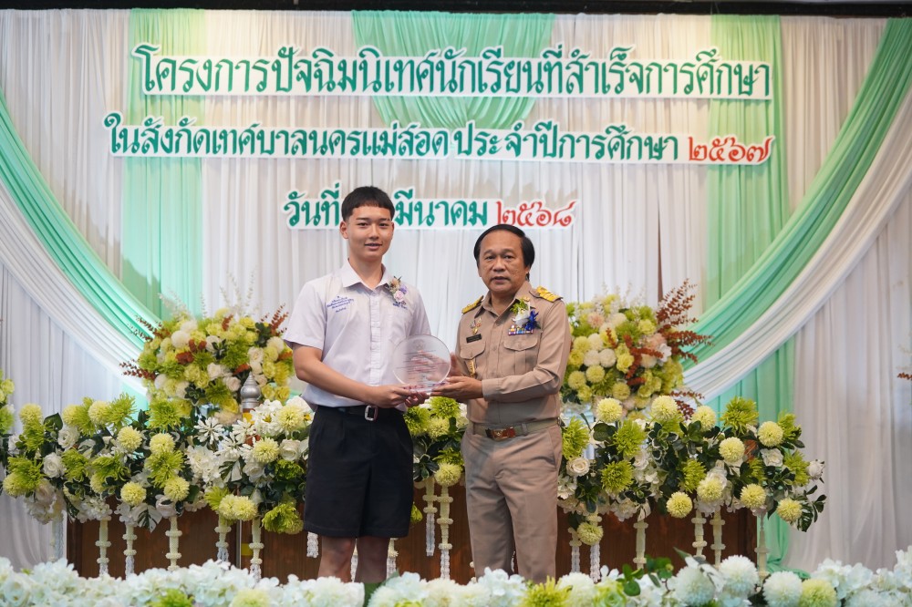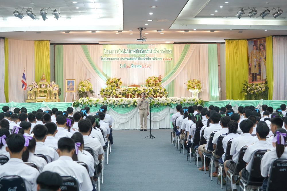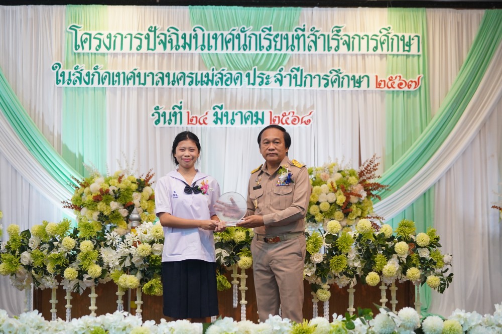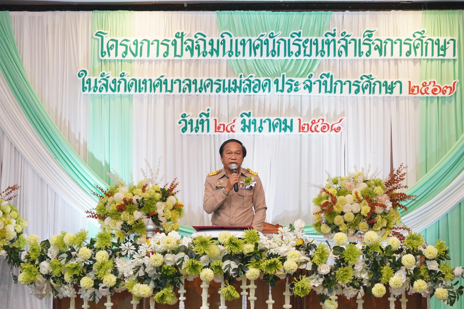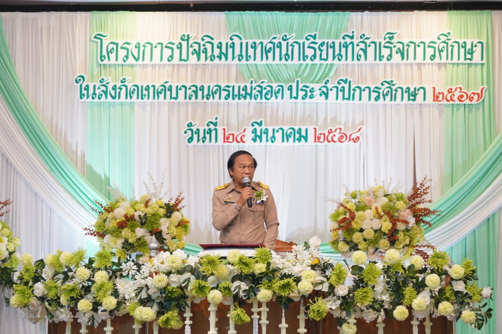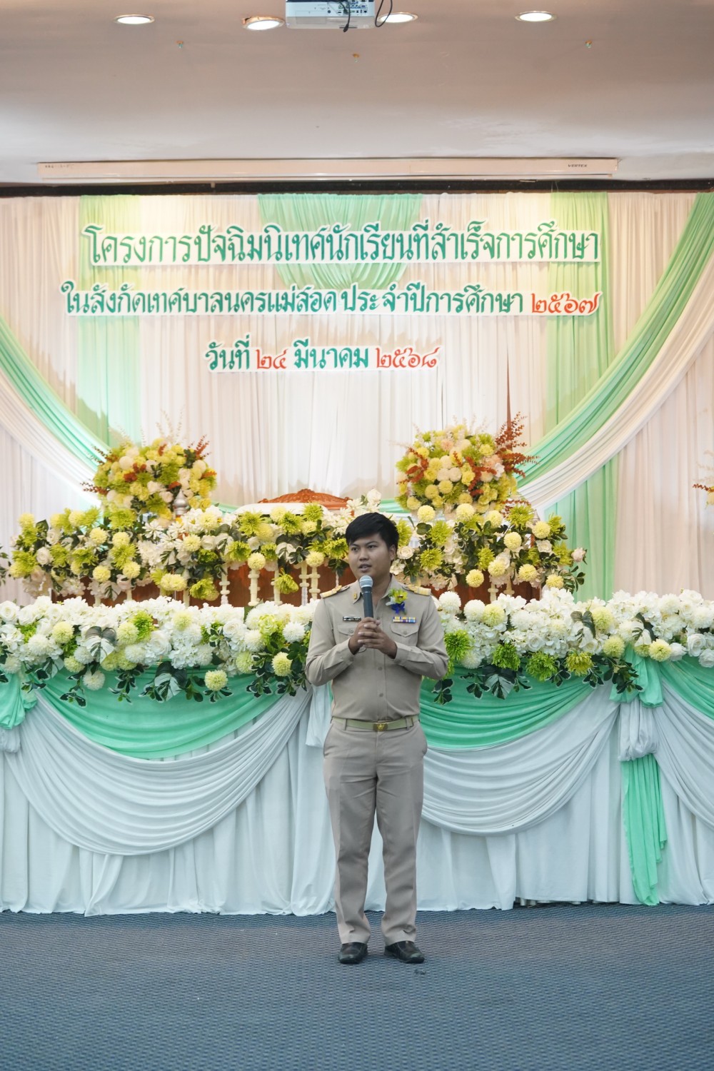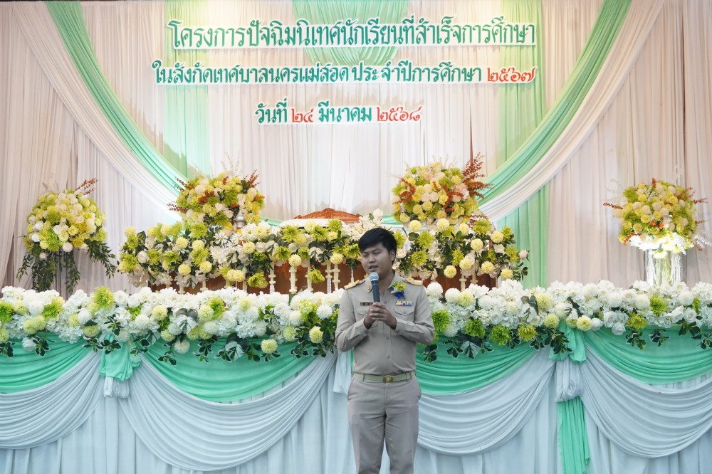 วันที่ 24 มีนาคม 2568 เวลา 09.00 น. ณ ศูนย์กลางแสดงสินค้าและศูนย์ประชุมเพื่อส่งเสริมการท่องเที่ยว - OTOP ว่าที่ร้อยตรีประเสริฐ ปวงละคร นายกเทศมนตรีนครแม่สอด ให้เกียรติเป็นประธานในพิธีเปิดกิจกรรมโครงการปัจฉิมนิเทศนักเรียนที่สำเร็จการศึกษา ประจำปี 2568 พร้อมด้วยคณะผู้บริหารและสมาชิกสภาเทศบาลนครแม่สอด โดยมีนายประสาน มั่นมาก รองปลัดเทศบาล รักษาราชการแทน ปลัดเทศบาลนครแม่สอด พร้อมด้วยผู้อำนวยการสำนัก/กอง หัวหน้าฝ่าย และพนักงานเจ้าหน้าที่เทศบาลนครแม่สอด ร่วมกล่าวรายงานถึงวัตถุประสงค์การจัดงานในครั้งนี้