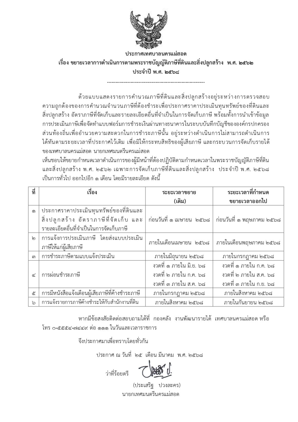ประกาศเทศบาลนครแม่สอด เรื่อง ขยายเวลาการดำเนินการตามพระราชบัญญัติภาษีที่ดินและสิ่งปลูกสร้าง พ.ศ. 2562 ประจำปี พ.ศ. 2568