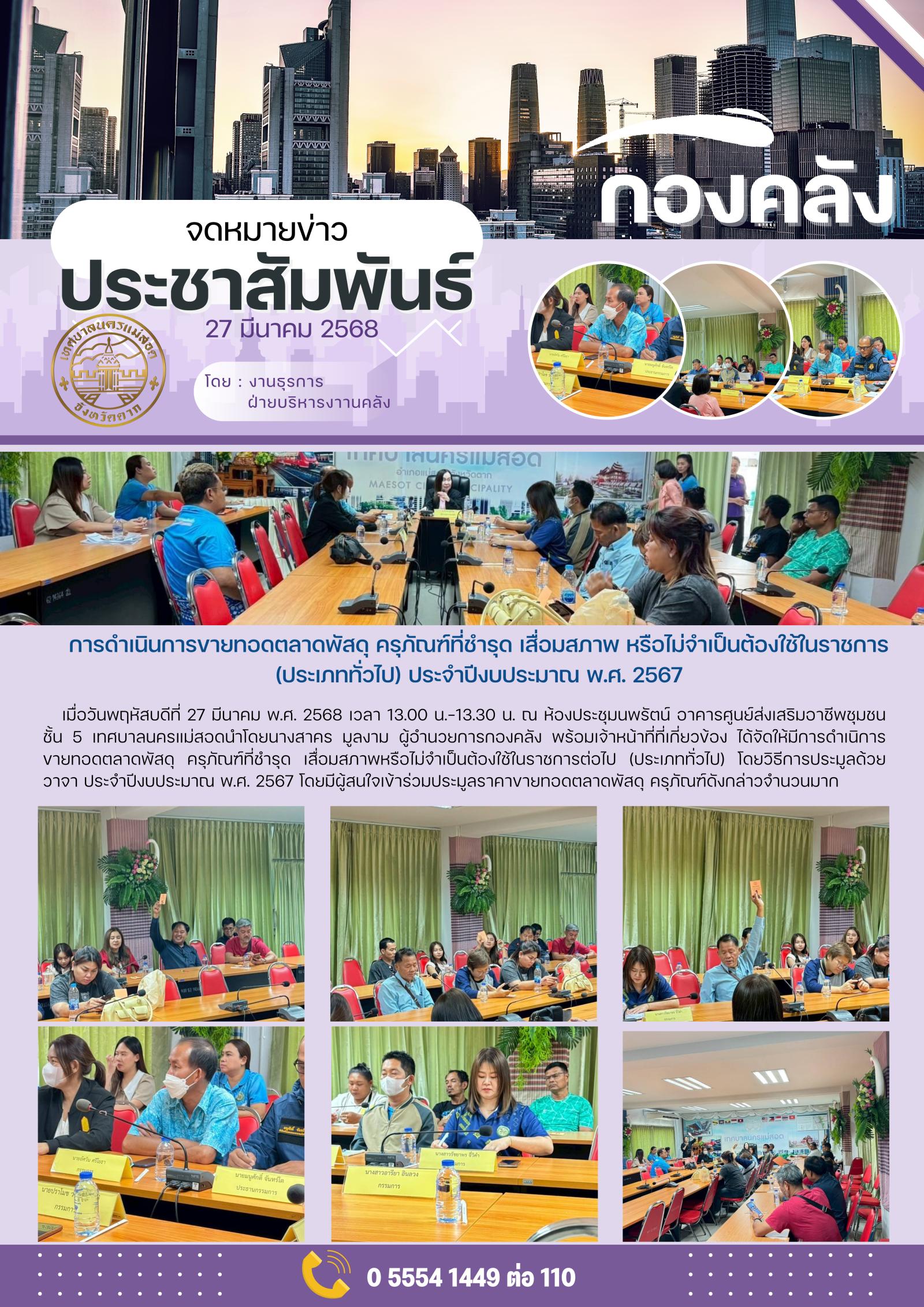 เมื่อวันพฤหัสบดีที่ 28 มีนาคม พ.ศ. 2568 เวลา 13.00 น.-13.30 น. ณ ห้องประชุมนพรัตน์ อาคารศูนย์ส่งเสริมอาชีพชุมชน ชั้น 5 เทศบาลนครแม่สอดนำโดยนางสาคร มูลงาม ผู้อำนวยการกองคลัง พร้อมเจ้าหน้าที่ฝ่ายพัสดุที่เกี่ยวข้อง ได้จัดให้มีการดำเนินการขายทอดตลาดพัสดุ ครุภัณฑ์ที่ชำรุด เสื่อมสภาพหรือไม่จำเป็นต้องใช้ในราชการต่อไป (ประเภททั่วไป) โดยวิธีการประมูลด้วยวาจา ประจำปีงบประมาณ พ.ศ. 2567 โดยมีผู้สนใจเข้าร่วมประมูลราคาขายทอดตลาดพัสดุ ครุภัณฑ์ดังกล่าวจำนวนมาก