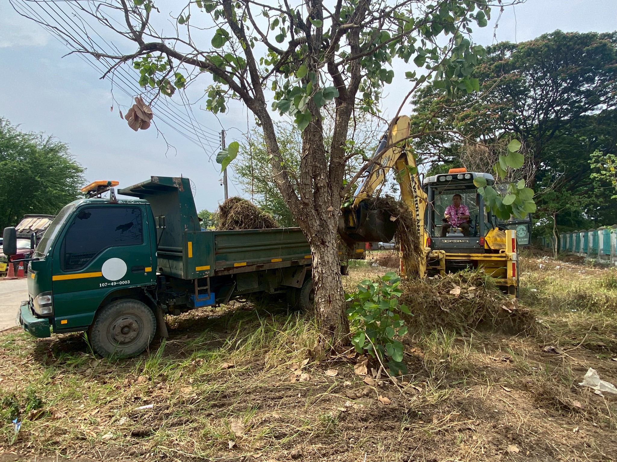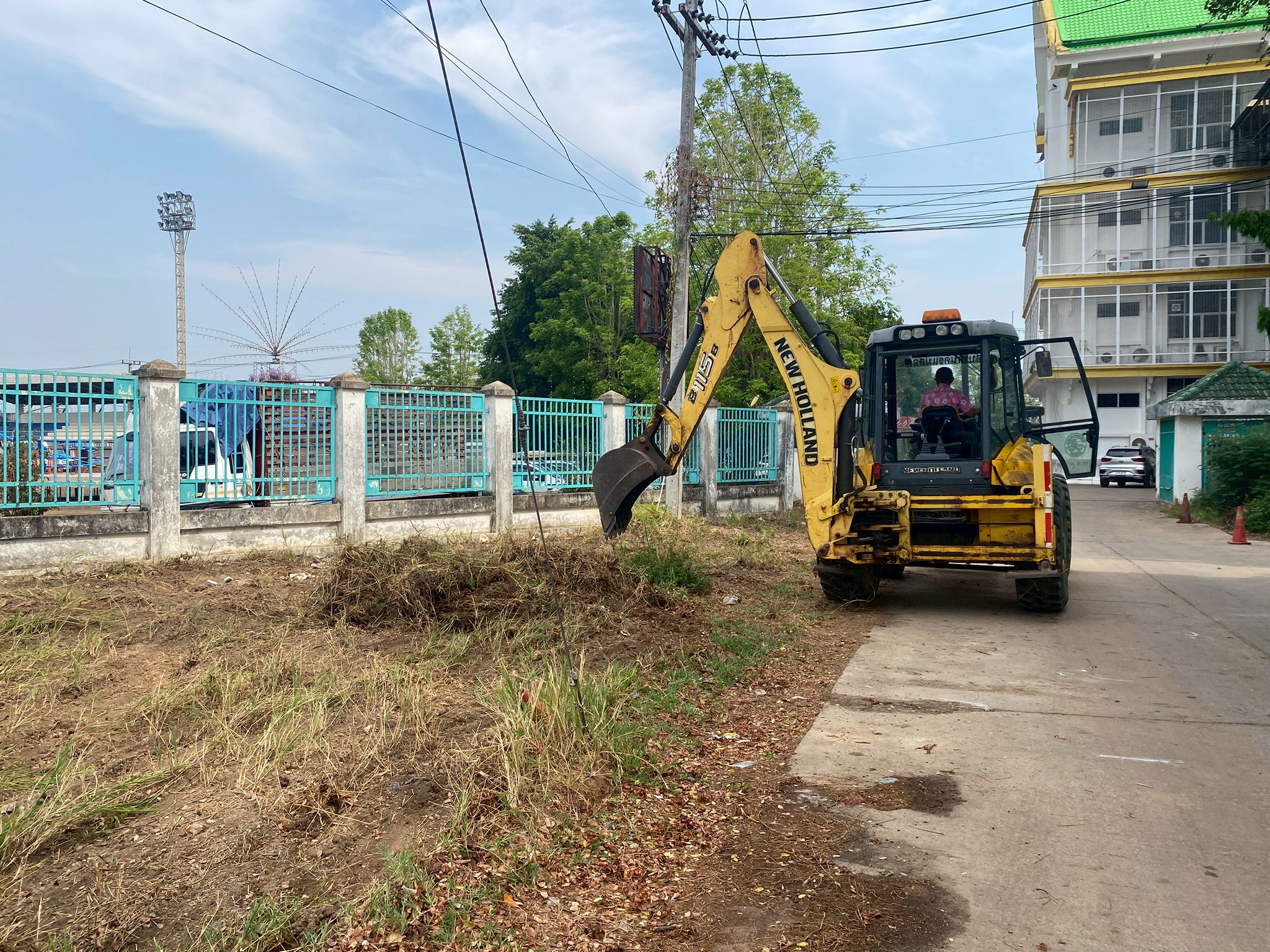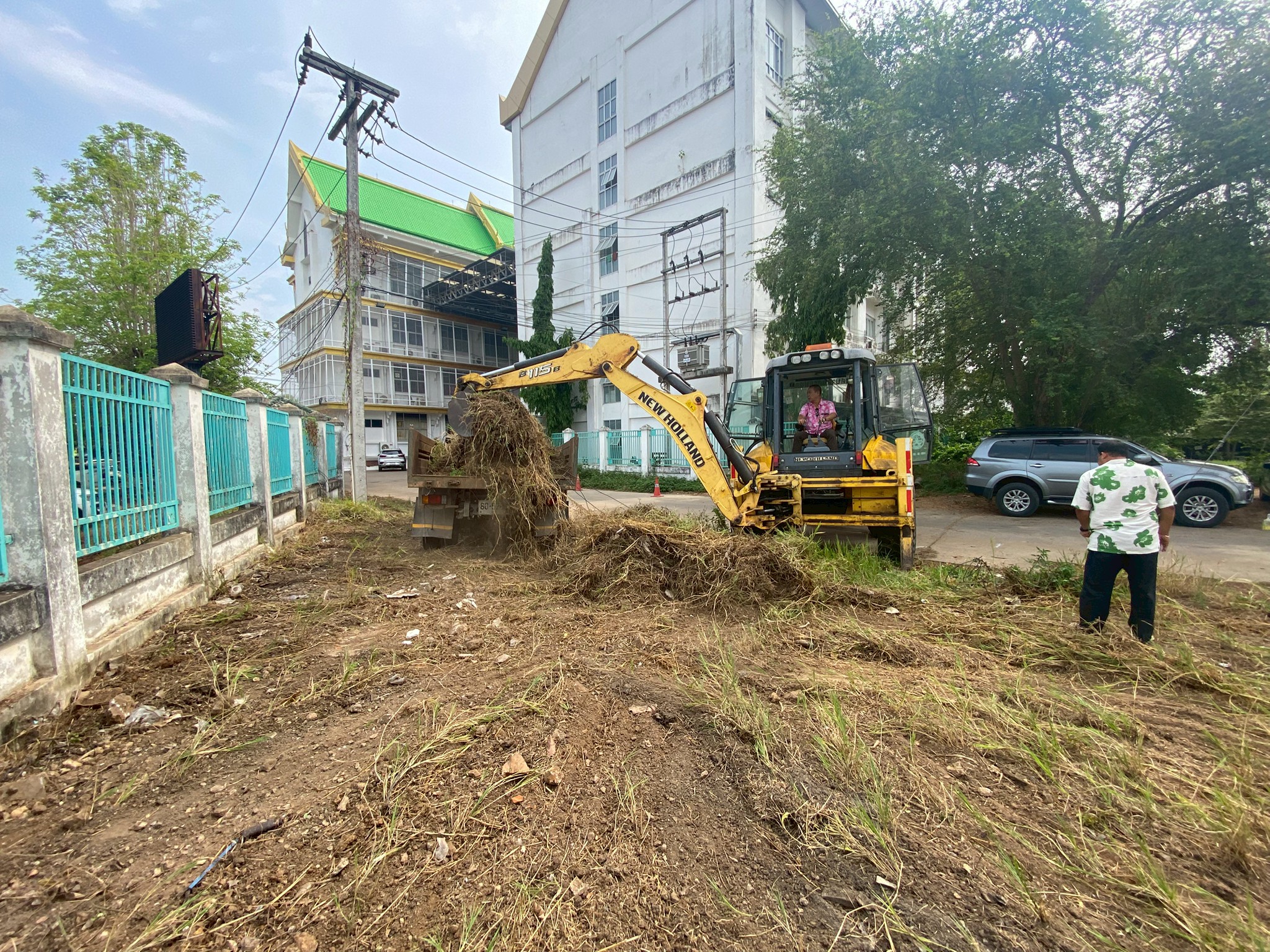 ได้เข้าดำเนินการไถและปรับหญ้า บริเวณหลังสำนักงานเทศบาลนครแม่สอด