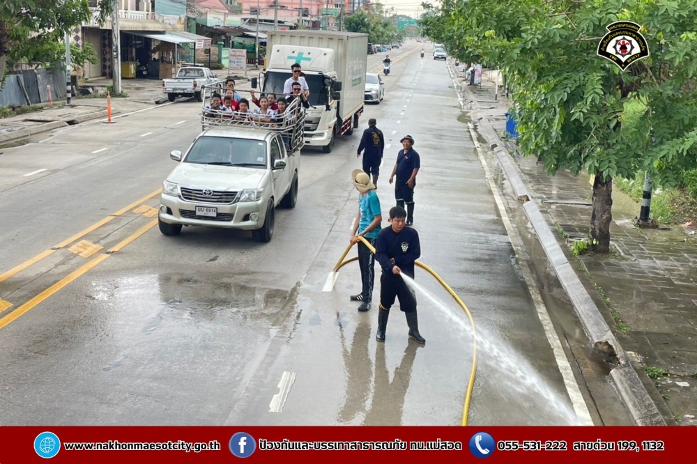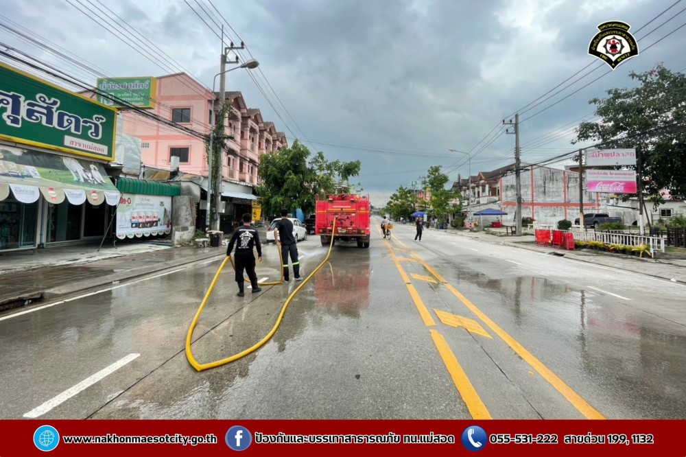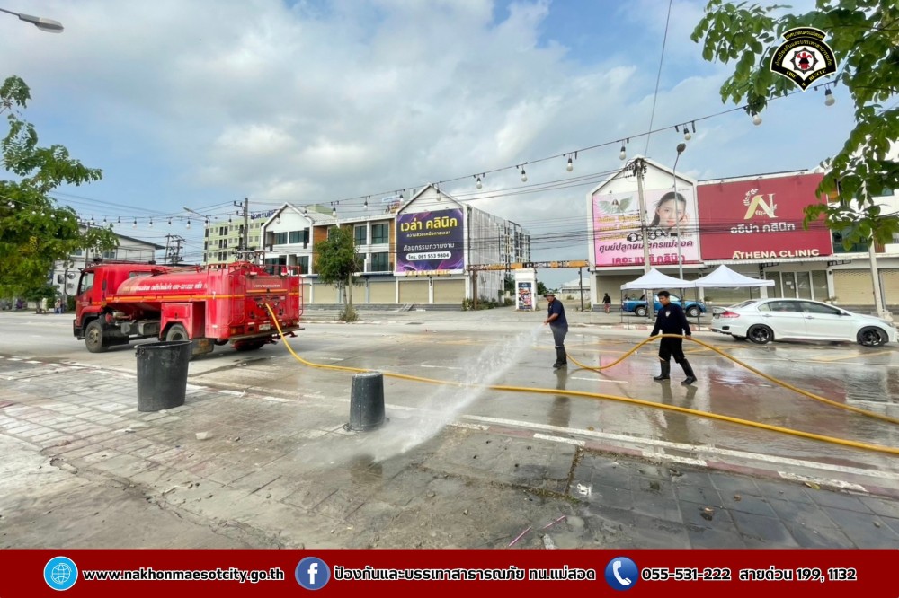 ดับเพลิงนครแม่สอด ฉีดล้างทำความสะอาดถนน บริเวณใกล้เคียงศรีสวัสดิ์ สาขาหน้าโรงพยาบาลแม่สอด ถนนแม่สอด-แม่ตาว