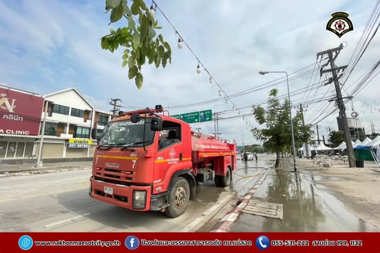 ดับเพลิงนครแม่สอด ฉีดล้างทำความสะอาดถนน บริเวณจุดจัดให้เล่นน้ำสงกรานต์ (Zoning) ถนนยอดข้าว