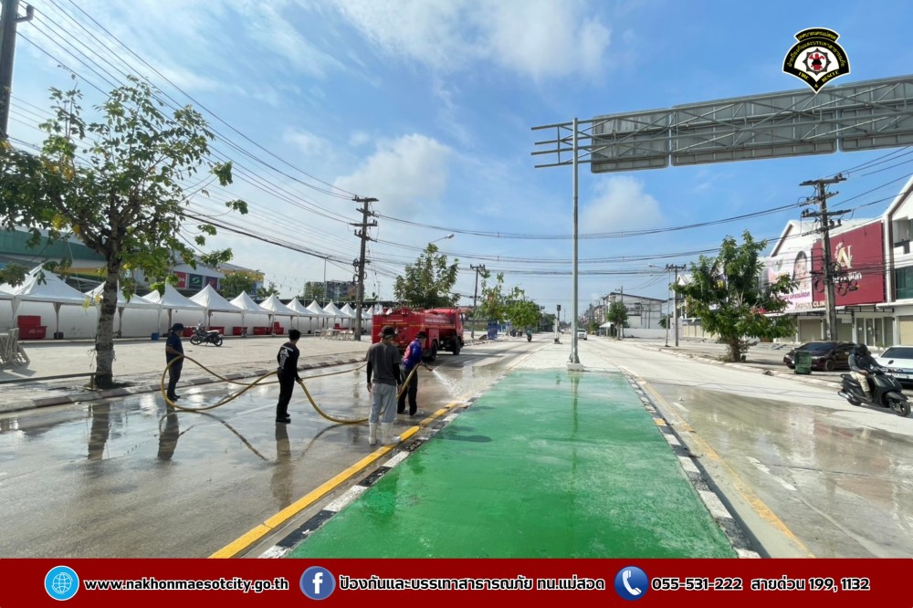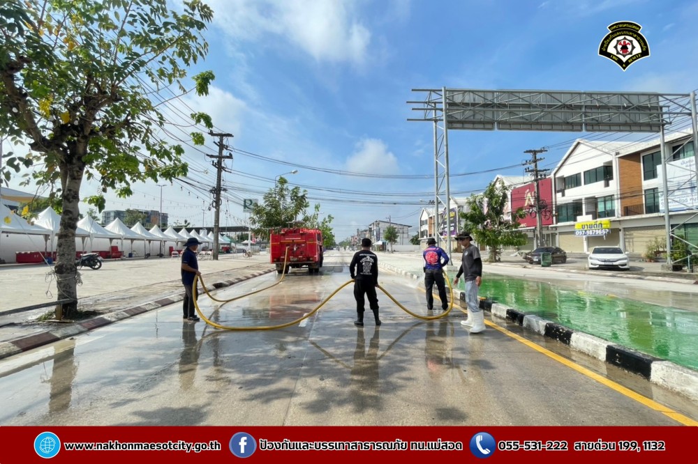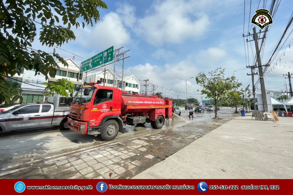 ดับเพลิงนครแม่สอด ฉีดล้างทำความสะอาดถนน บริเวณจุดจัดให้เล่นน้ำสงกรานต์ (Zoning) ถนนยอดข้าว
