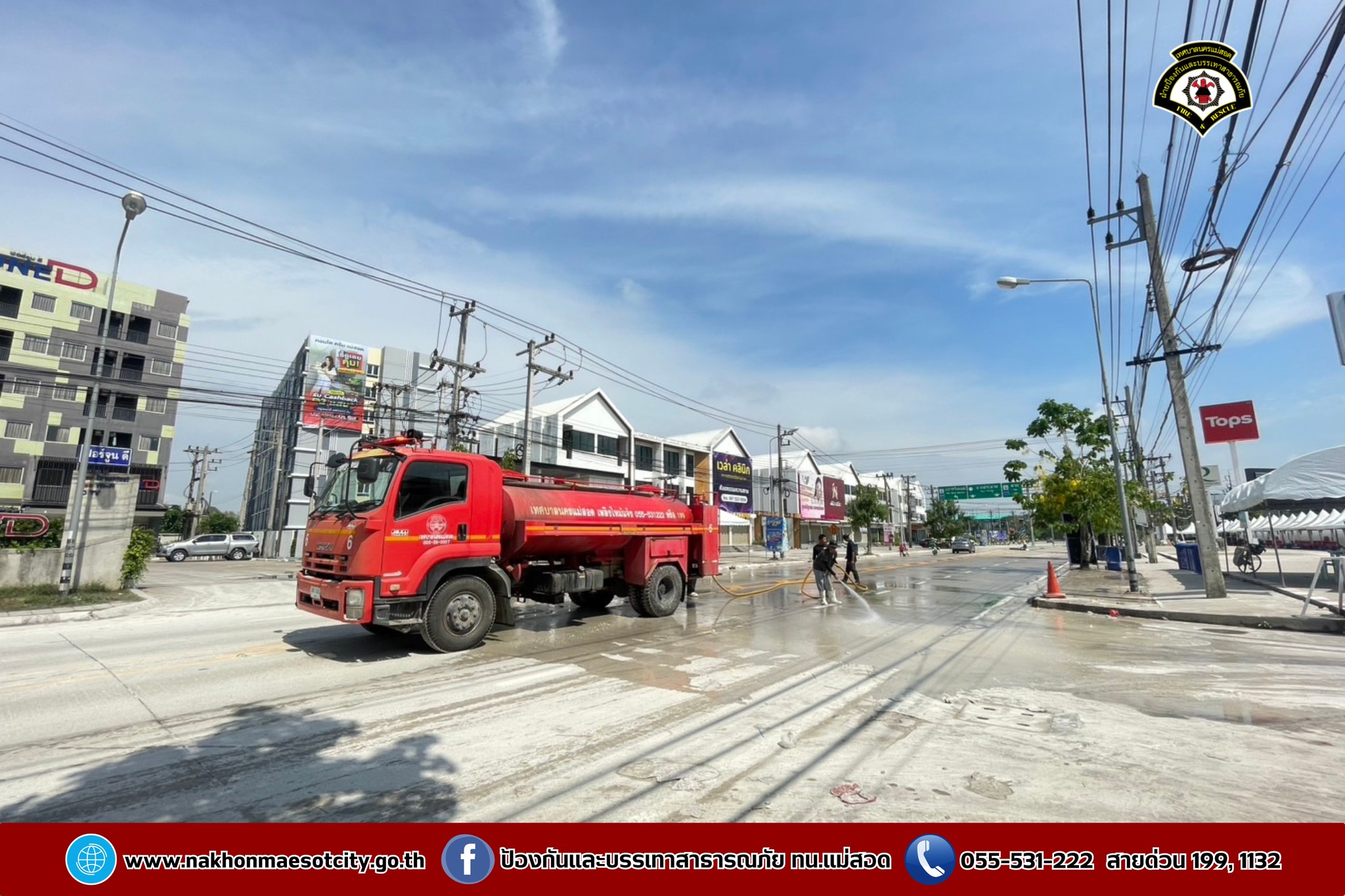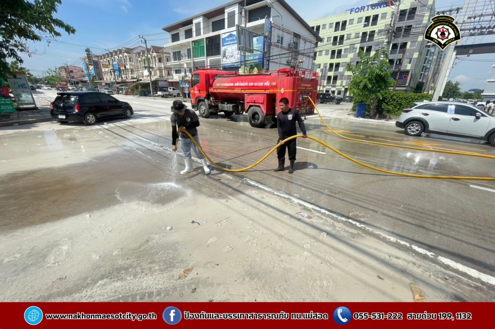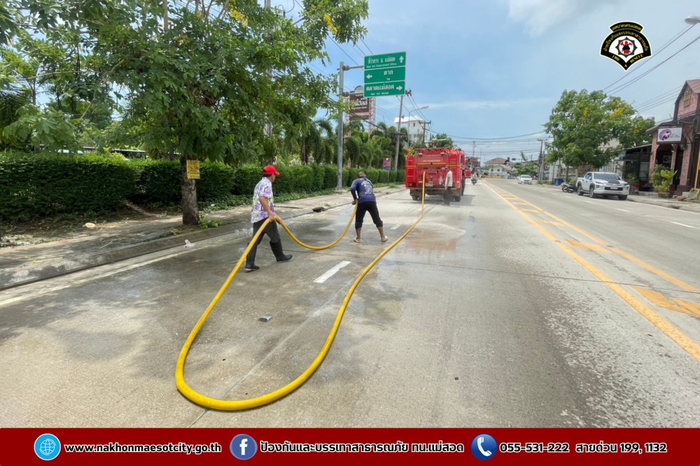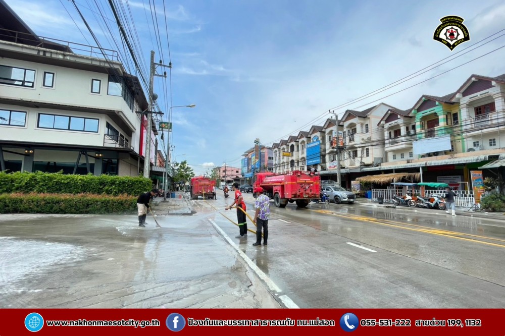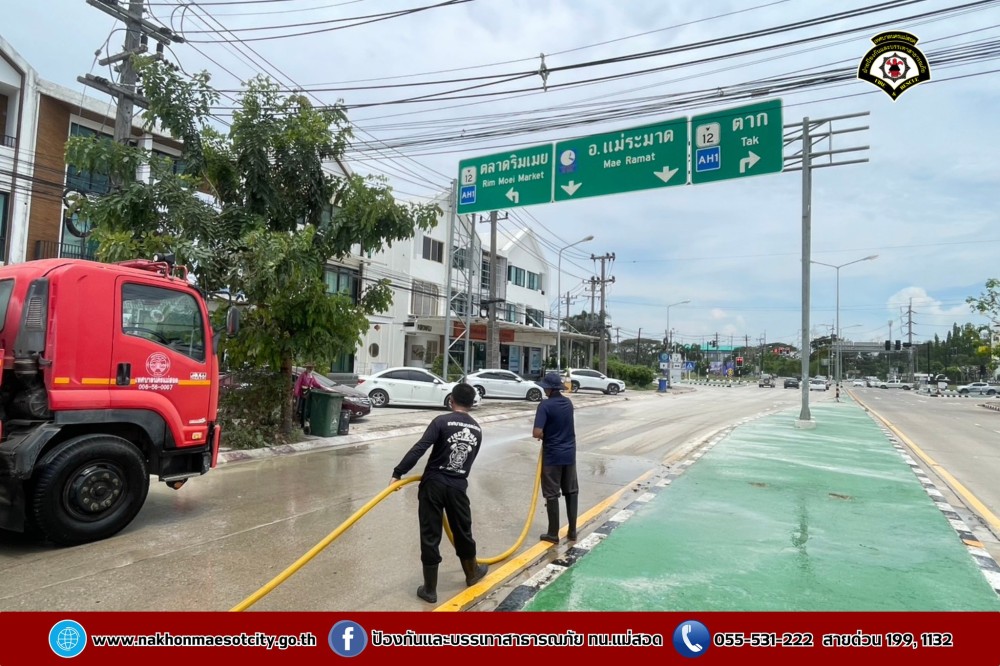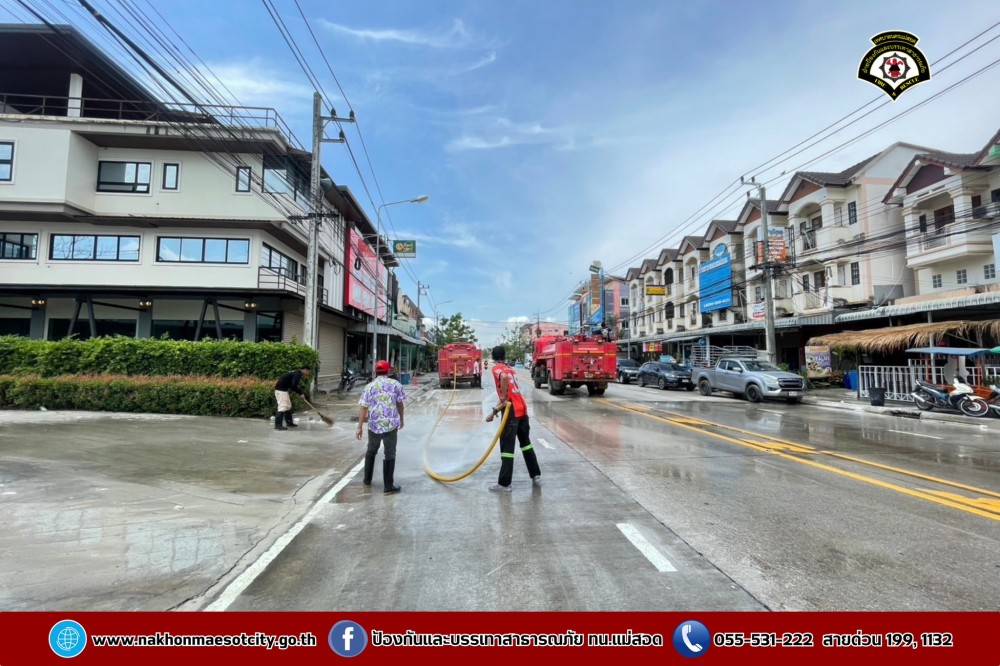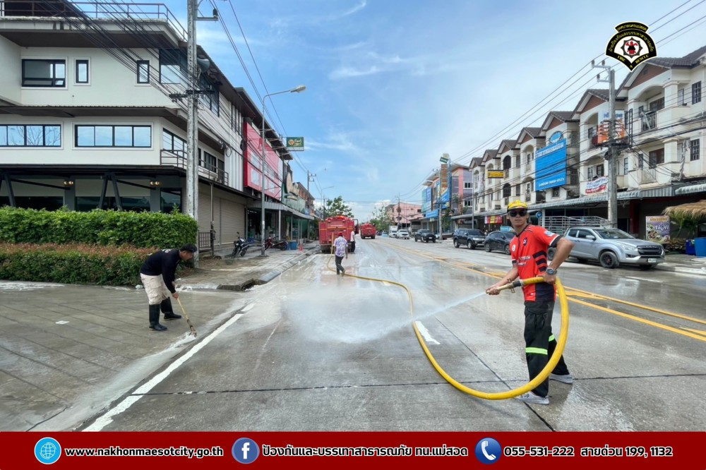 ดับเพลิงนครแม่สอด ฉีดล้างทำความสะอาดถนน บริเวณใกล้เคียงศรีสวัสดิ์ สาขาหน้าโรงพยาบาลแม่สอด ถนนแม่สอด-แม่ตาว