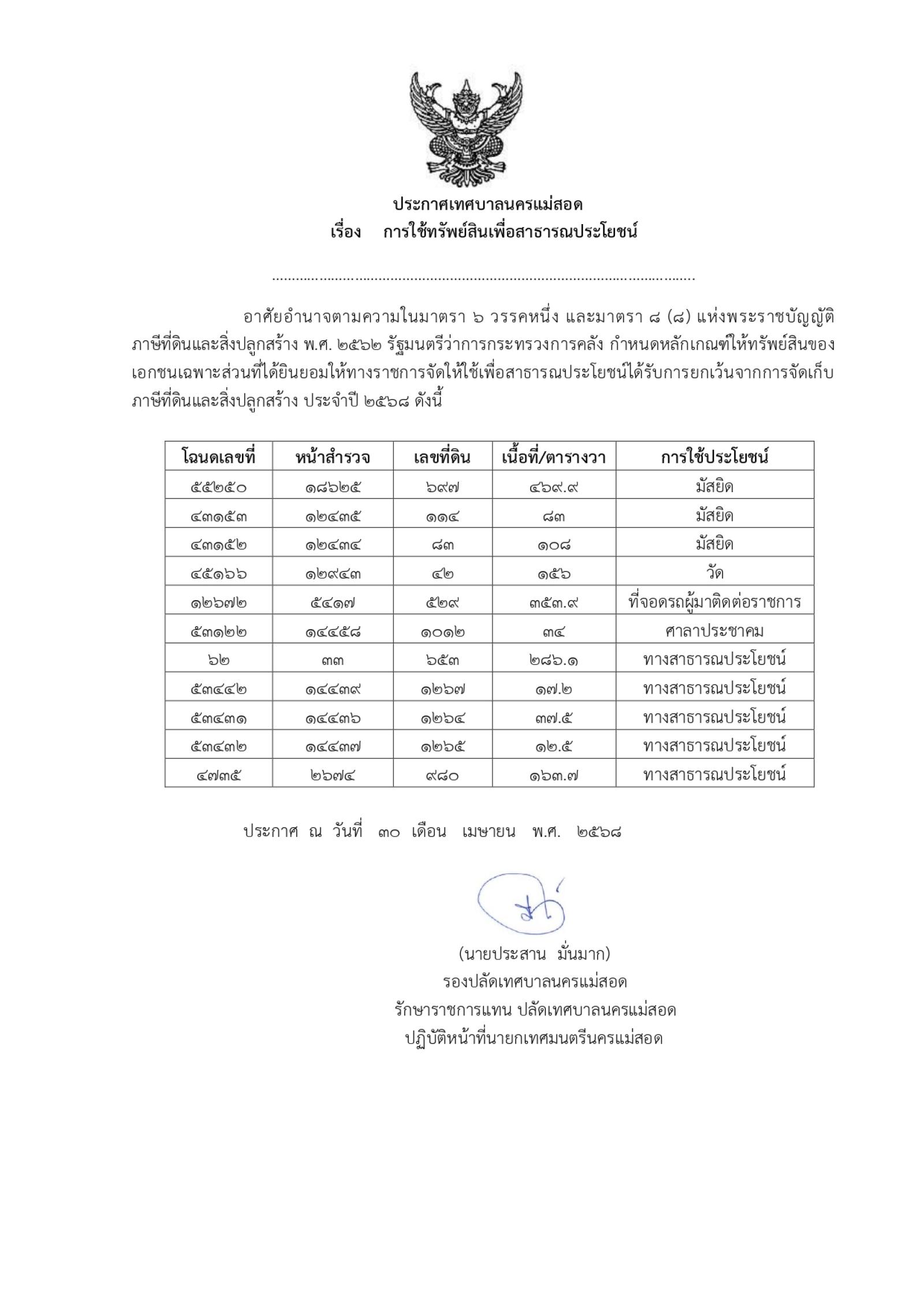 ประกาศเทศบาลนครแม่สอด เรื่อง การใช้ทรัพย์สินเพื่อสาธารณประโยชน์