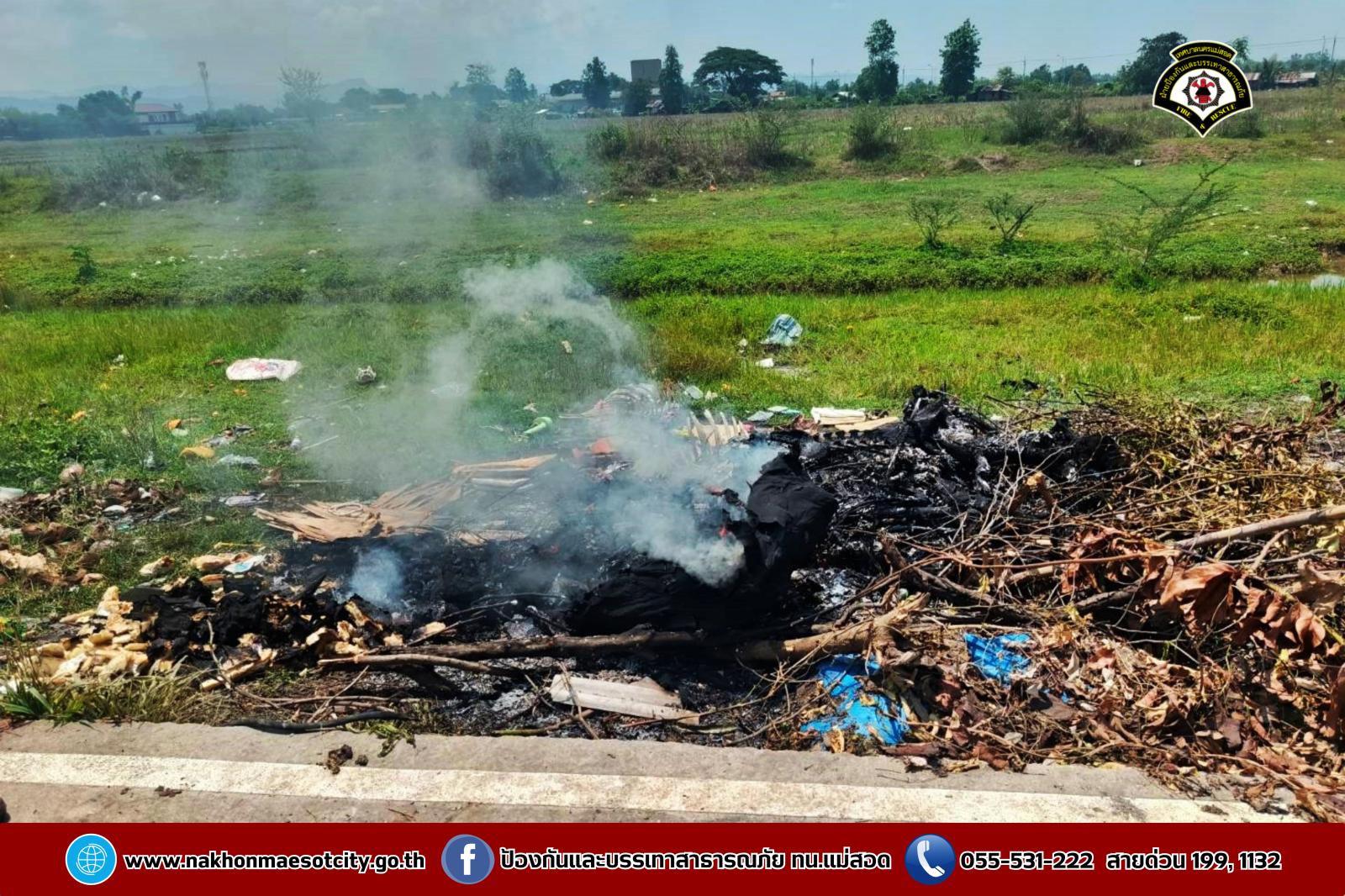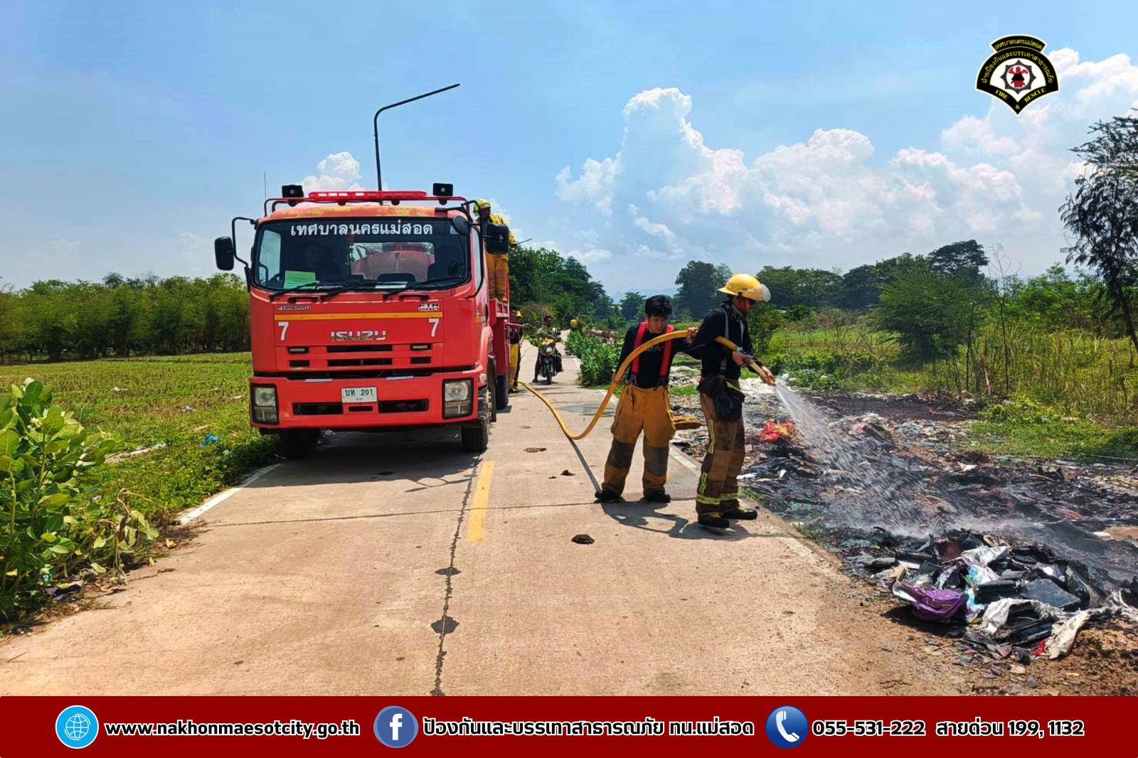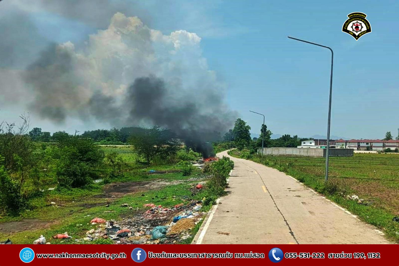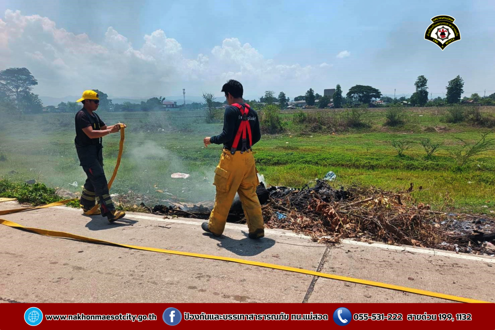 วันศุกร์ที่ 2 พฤษภาคม 2568 เวลาประมาณ 11.30 น. งานวิทยุสื่อสารและโทรศัพท์ ศูนย์เมืองฉอด ได้รับแจ้งว่าเกิดเหตุเพลิงไหม้กองขยะ บริเวณถนนเลียบคลองหม่องโคย ใกล้เคียงหมู่บ้านมั่นคง 2 ตำบลแม่สอด อำเภอแม่สอด จังหวัดตาก