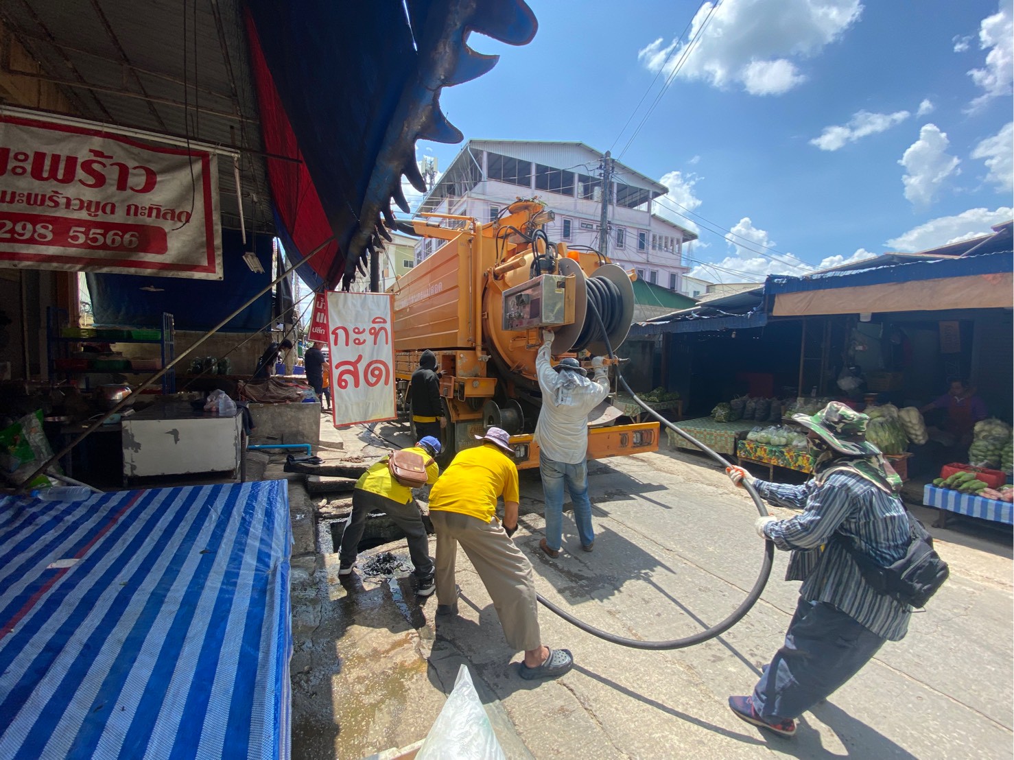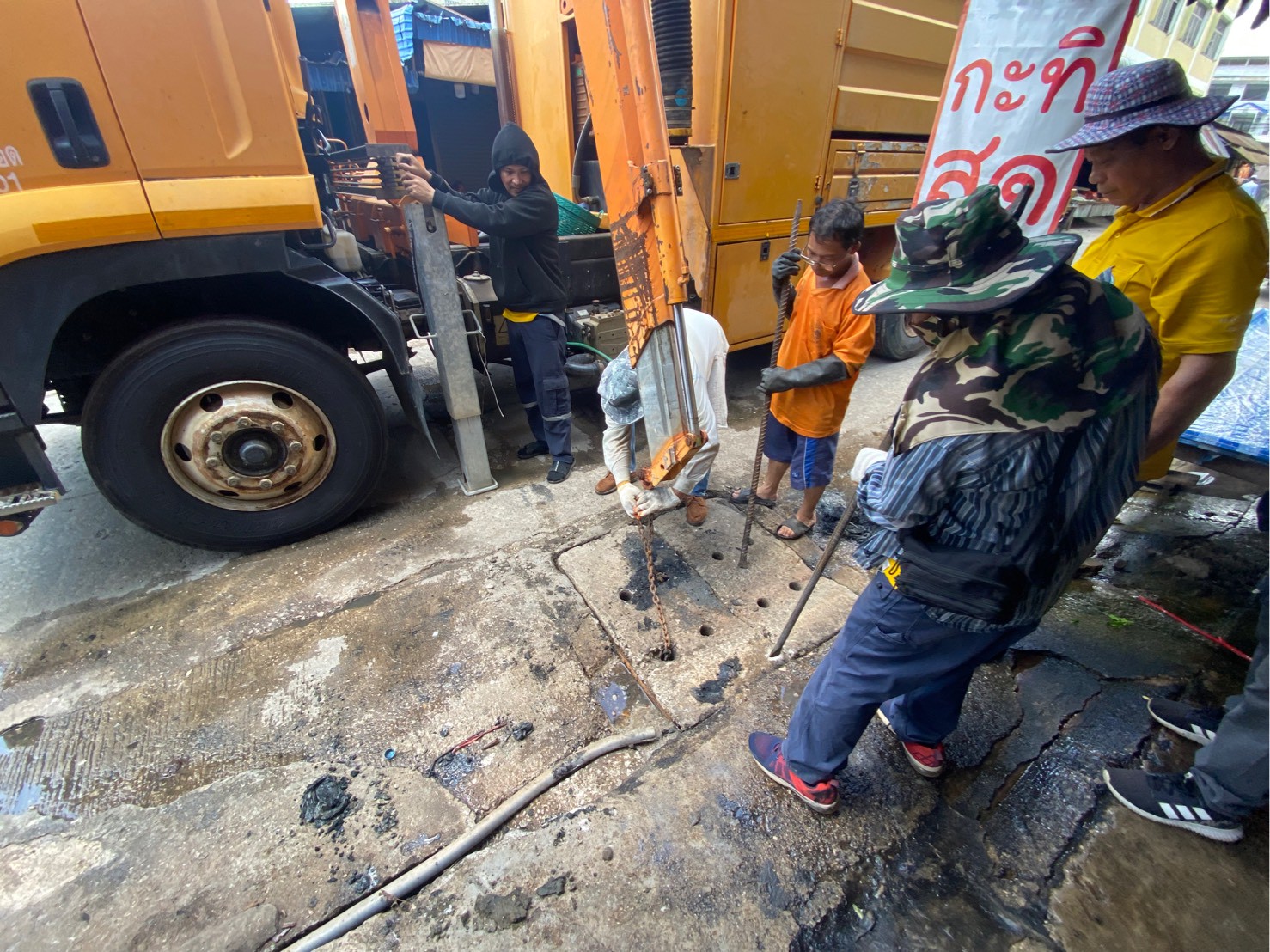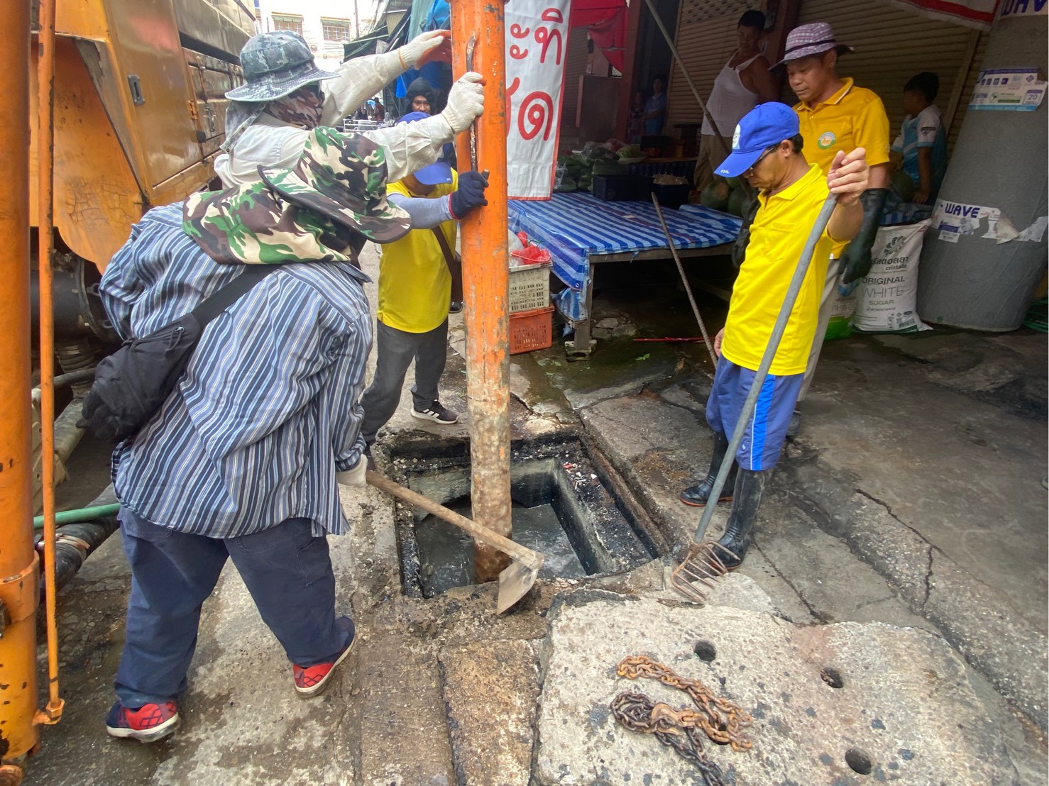 ได้เข้าดำเนินการดูดโคลนลอกท่อระบายน้ำ บริเวณหน้าร้านขายกะทิสด ตลาดพาเจริญ