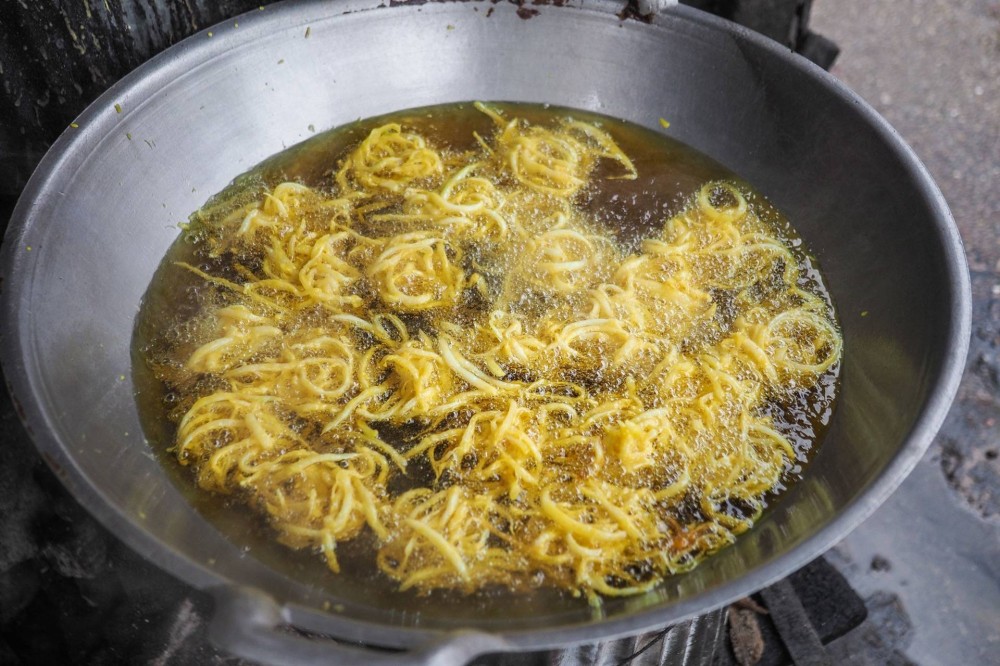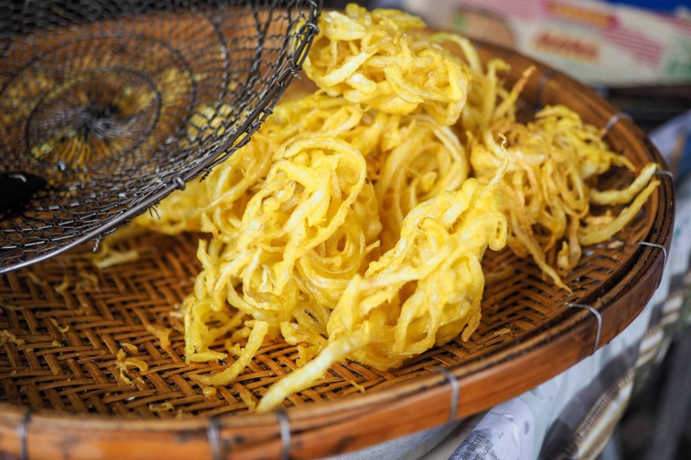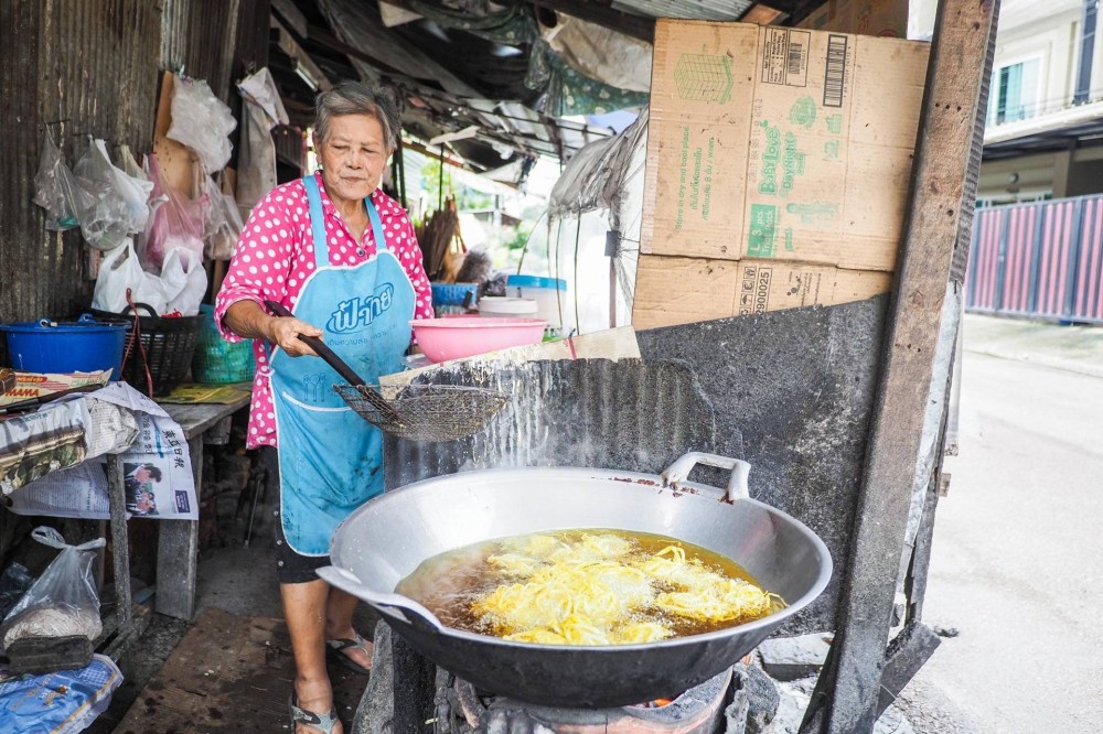 กระบองจ่อ เป็นภาษาพม่า แปลว่า ฟักทองทอด แต่ในยุคหลังมีการเสริมน้ำเต้า และมะละกอขูดเส้นชุปแป้งทอดไปด้วย น้ำจิ้มจะคล้าย ๆ กับตือคาโค ป้าจันทร์จะแยกน้ำอ้อยเคี่ยว กระเทียม น้ำมะขาม ชูรส ถั่วลิสงไว้เผื่อใครอยากมาปรุงเองให้เปรี้ยวนำ หวานนำ ได้ตามชอบเลย