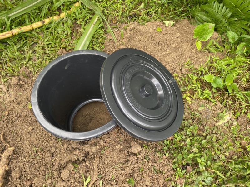 - นำถังขยะไปฝังดินที่มีความลึกประมาณ 2 ใน 3 ของถัง โดยให้ก้นถังอยู่เหนือจากก้นหลุมประมาณ 30 เซนติเมตร