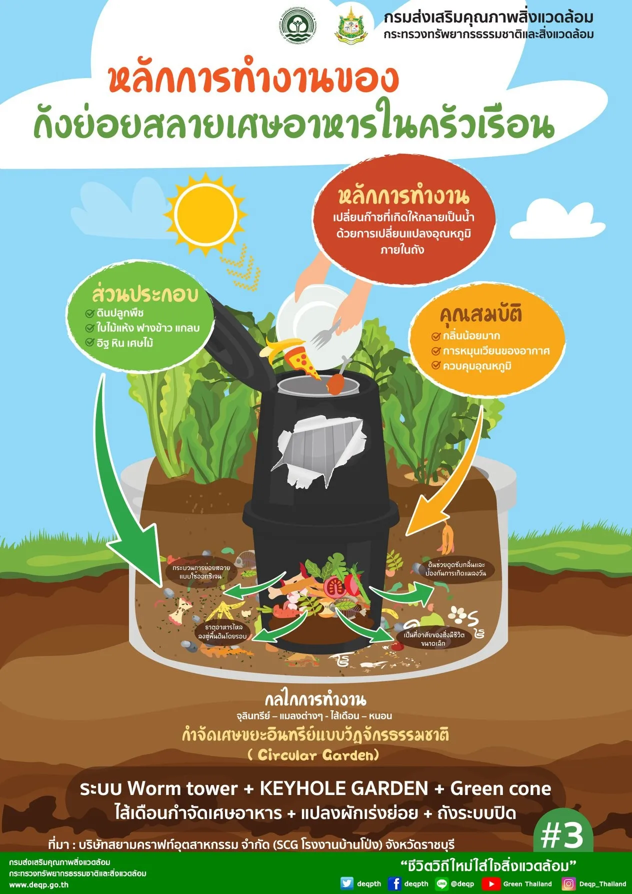 - เมื่อปริมาณเศษอาหารเต็มถัง ให้ดึงถังออก แล้วนำดินมากลบหลุมให้เรียบร้อย