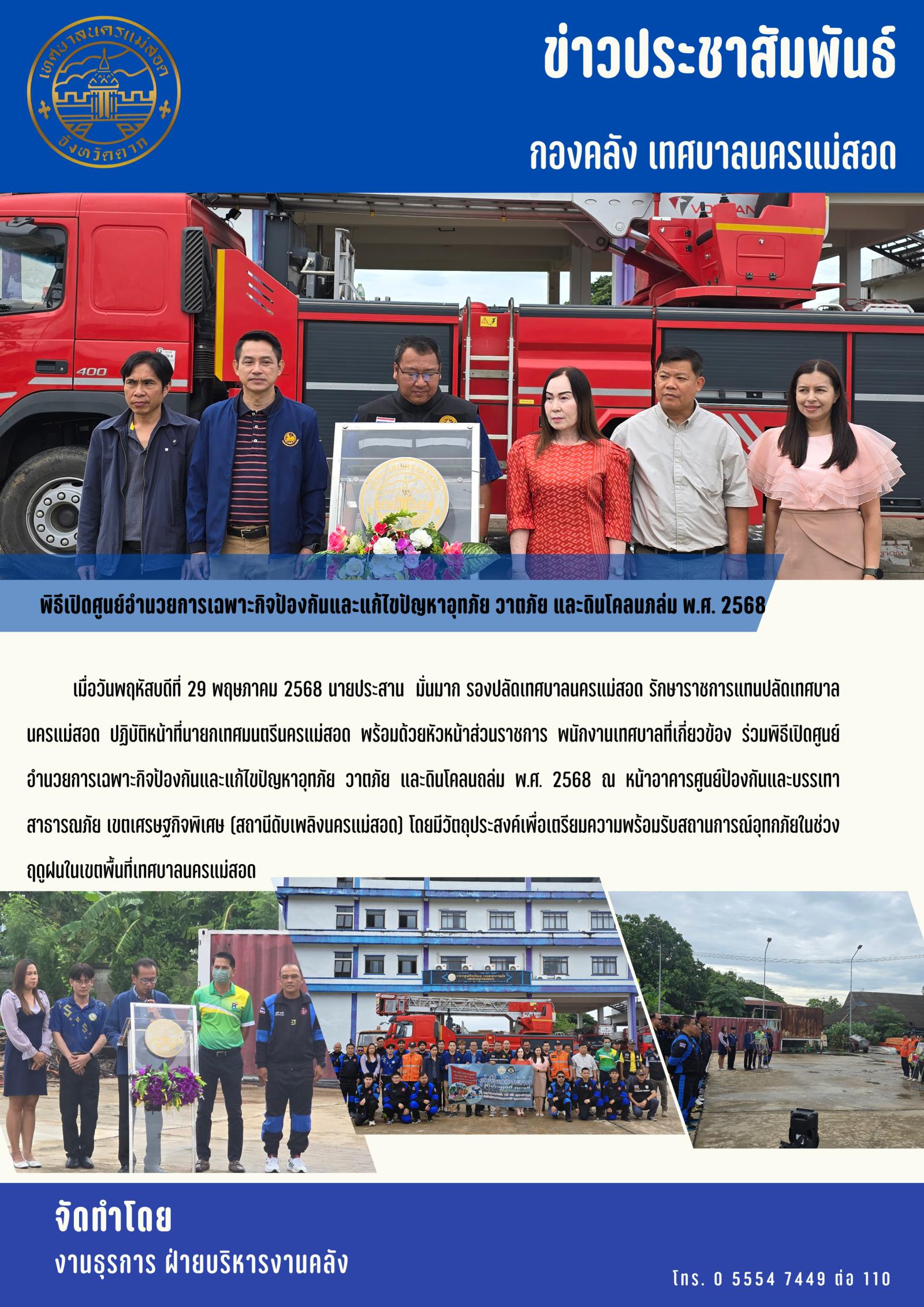 เมื่อวันพฤหัสบดีที่ 29 พฤษภาคม 2568 นายประสาน มั่นมาก รองปลัดเทศบาลนครแม่สอด รักษาราชการแทนปลัดเทศบาลนครแม่สอด ปฏิบัติหน้าที่นายกเทศมนตรีนครแม่สอด พร้อมด้วยหัวหน้าส่วนราชการ พนักงานเทศบาลที่เกี่ยวข้อง ร่วมพิธีเปิดศูนย์อำนวยการเฉพาะกิจป้องกันและแก้ไขปัญหาอุทภัย วาตภัย และดินโคลนภล่ม พ.ศ. 2568 ณ หน้าอาคารศูนย์ป้องกันและบรรเทาสาธารณภัย เขตเศรษฐกิจพิเศษ (สถานีดับเพลิงนครแม่สอด) โดยมีวัตถุประสงค์เพื่อเตรียมความพร้อมรับสถานการณ์อุทกภัยในช่วงฤดููฝนในเขตพื้นที่เทศบาลนครแม่สอด