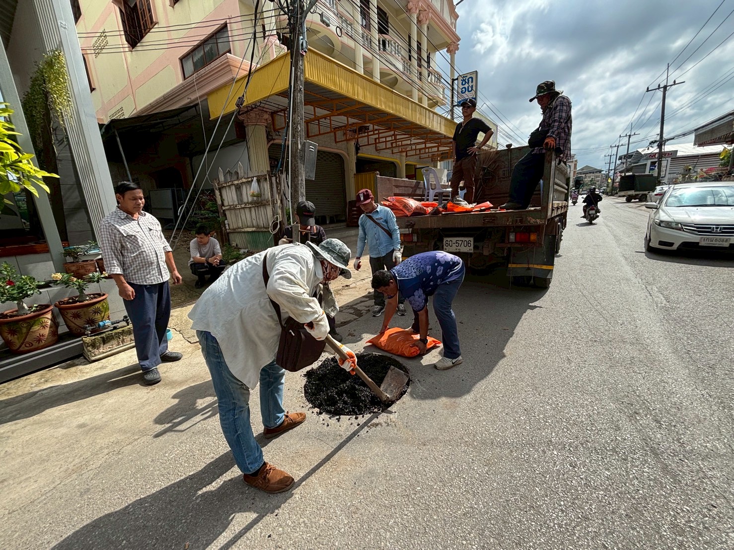 2. ได้เข้าดำเนินการลงยางมะตอยฝาท่อระบายน้ำ บริเวณหน้าร้านกัปตัน ชุมชนประชารักษ์