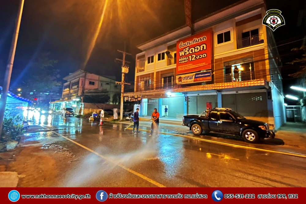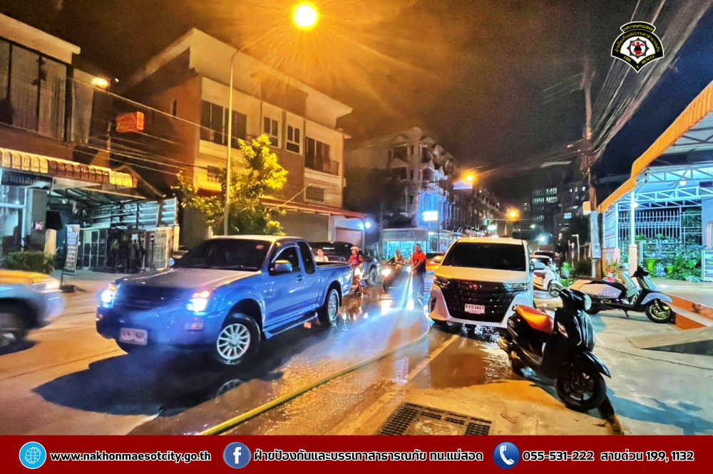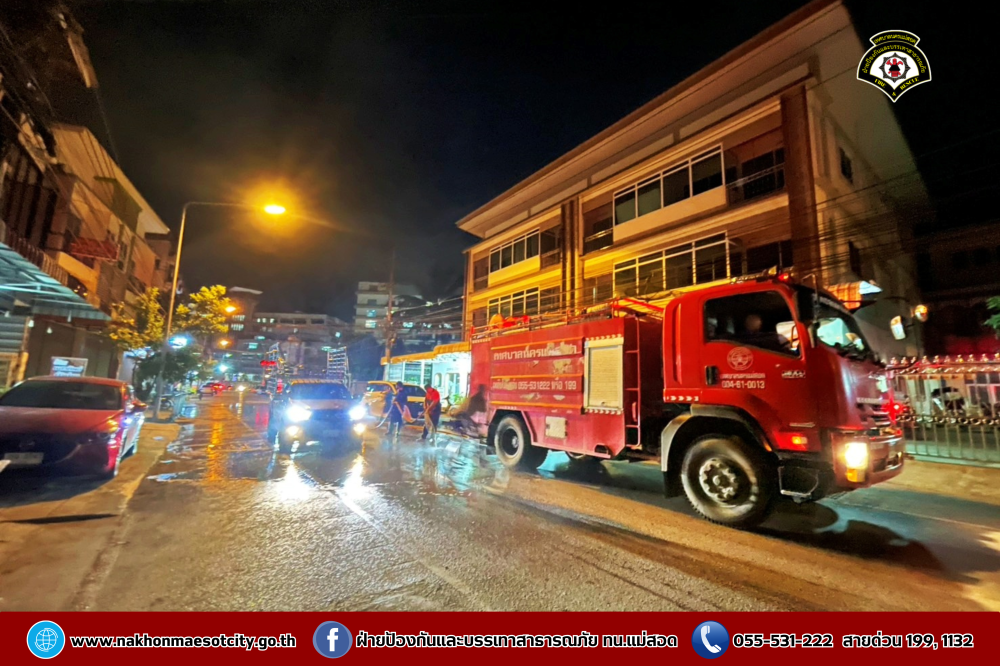 ฝ่ายป้องกันบรรเทาสาธารณภัย เทศบาลนครแม่สอด นำรถยนต์บรรทุกน้้ำดับเพลิง จำนวน 1 คัน พร้อมเจ้าหน้าที่ ออกดำเนินการฉีดล้างทำความสะอาดถนน บริเวณใกล้เคียงศรีสวัสดิ์ สาขาหน้าโรงพยาบาลแม่สอด ถนนแม่สอด-แม่ตาว อำเภอแม่สอด จังหวัดตาก เพื่อป้องกันการเกิดอุบัติเหตุถนนลื่น และเพื่อเป็นการรักษาความสะอาดพื้นผิวการจราจรต่อไป