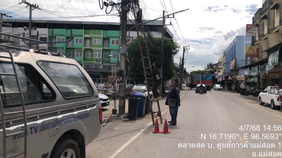 ว่าที่พันตรี ดร.ไพฑูรย์ ปริญญาธรรมกุล ผู้อำนวยการกองยุทธศาสตร์และงบประมาณ มอบหมายให้ เจ้าหน้าที่ช่างเคเบิ้ลทีวีเพื่อการศึกษา เจ้าหน้าที่ฝ่ายวิเทศสัมพันธ์ กองยุทธศาสตร์และงบประมาณ ลงพื้นที่ดำเนินการตามคำร้องซ่อมแซมสายเคเบิ้ลทีวีเพื่อการศึกษาเทศบาลนครแม่สอด ท่ารถแม่ระมาด ชุมชนชุมพลพัฒนา เพื่อให้ประชาชนชุมชนดังกล่าวสามารถรับบริการเคเบิ้ลทีวีเพื่อการศึกษาเทศบาลนครแม่สอดได้