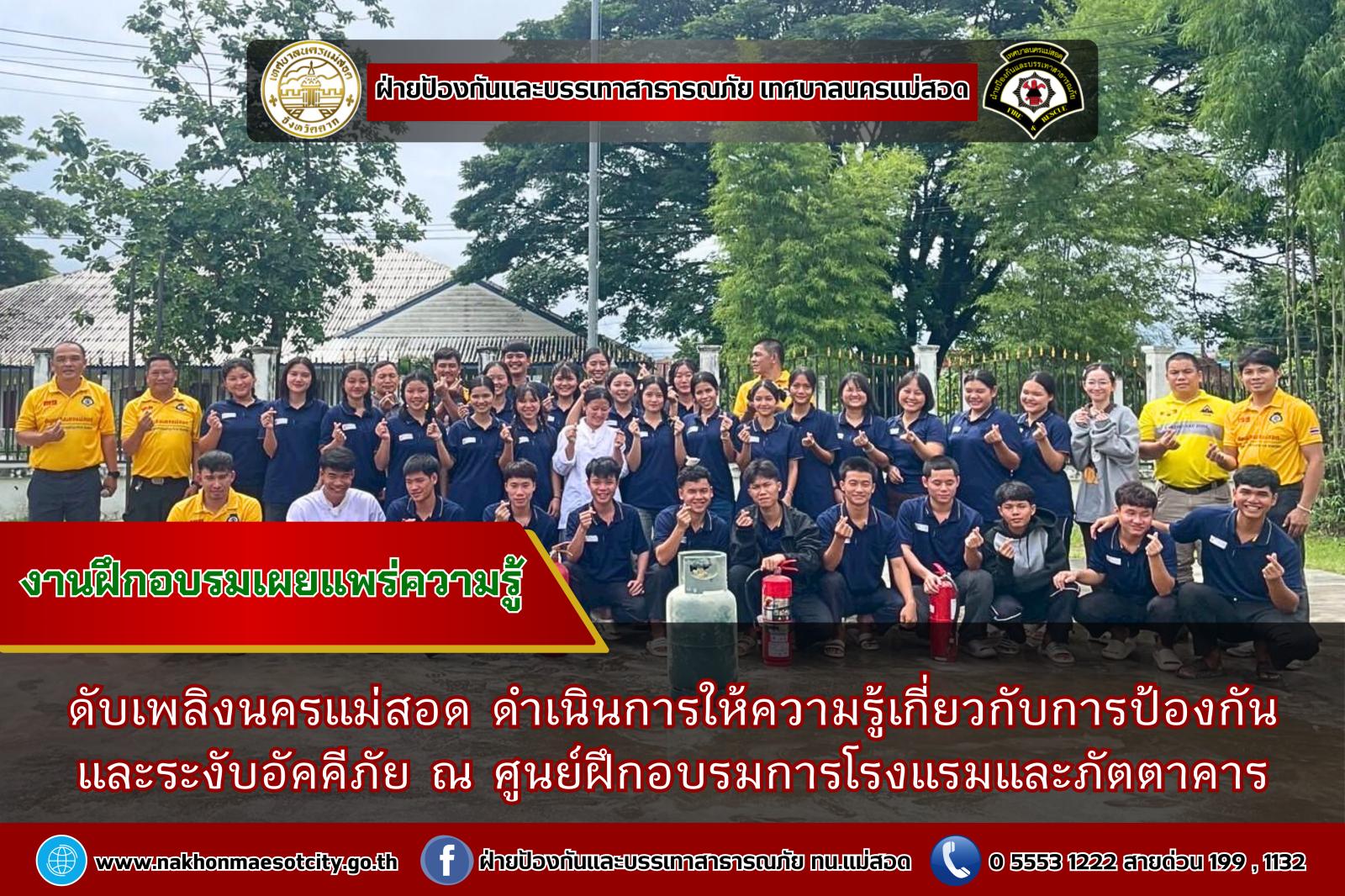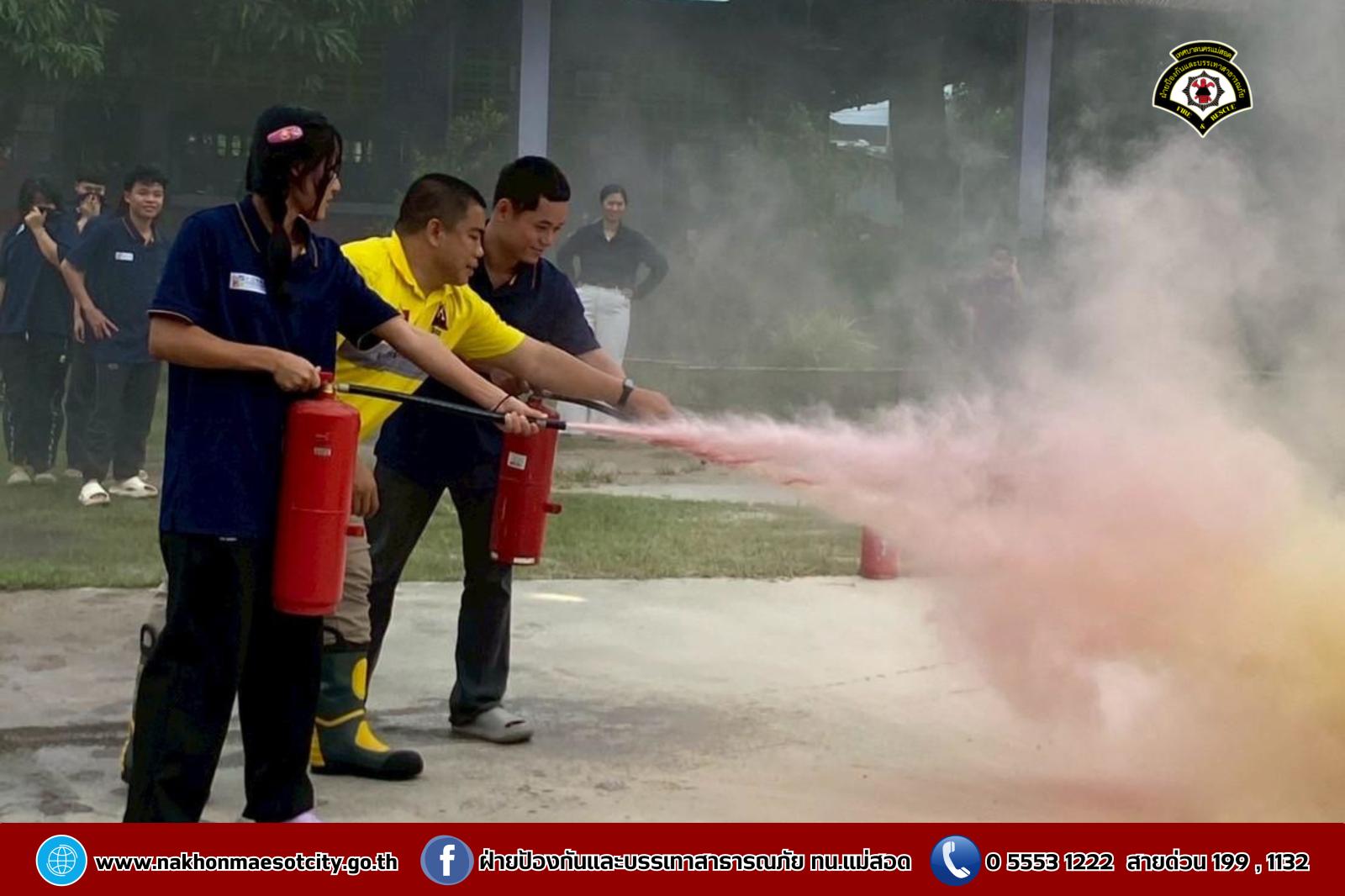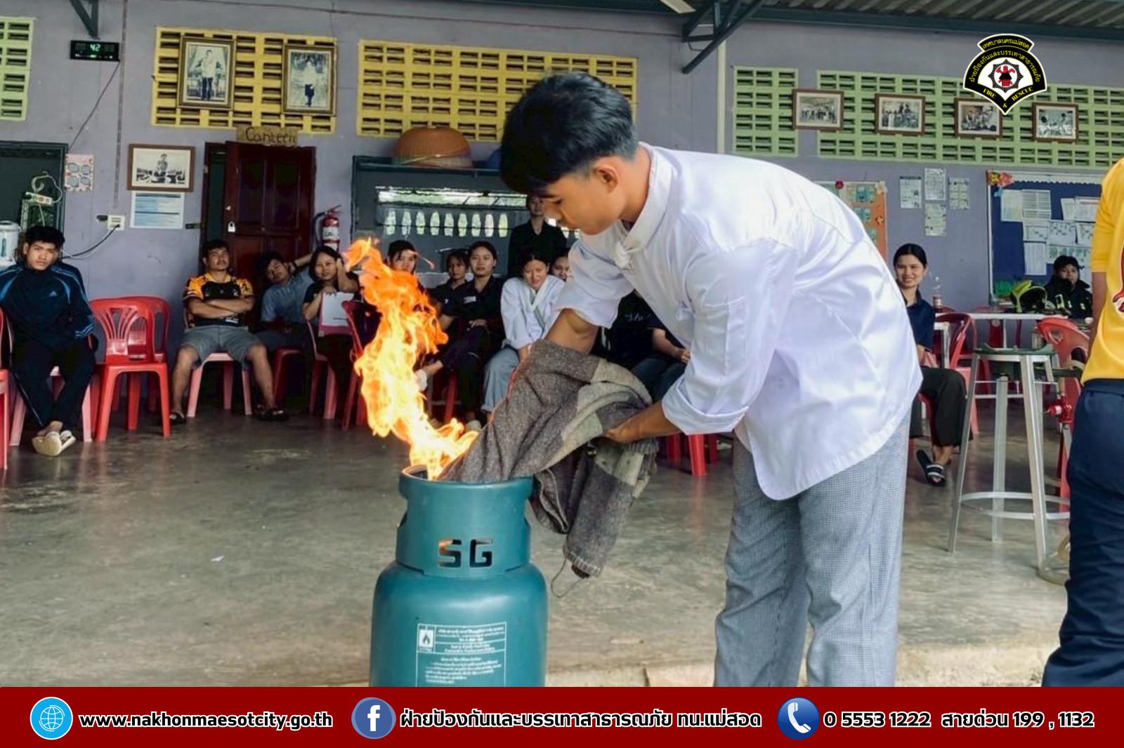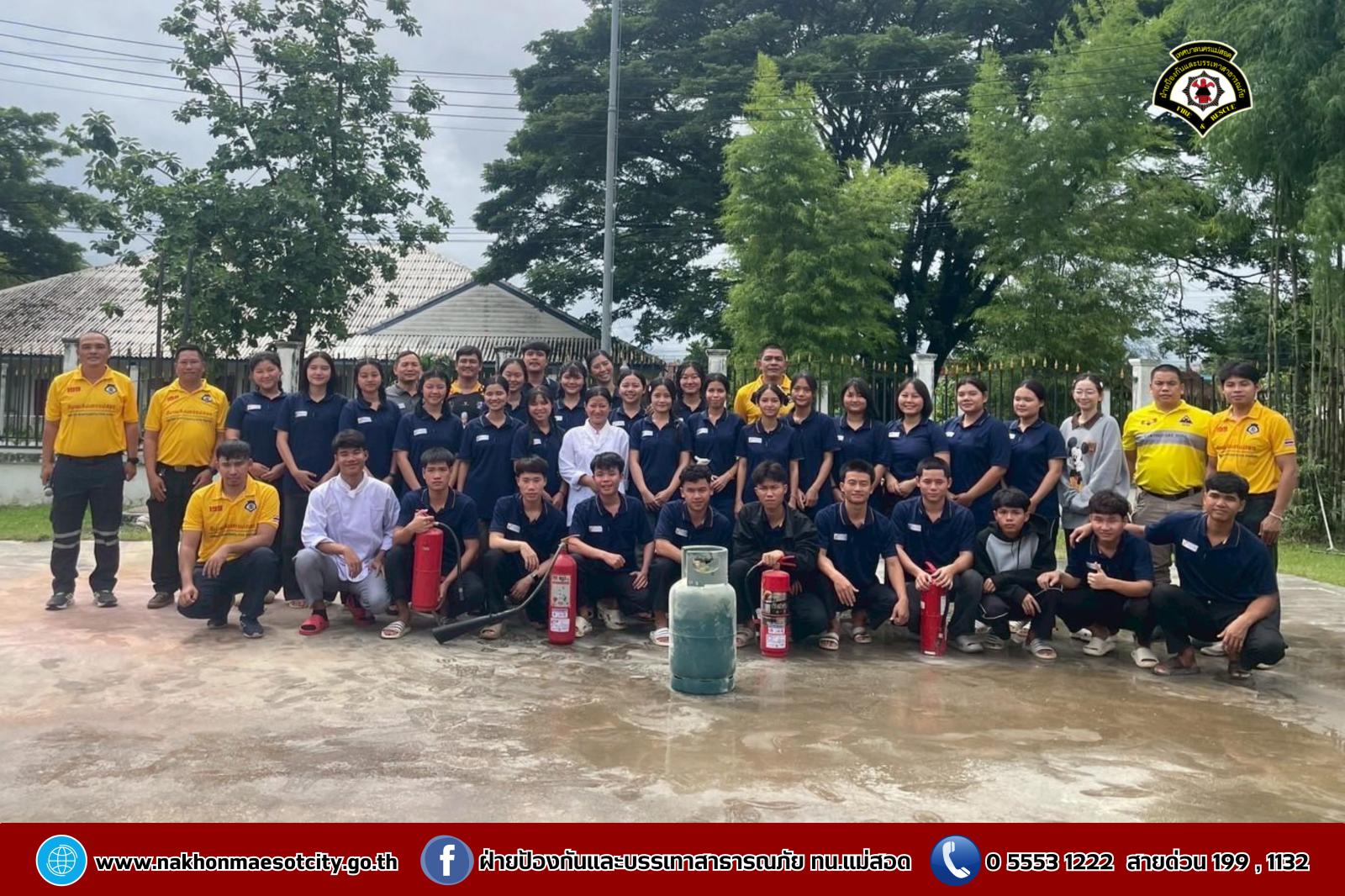 นายกุล เครือวีระ นายกเทศมนตรีนครแม่สอด มอบหมายให้ นายมนูศักดิ์ จันทร์โต นักป้องกันและบรรเทาสาธารณภัยชำนาญการ รักษาราชการแทน หัวหน้าฝ่ายป้องกันและบรรเทาสาธารณภัย พร้อมคณะวิทยากร ออกดำเนินการให้ความรู้เกี่ยวกับการป้องกันและระงับอัคคีภัย โดยมีคณะครู และนักเรียนที่เข้าร่วม จำนวน 60 คน เพื่อให้สามารถรับมือกับสถานการณ์ไฟไหม้และช่วยเหลือผู้อื่นได้อย่างถูกต้องในกรณีฉุกเฉิน