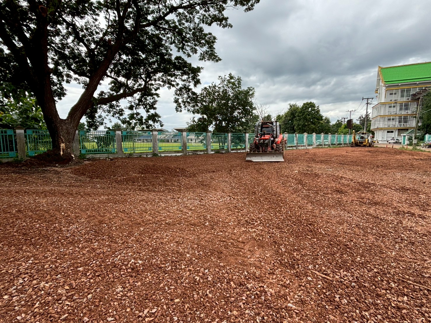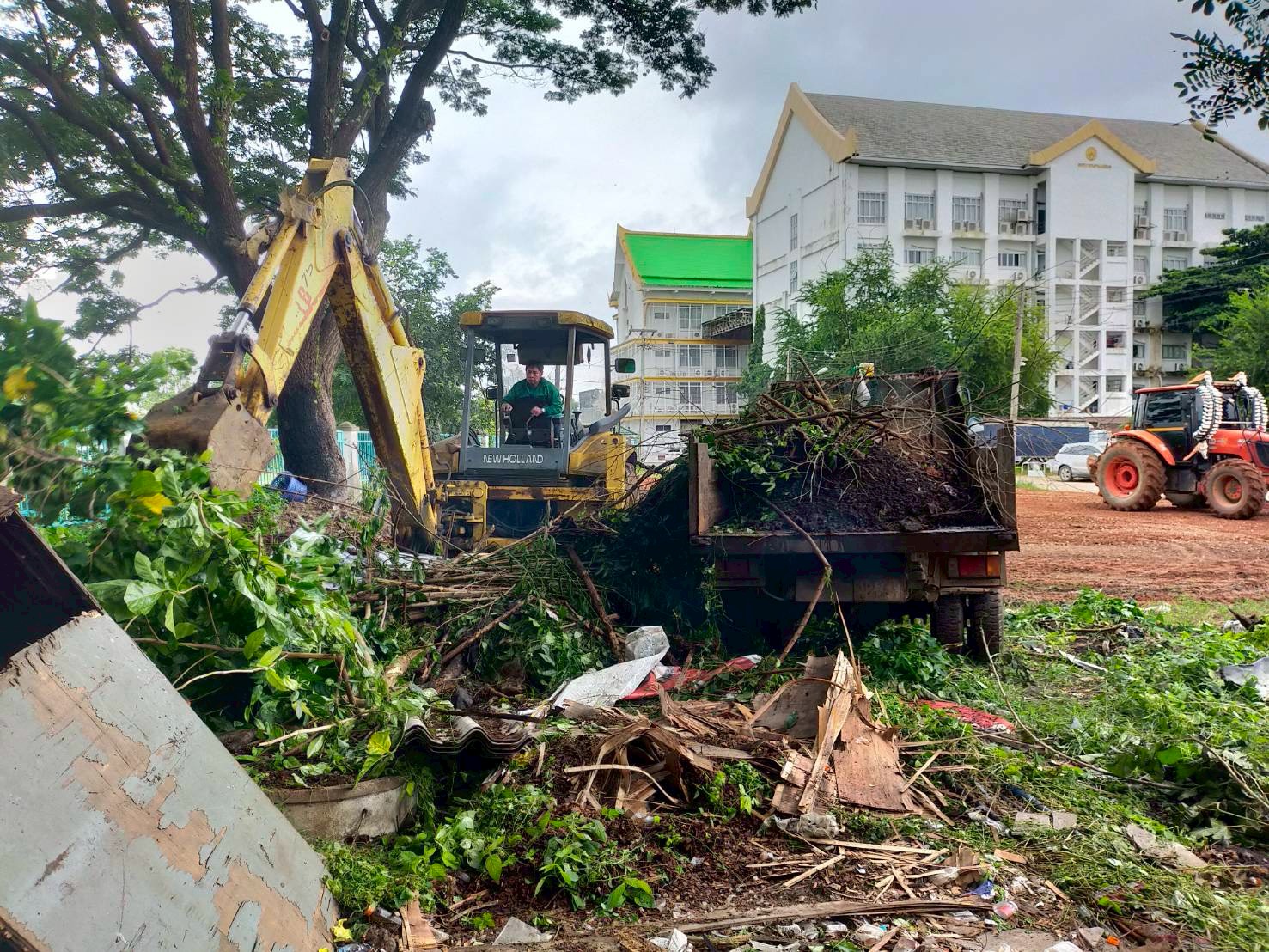 3. ได้เข้าดำเนินการขนกิ่งไม้ / ไถปรับดิน ทำลานจอดรถ บริเวณหลังสำนักงานเทศบาลนครแม่สอด