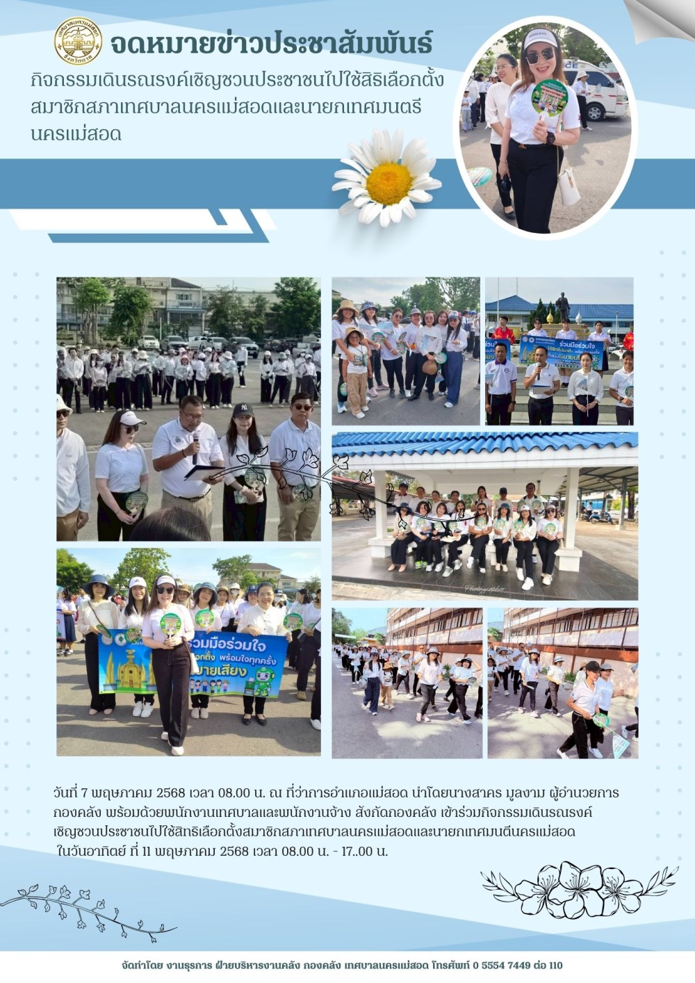 วันที่ 7 พฤษภาคม 2568 เวลา 08.00 น. ณ ที่ว่าการอำเเภอแม่สอด นำโดยนางสาคร มูลงาม ผู้อำนวยการกองคลัง พร้อมด้วยพนักงานเทศบาลและพนักงานจ้าง สังกัดกองคลัง เข้าร่วมกิจกรรมเดินรณรงค์เชิญชวนประชาชนไปใช้สิทธิเลือกตั้งสมาชิกสภาเทศบาลนครแม่สอดและนายกเทศมนตีนครแม่สอด ในวันอาทิตย์ ที่ 11 พฤษภาคม 2568 เวลา 08.00 น. - 17.00 น.