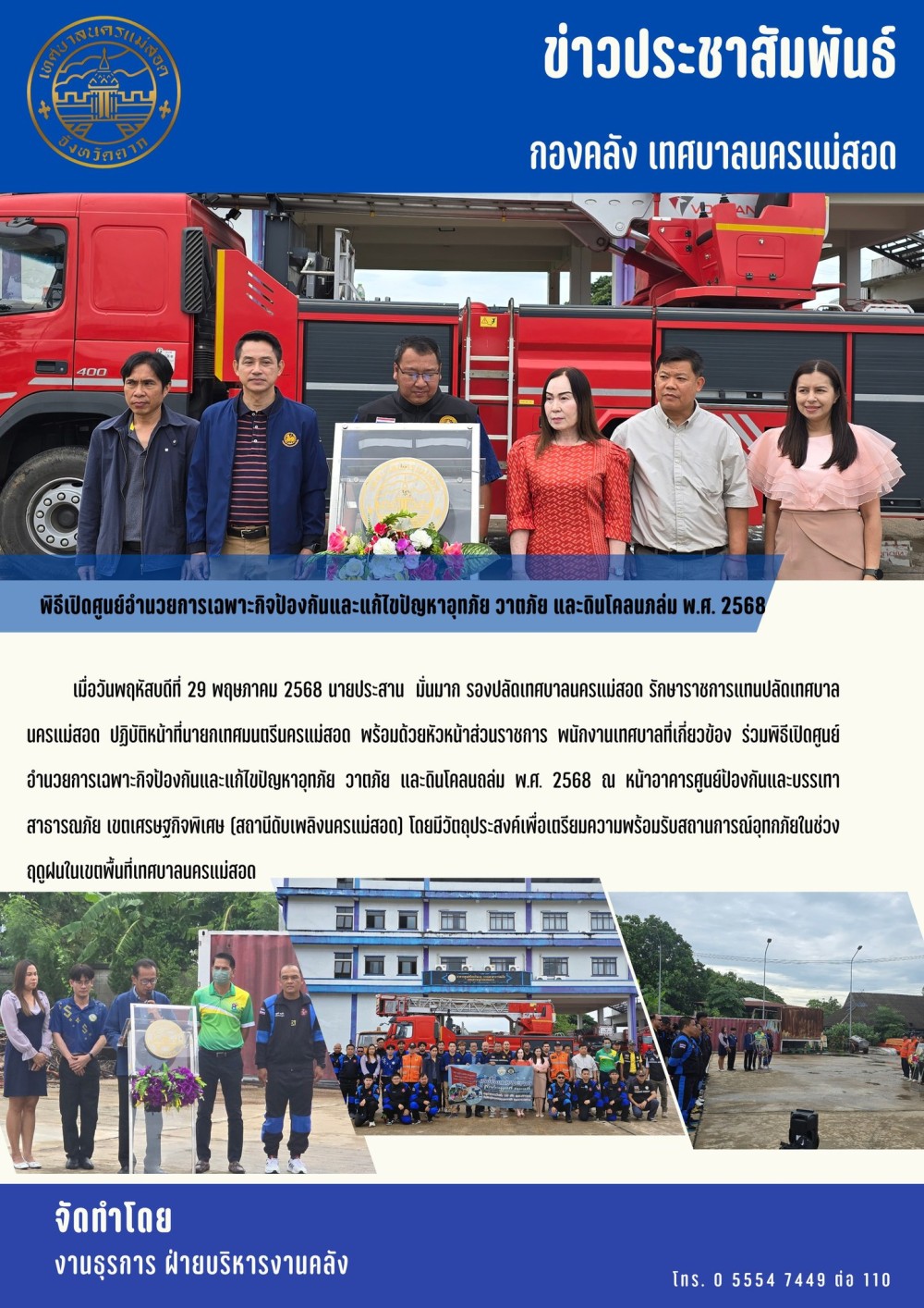 วันพฤหัสบดีที่ 29 พฤษภาคม 2568 นายประสาน มั่นมาก รองปลัดเทศบาลนครแม่สอด รักษาราชการแทนปลัดเทศบาลนครแม่สอด ปฏิบัติหน้าที่นายกเทศมนตรีนครแม่สอด พร้อมด้วยหัวหน้าส่วนราชการ พนักงานเทศบาลที่เกี่ยวข้อง ร่วมพิธีเปิดศูนย์อำนวยการเฉพาะกิจป้องกันและแก้ไขปัญหาอุทภัย วาตภัย และดินโคลนภล่ม พ.ศ. 2568 ณ หน้าอาคารศูนย์ป้องกันและบรรเทาสาธารณภัย เขตเศรษฐกิจพิเศษ (สถานีดับเพลิงนครแม่สอด) โดยมีวัตถุประสงค์เพื่อเตรียมความพร้อมรับสถานการณ์อุทกภัยในช่วงฤดููฝนในเขตพื้นที่เทศบาลนครแม่สอด