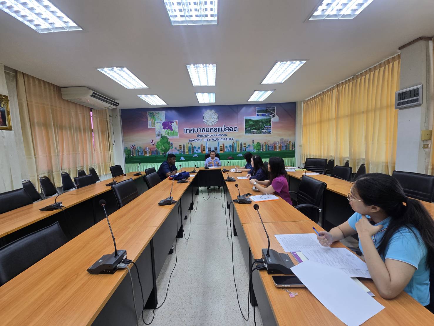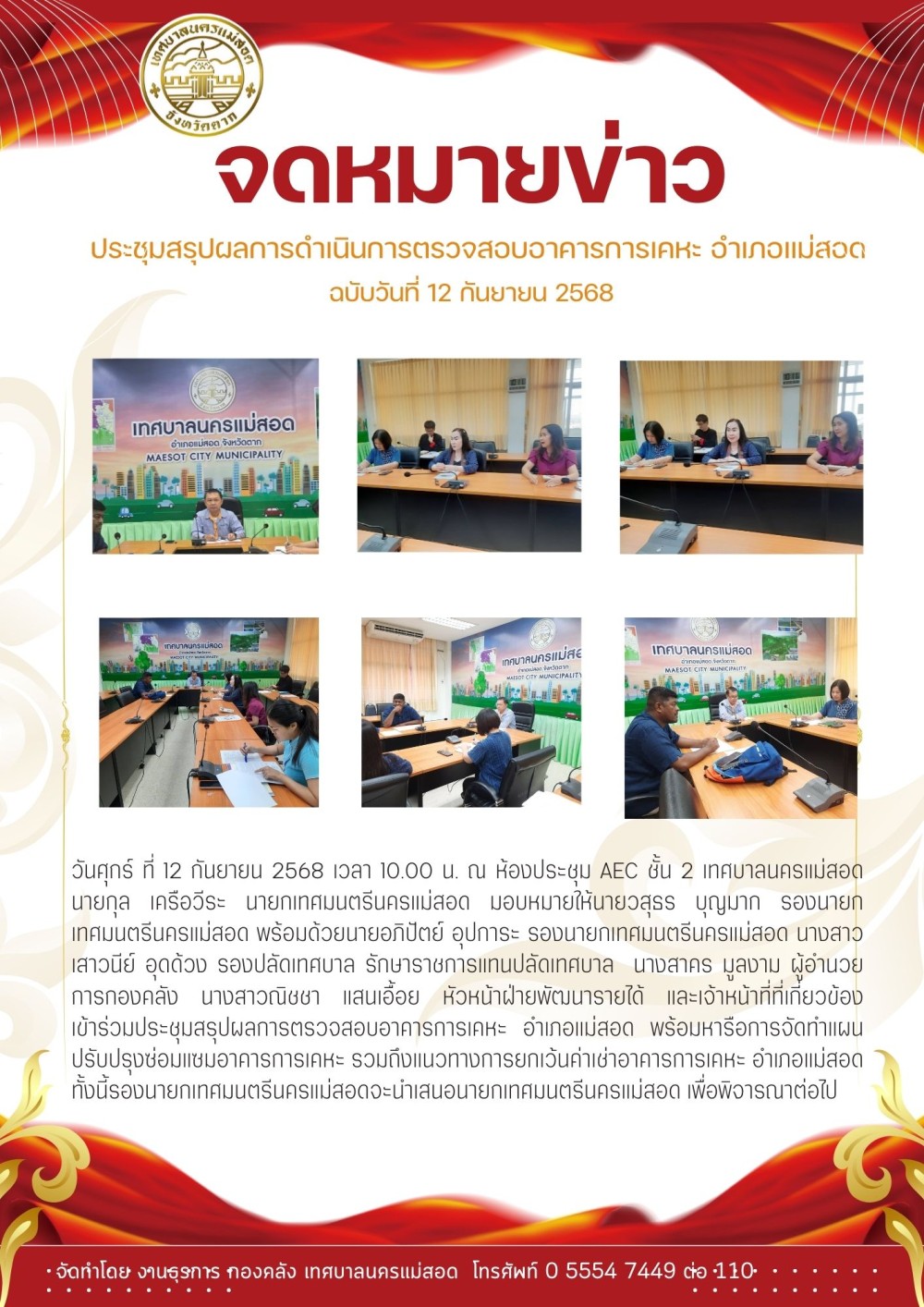 วันศุกร์ ที่ 12 กันยายน 2568 เวลา 10.00 น. ณ ห้องประชุม AEC ชั้น 2 เทศบาลนครแม่สอด นายกุล เครือวีระ นายกเทศมนตรีนครแม่สอด มอบหมายให้นายวสุธร บุญมาก รองนายกเทศมนตรีนครแม่สอด พร้อมด้วยนายอภิปัตย์ อุปการะ รองนายกเทศมนตรีนครแม่สอด นางสาวเสาวนีย์ อุดด้วง รองปลัดเทศบาล รักษาราชการแทนปลัดเทศบาล นางสาคร มูลงาม ผู้อำนวยการกองคลัง นางสาวณิชชา แสนเอื้อย หัวหน้าฝ่ายพัฒนารายได้ และเจ้าหน้าที่ที่เกี่ยวข้อง เข้าร่วมประชุมสรุปผลการตรวจสอบอาคารการเคหะ อำเภอแม่สอด พร้อมหารือการจัดทำแผนปรับปรุงซ่อมแซมอาคารการเคหะ รวมถึงแนวทางการยกเว้นค่าเช่าอาคารการเคหะ อำเภอแม่สอด ทั้งนี้รองนายกเทศมนตรีนครแม่สอดจะนำเสนอนายกเทศมนตรีนครแม่สอด เพื่อพิจารณาต่อไป