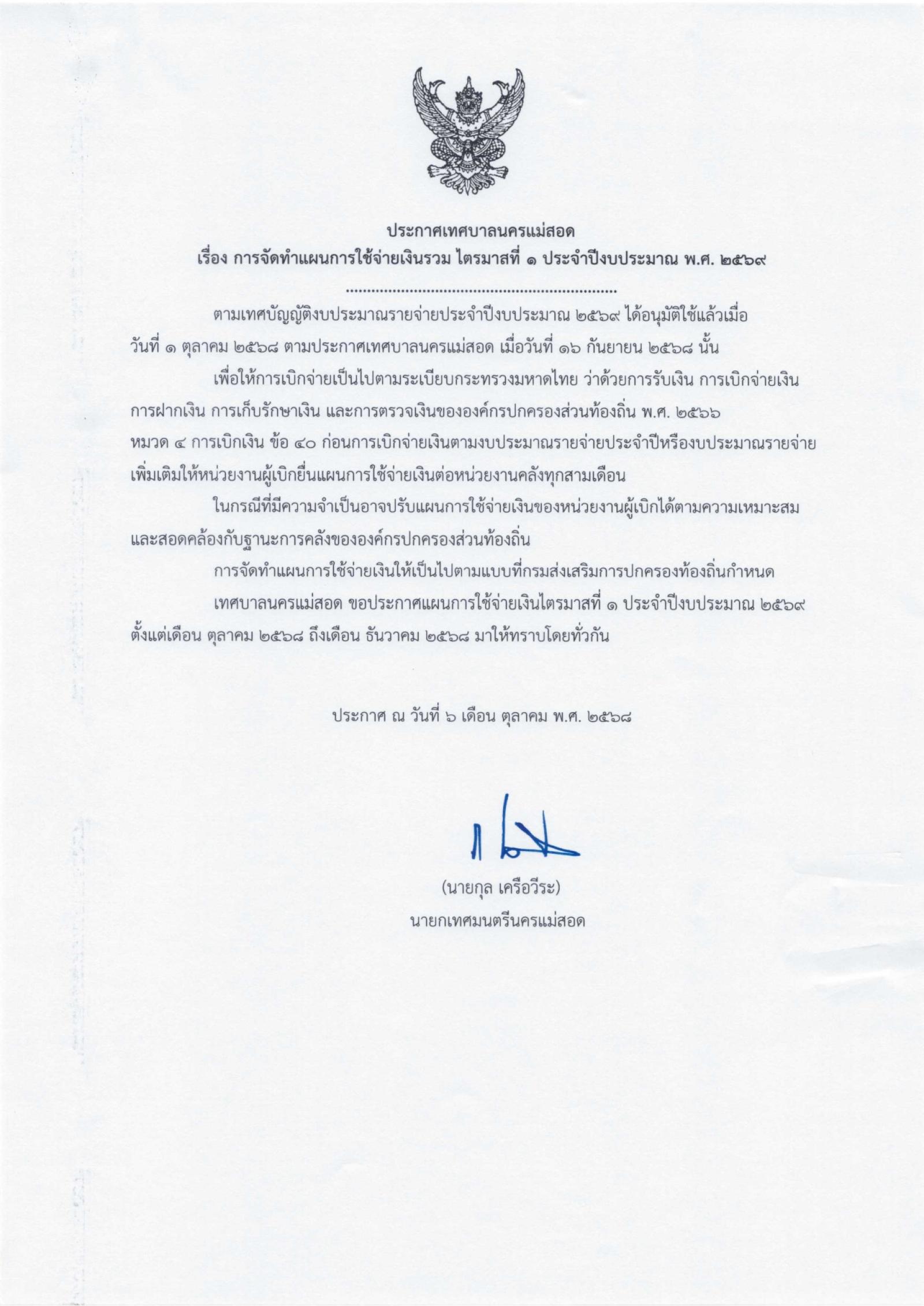 ประกาศเทศบาลนครแม่สอด เรื่อง การจัดทำแผนการใช้จ่ายเงินรวม ไตรมาสที่ 1 ประจำปีงบประมาณ พ.ศ. 2569