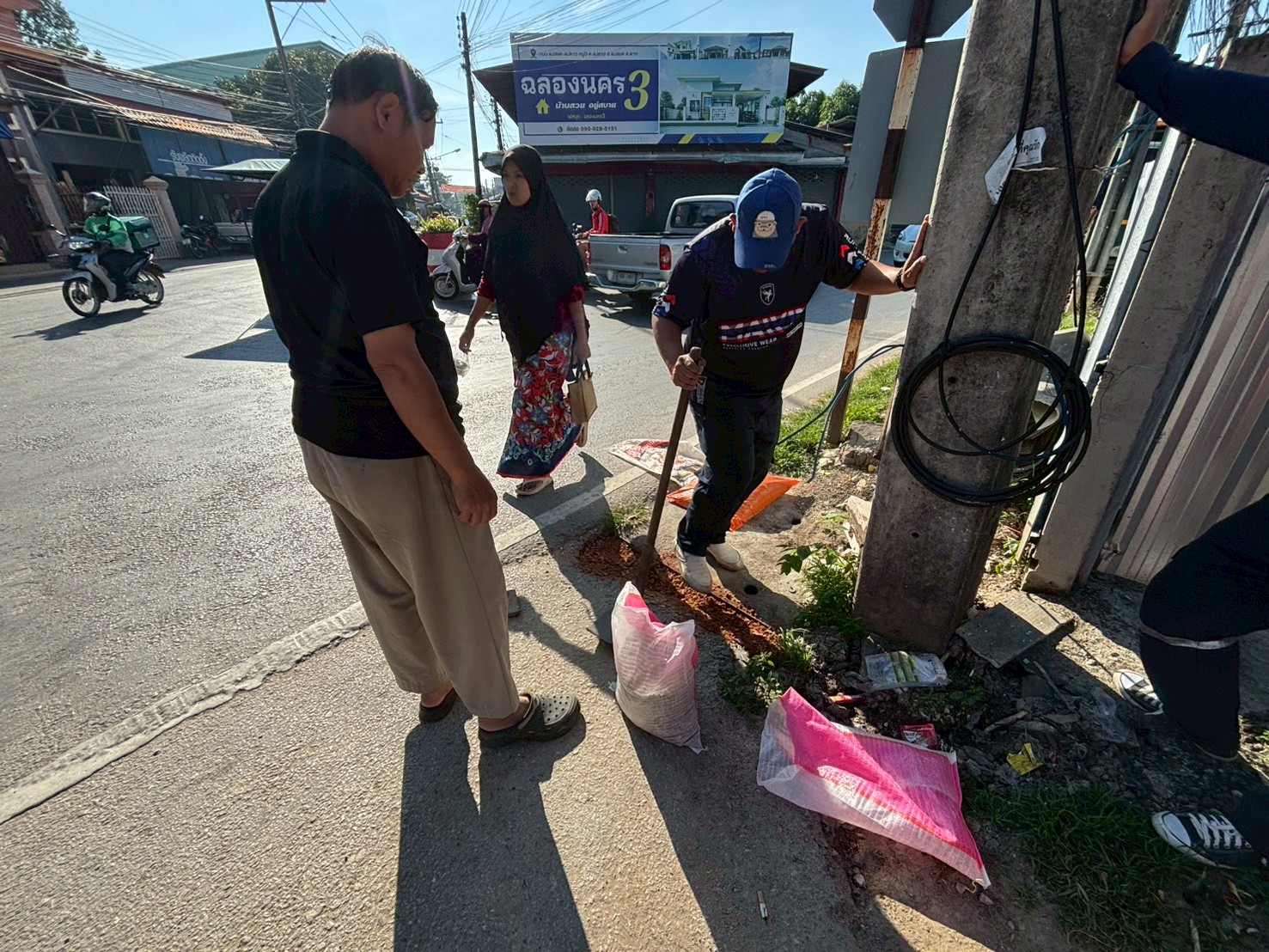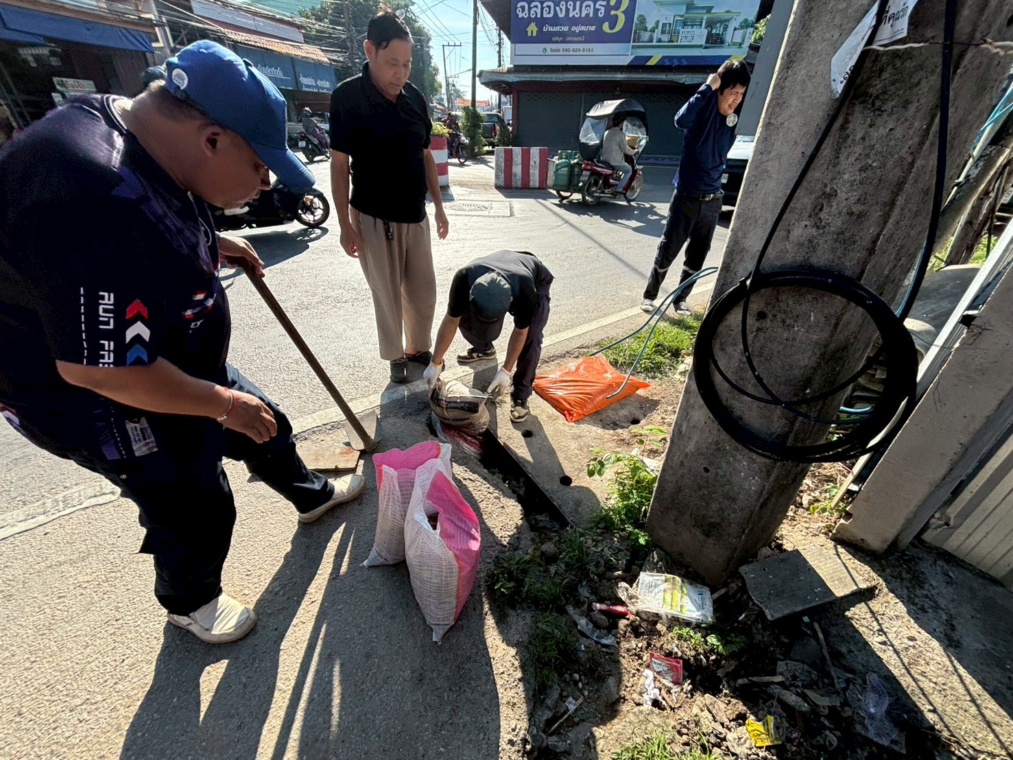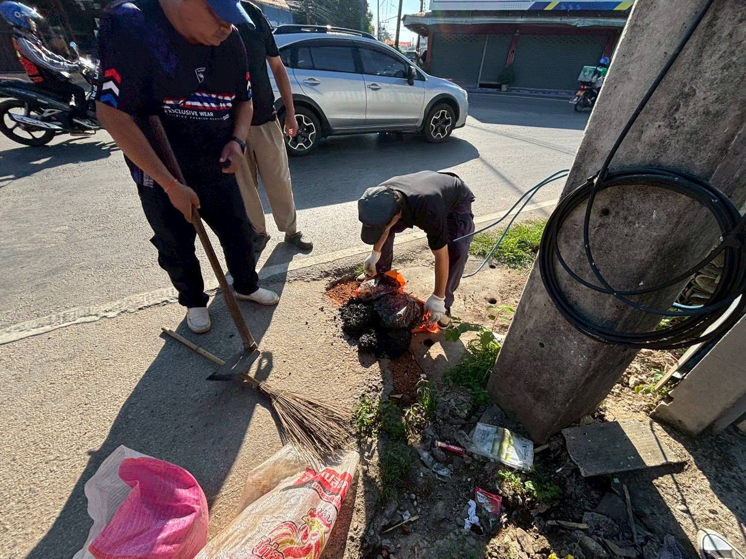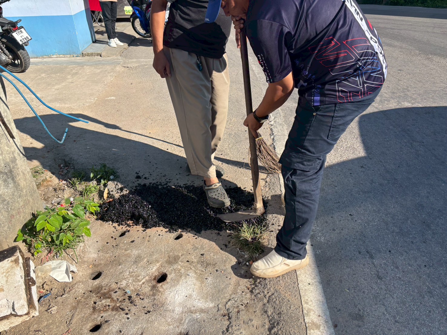 2. ได้เข้าดำเนินการลงยางมะตอยขอบฝ่าท่อระบายน้ำ บริเวณสามแยกร้านโรตีร้อยชั้น