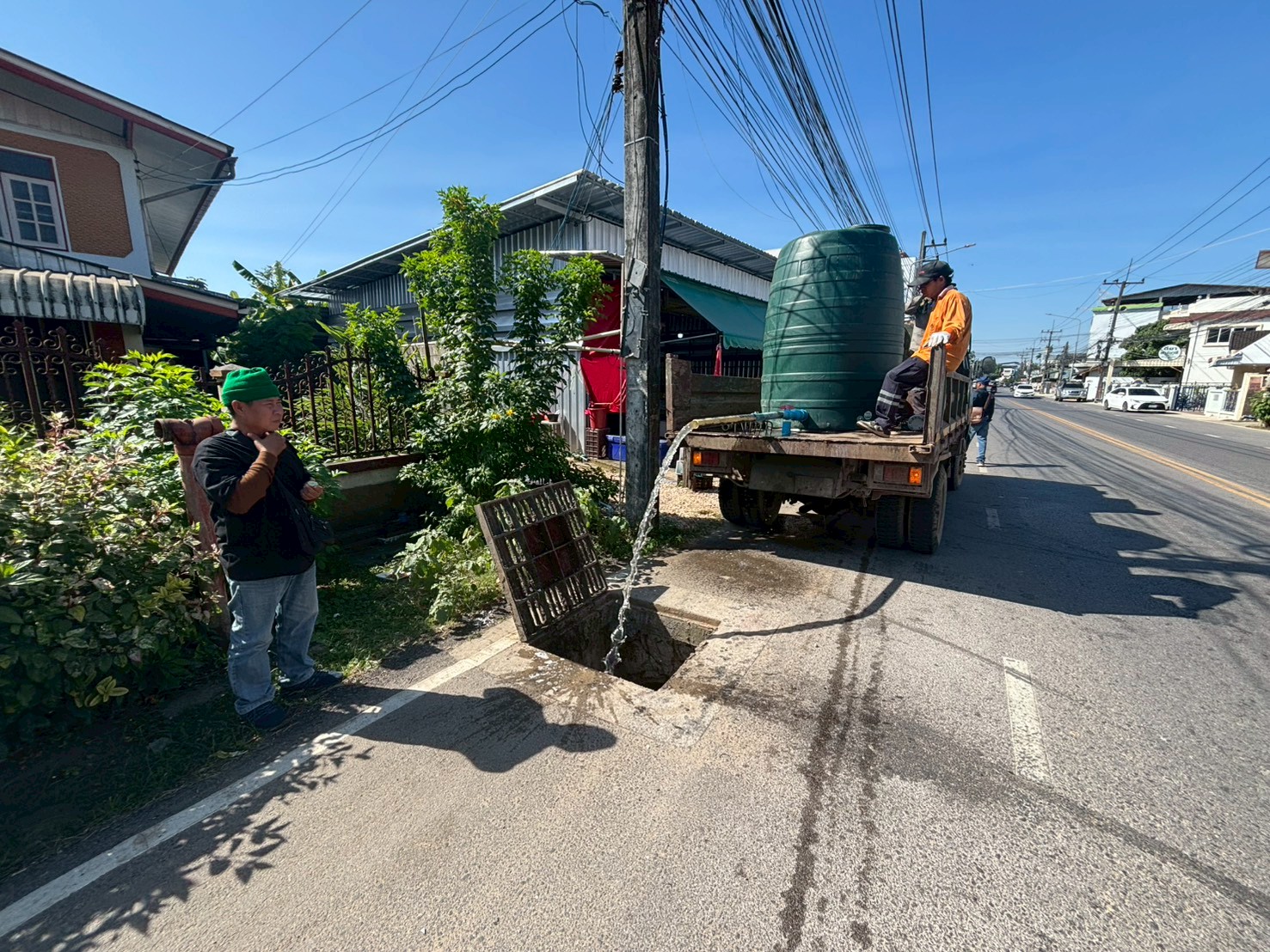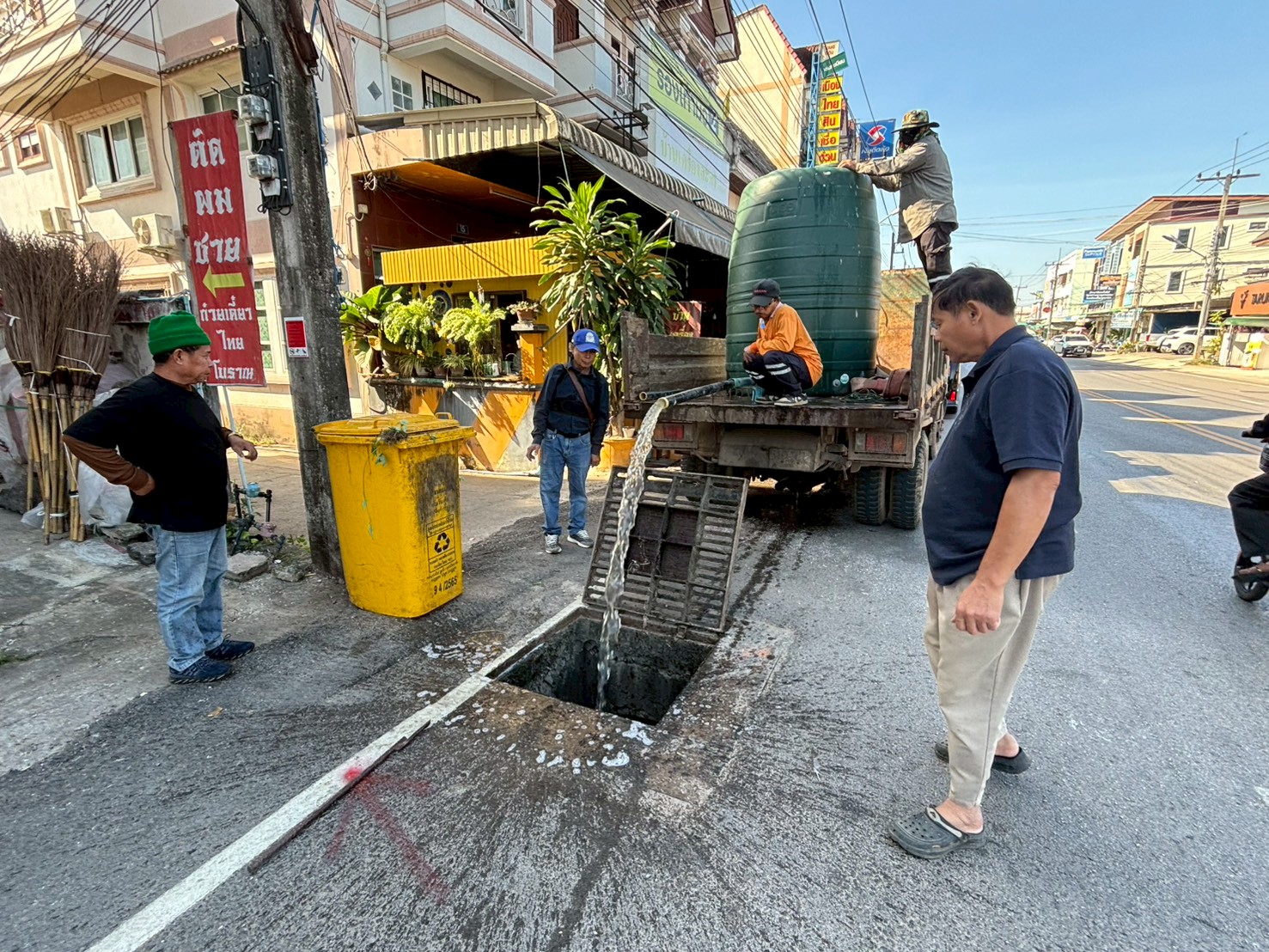 2. ได้เข้าดำเนินการลงน้ำหมักชีวภาพ EM เพื่อแก้ไขปัญหาน้ำเน่าเสียและส่งกลิ่นเหม็น บริเวณบ่อพักหน้าร้านเซเว่นบ้านเหนือ / ร้านไทยแสงทองบ้านเหนือ จุดละ 2,000 ลิตร