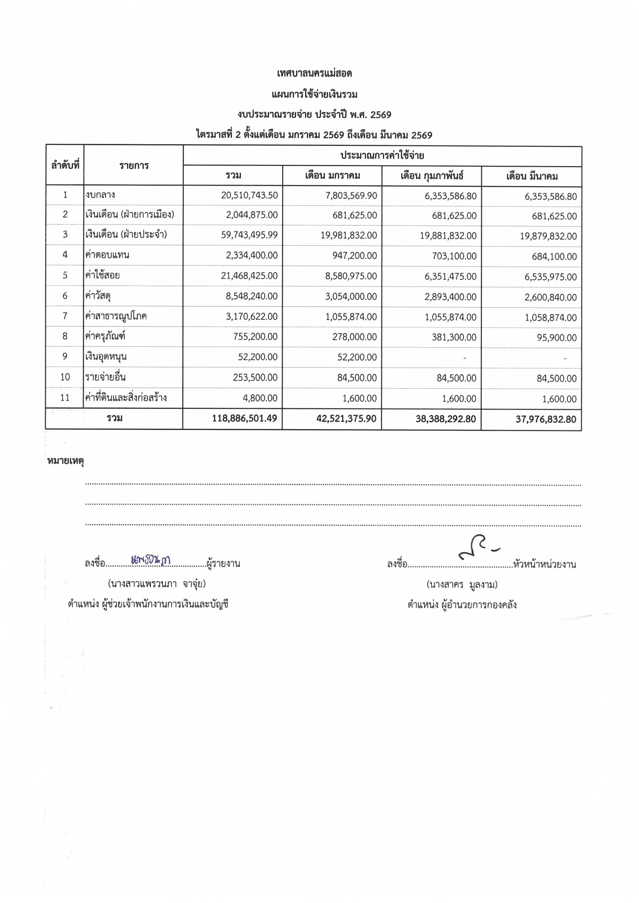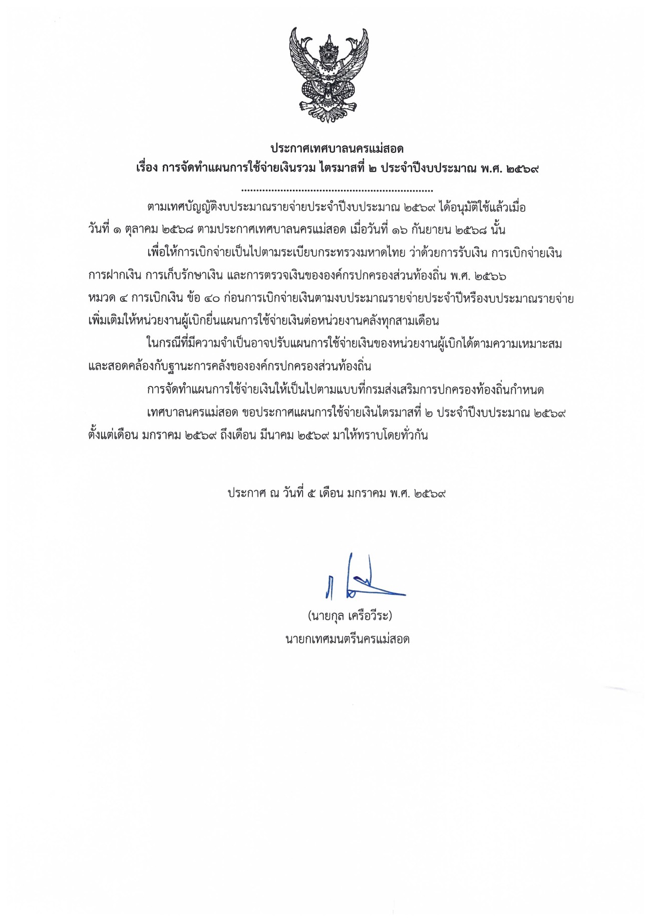 ประกาศเทศบาลนครแม่สอด เรื่อง การจัดทำแผนการใช้จ่ายเงินรวม ไตรมาส ที่ 2 ประจำปีงบประมาณ พ.ศ. 2569