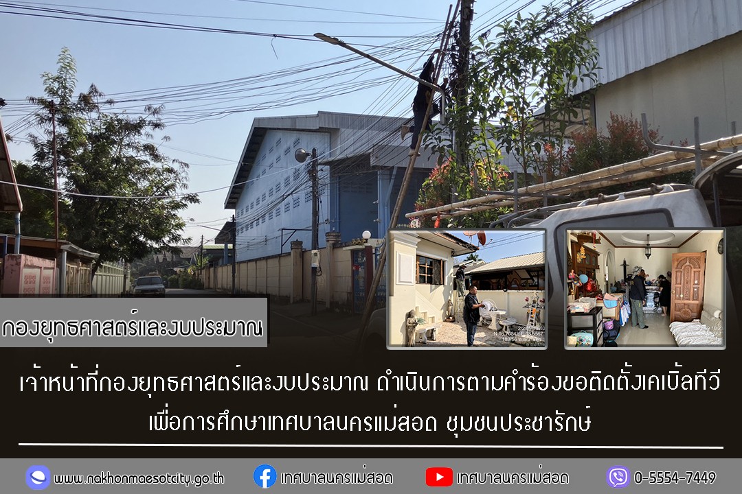 ว่าที่พันตรี ดร.ไพฑูรย์ ปริญญาธรรมกุล ผู้อำนวยการกองยุทธศาสตร์และงบประมาณ มอบหมายให้เจ้าหน้าที่ช่างเคเบิ้ลทีวีเพื่อการศึกษา เจ้าหน้าที่ฝ่ายวิเทศสัมพันธ์ กองยุทธศาสตร์และงบประมาณ ลงพื้นที่ดำเนินการตามคำร้องขอติดตั้งเคเบิ้ลทีวีในเขตชุมชนประชารักษ์ เพื่อให้ประชาชนชุมชนดังกล่าว สามารถรับชมบริการเคเบิ้ลทีวีเพื่อการศึกษาของเทศบาลนครแม่สอดได้