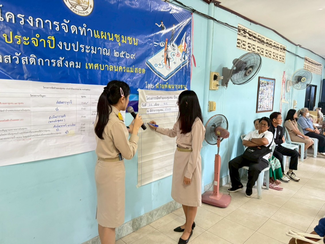 วันที่ 24 พฤศจิกายน พ.ศ.2568 นายสุมิตร กัญจะนะ ผู้อำนวยการกองสวัสดิการสังคม พร้อมกับเจ้าหน้าที่ฝ่ายพัฒนาชุมชน กองสวัสดิการสังคม ร่วมกับกองยุทธศาสตร์และงบประมาณ เทศบาลนครแม่สอด จัดทำโครงการจัดทำแผนชุมชน ปีงบประมาณ 2569 ของชุมชนบ้านทุ่ง ณ ที่ทำการชุมชนบ้านทุ่ง เพื่อรับฟังปัญหาความต้องการของประชาชน และนำบรรจุเข้าแผนชุมชนต่อไป