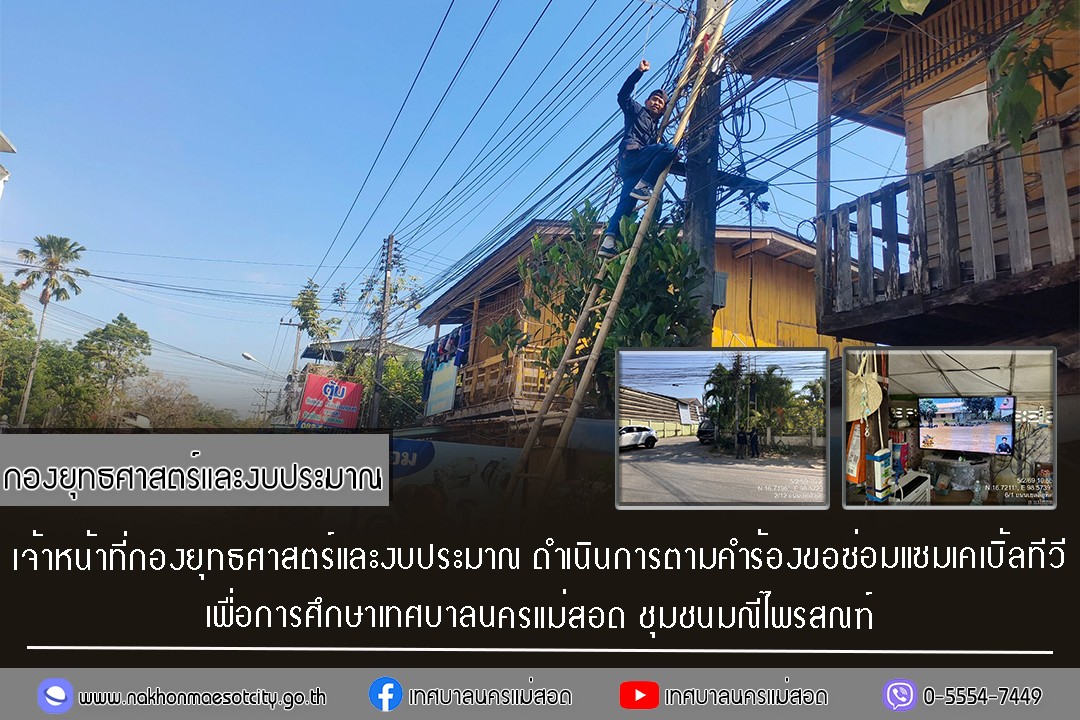 ว่าที่พันตรี ดร.ไพฑูรย์ ปริญญาธรรมกุล ผู้อำนวยการกองยุทธศาสตร์และงบประมาณ มอบหมายให้เจ้าหน้าที่ช่างเคเบิ้ลทีวีเพื่อการศึกษา เจ้าหน้าที่ฝ่ายวิเทศสัมพันธ์ กองยุทธศาสตร์และงบประมาณ ลงพื้นที่ดำเนินการตามคำร้องขอซ่อมแซมเคเบิ้ลทีวีในเขตชุมชนมณีไพรสณฑ์ เพื่อให้ประชาชนในชุมชนดังกล่าว สามารถกลับมารับชมบริการเคเบิ้ลทีวีเพื่อการศึกษาของเทศบาลนครแม่สอดได้ตามปกติ