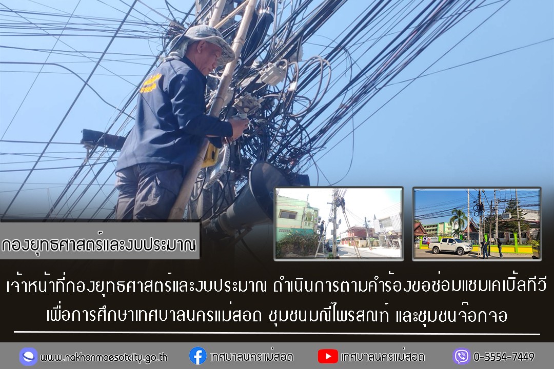 ว่าที่พันตรี ดร.ไพฑูรย์ ปริญญาธรรมกุล ผู้อำนวยการกองยุทธศาสตร์และงบประมาณ มอบหมายให้เจ้าหน้าที่ช่างเคเบิ้ลทีวีเพื่อการศึกษา เจ้าหน้าที่ฝ่ายวิเทศสัมพันธ์ กองยุทธศาสตร์และงบประมาณ ลงพื้นที่ดำเนินการตามคำร้องขอซ่อมแซมเคเบิ้ลทีวีในเขตชุมชนมณีไพรสณฑ์ และชุมชนจ๊อกจอ เพื่อให้ประชาชนในชุมชนดังกล่าว สามารถกลับมารับชมบริการเคเบิ้ลทีวีเพื่อการศึกษาของเทศบาลนครแม่สอดได้ตามปกติ