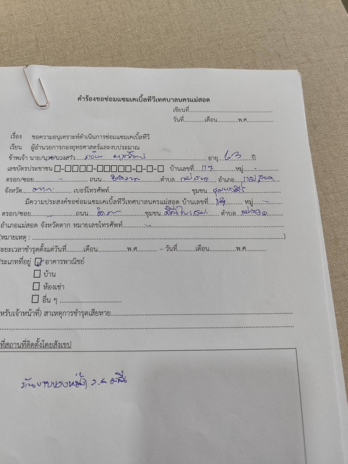 เจ้าหน้าที่กองยุทธศาสตร์และงบประมาณ ดำเนินการตามคำร้องขอซ่อมแซมเคเบิ้ลทีวี ชุมชนร่วมแรง