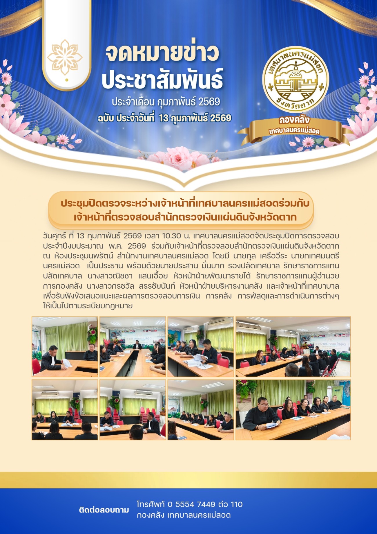 วันศุกร์ ที่ 13 กุมภาพันธ์ 2569 เวลา 10.30 น. เทศบาลนครแม่สอดจัดประชุมปิดการตรวจสอบ ประจำปีงบประมาณ พ.ศ. 2569 ร่วมกับเจ้าหน้าที่ตรวจสอบสำนักตรวจเงินแผ่นดินจังหวัดตาก ณ ห้องประชุมนพรัตน์ สำนักงานเทศบาลนครแม่สอด โดยมี นายกุล เครือวีระ นายกเทศมนตรีนครแม่สอด เป็นประธาน พร้อมด้วยนายประสาน มั่นมาก รองปลัดเทศบาล รักษาราชการแทนปลัดเทศบาล นางสาวณิชชา แสนเอื้อย หัวหน้าฝ่ายพัฒนารายได้ รักษาราชการแทนผู้อำนวยการกองคลัง นางสาวกรชวัล สรรชัยนันท์ หัวหน้าฝ่ายบริหารงานคลัง และเจ้าหน้าที่เทศบาบาล เพื่อรับฟังข้อเสนอแนะและผลการตรวจสอบการเงิน การคลัง การพัสดุและการดำเนินการต่างๆให้เป็นไปตามระเบียบกฎหมาย