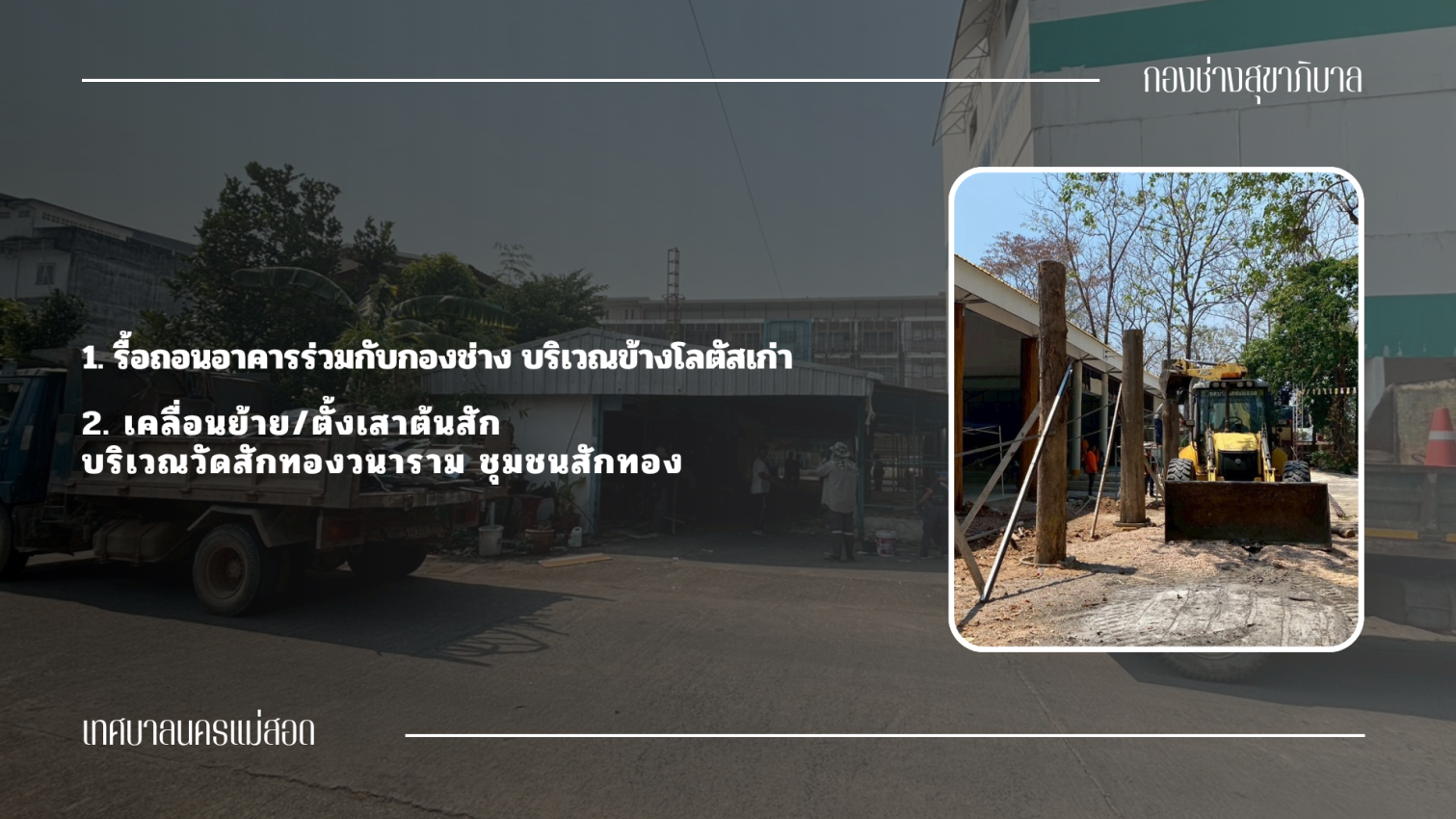 1. ได้ดำเนินการรื้อถอนอาคารร่วมกับกองช่าง บริเวณข้างโลตัสเก่า