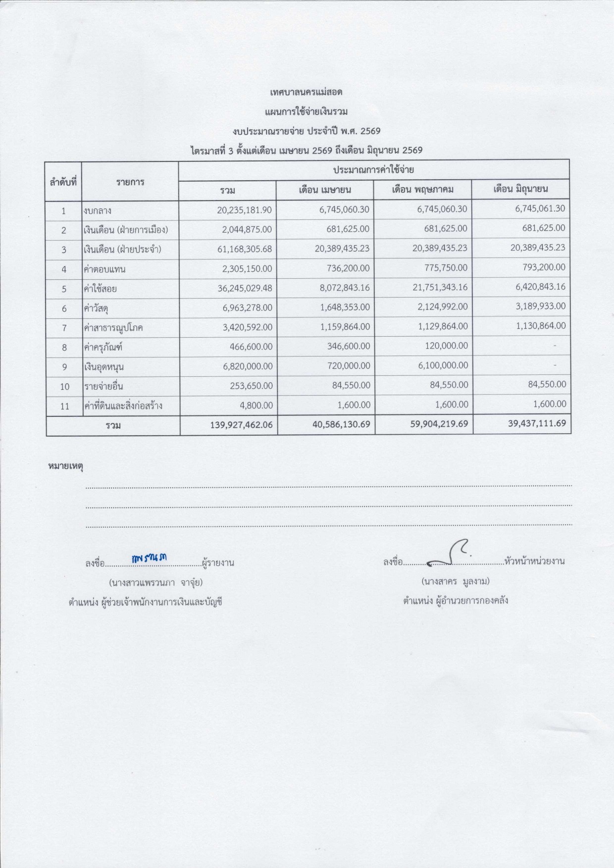 ประกาศเทศบาลนครแม่สอด เรื่อง การจัดทำแผนการใช้จ่ายเงินรวม ไตรมาสที่ 3 ประจำปีงบประมาณ พ.ศ. 2569