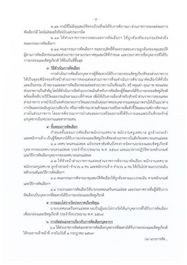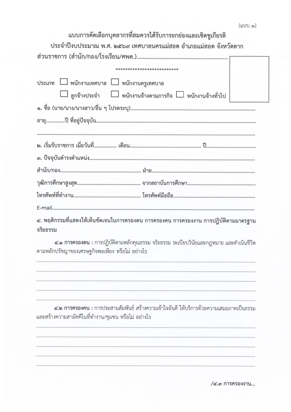 ประกาศเทศบาลนครแม่สอด เรื่อง หลักเกณฑ์และวิธีการคัดเลือกบุคลากรเพื่อยกย่องและเชิดชูเกียรติของเทศบาลนครแม่สอด ประจำปีงบประมาณ พ.ศ.2569