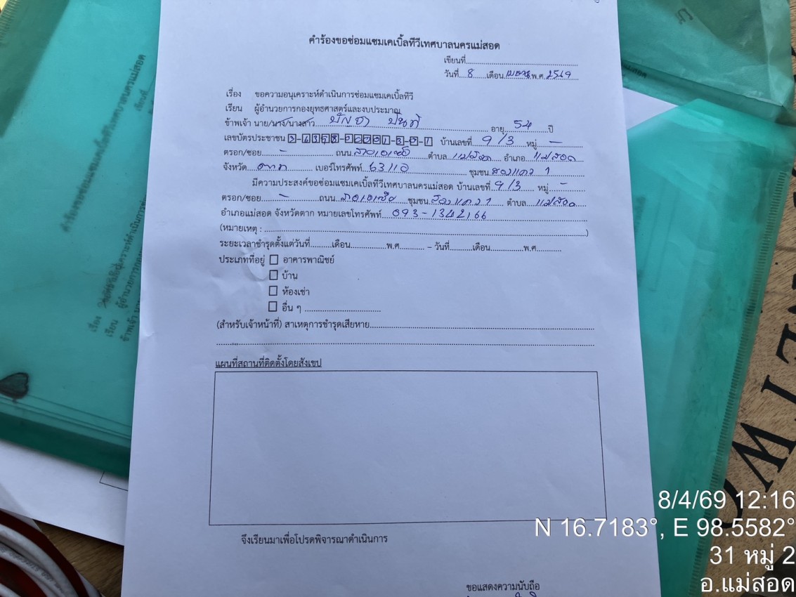 เจ้าหน้าที่กองยุทธศาสตร์และงบประมาณ ดำเนินการตามคำร้องขอซ่อมแซมเคเบิ้ลทีวี ชุมชนมณีไพรสนฑ์
