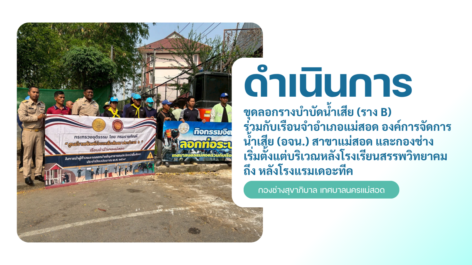 ได้ดำเนินการขุดลอกรางบำบัดน้ำเสีย (ราง B) ร่วมกับเรือนจำอำเภอแม่สอด องค์การจัดการน้ำเสีย (อจน.) สาขาแม่สอดและกองช่าง