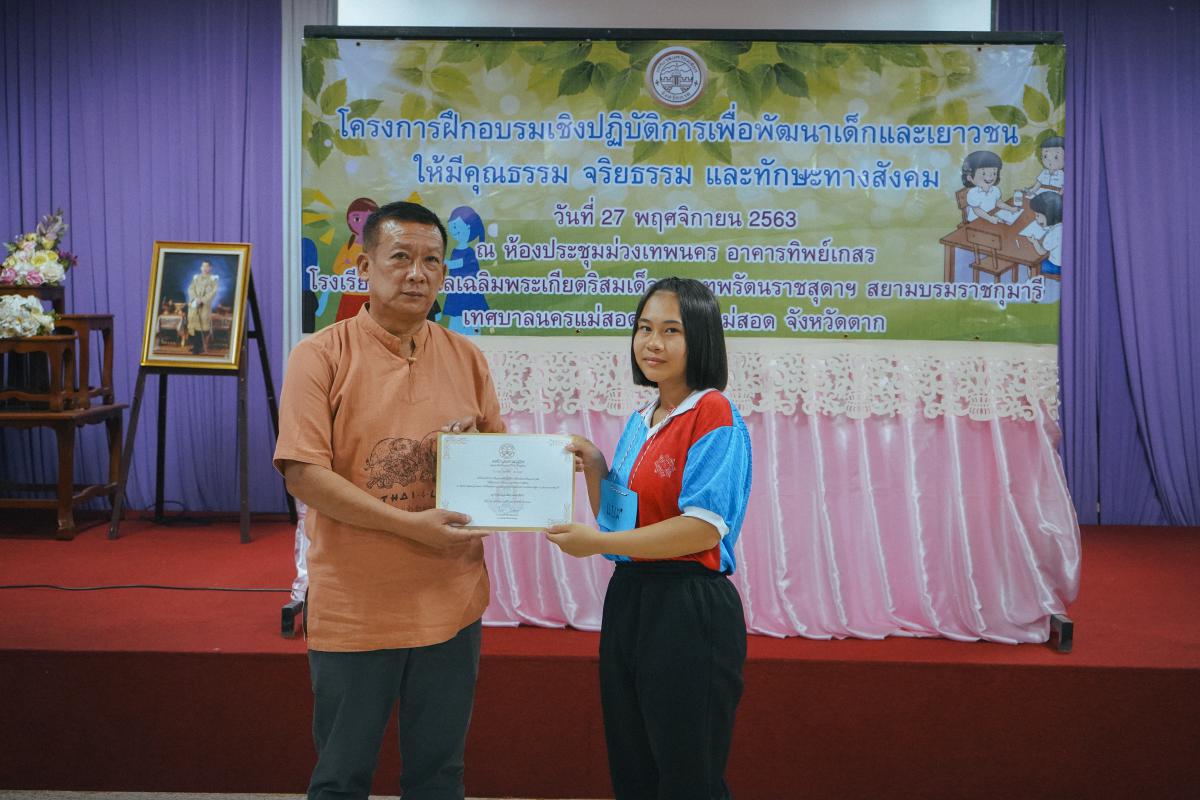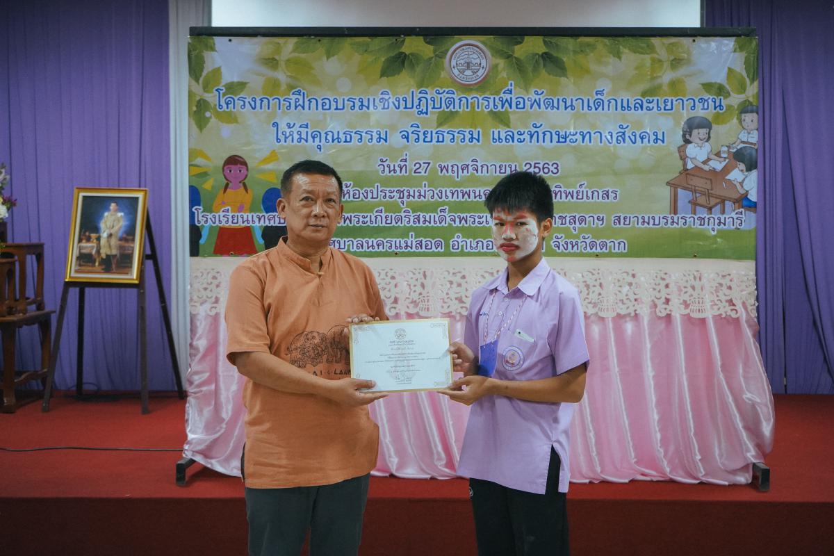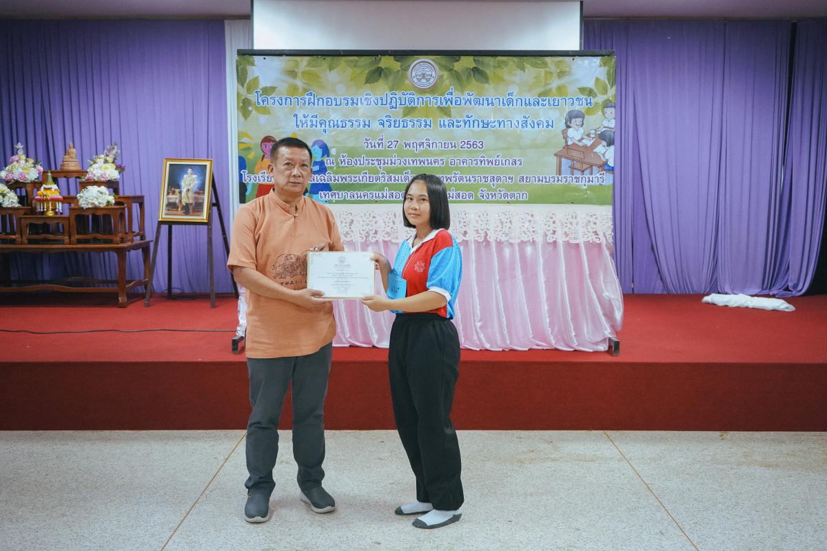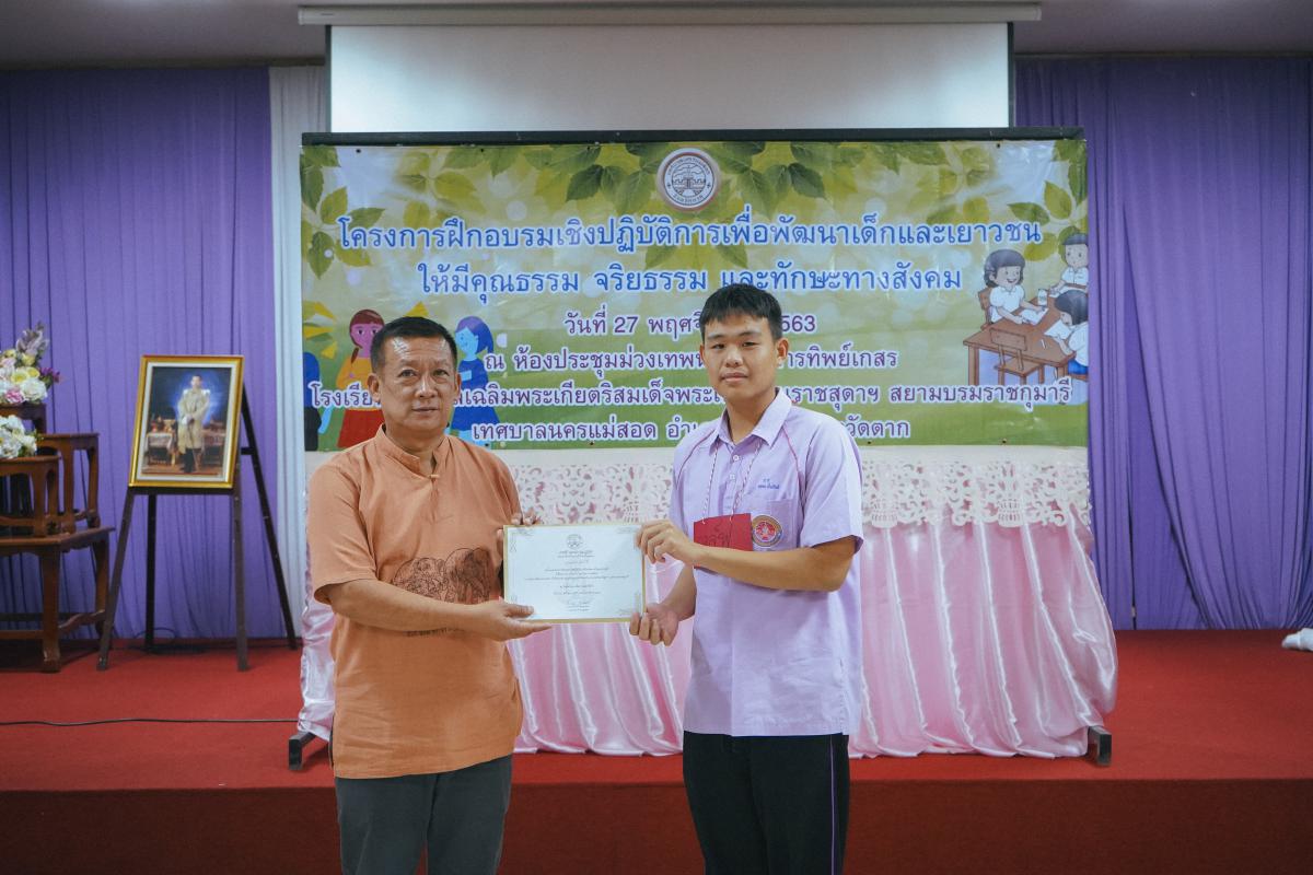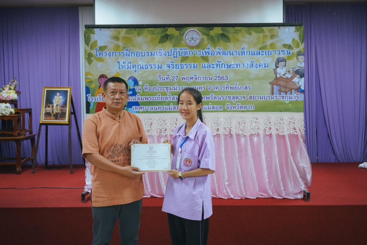 การจัดโครงการฝึกอบรมเชิงปฏิบัติการเพื่อพัฒนาเด็กและเยาวชนให้มีคุณธรรม จริยธรรม และทักษะทางสังคม มีวัตถุประสงค์เพื่อส่งเสริมคุณค่าและส่งเสริมศักยภาพเด็กและเยาวชนผู้เป็นกำลังสำคัญในการพัฒนาชาติ โดยมีกลุ่มเป้าหมายคือสภาเด็กและเยาวชนเทศบาลนครแม่สอด เด็กและเยาวชนในเขตเทศบาลนครแม่สอด รวมทั้งสิ้น 58 คน