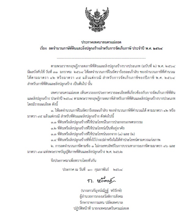 ประกาศเทศบาลนครแม่สอด เรื่อง ลดจำนวนภาษีที่ดินและสิ่งปลูกสร้างสำหรับการจัดเก็บภาษี ประจำปี พ.ศ. 2564