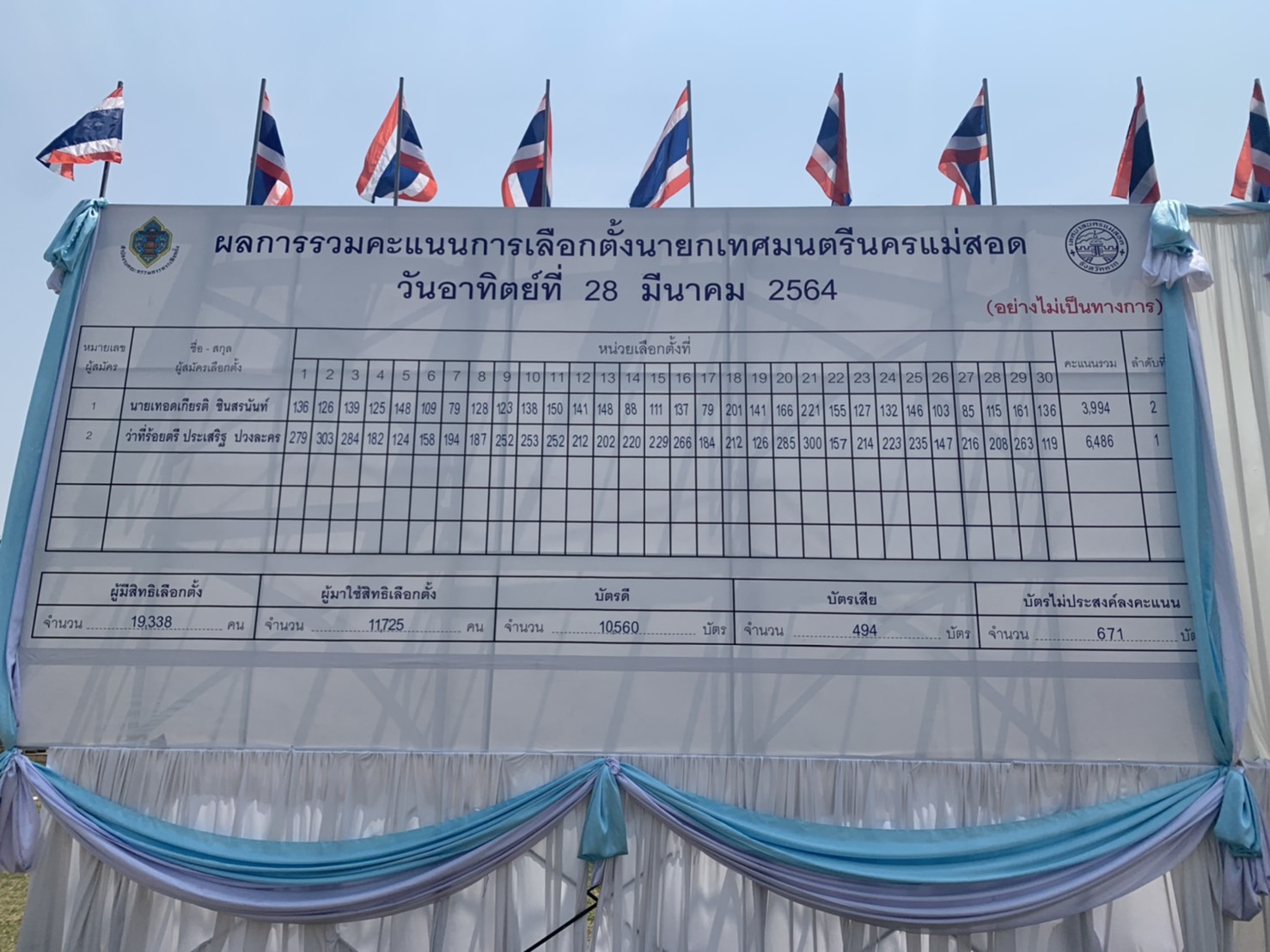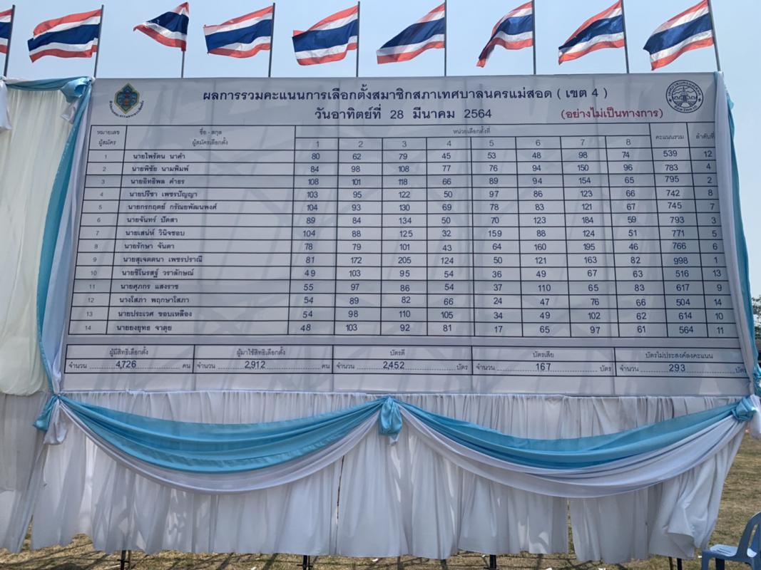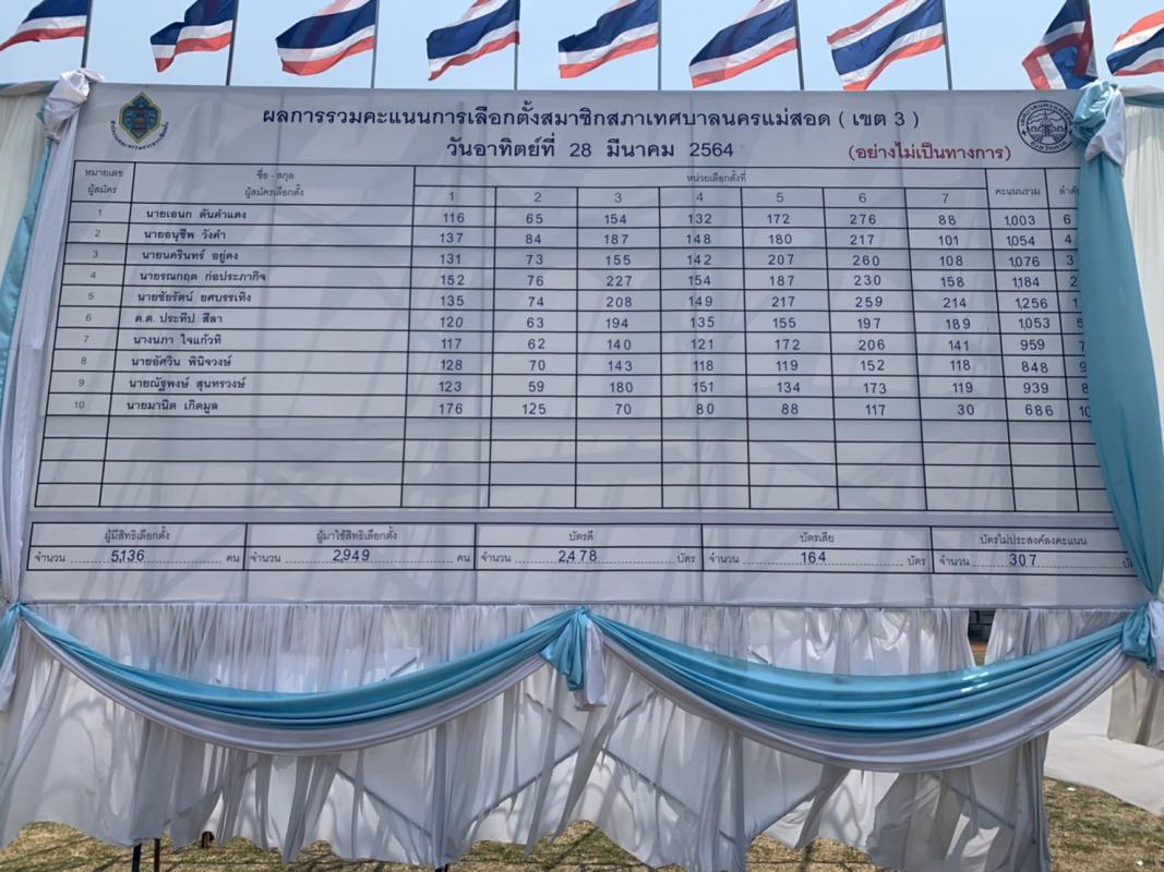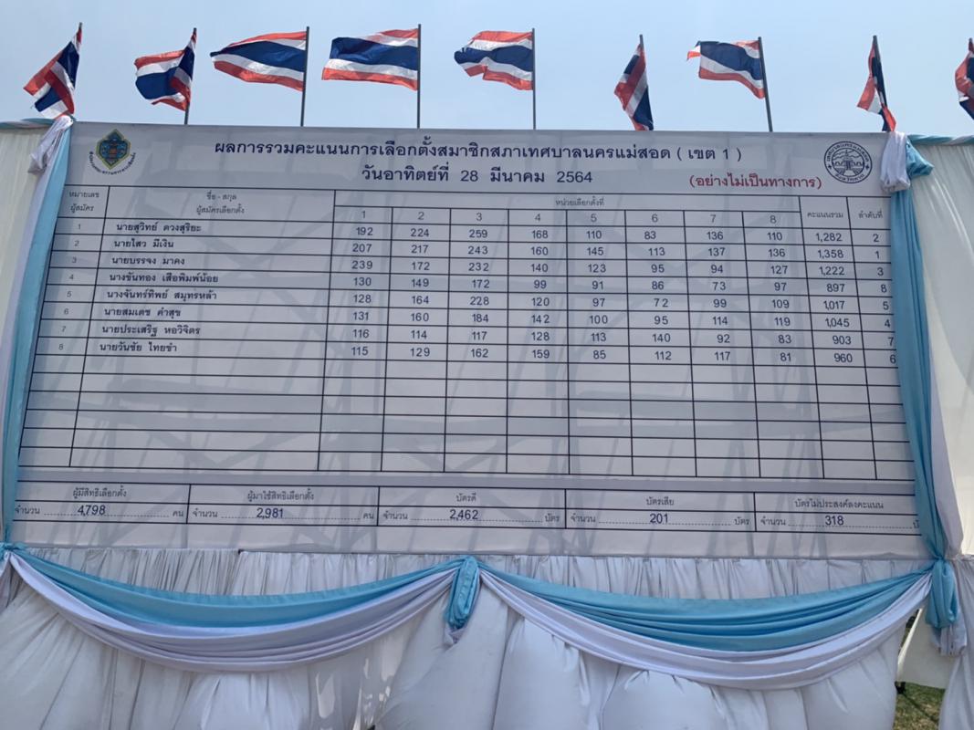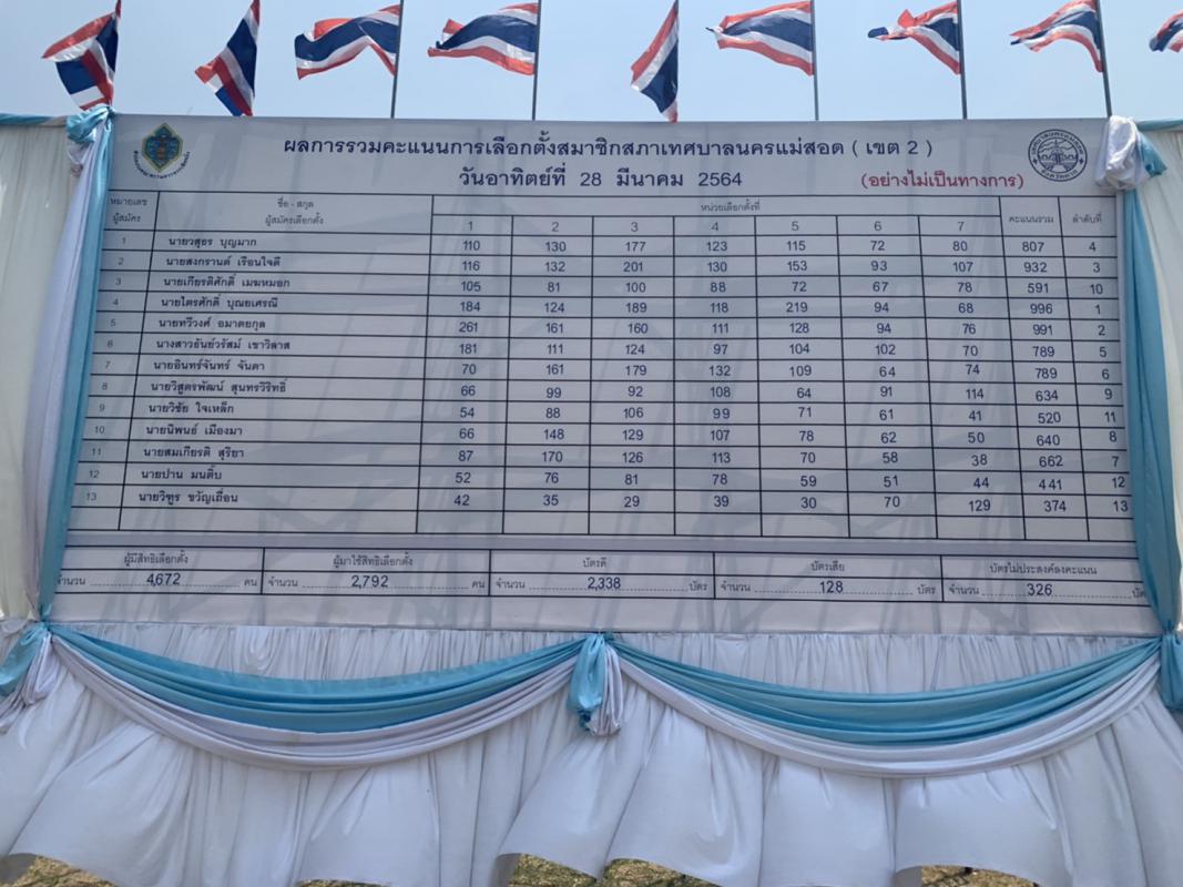 เมื่อวันอาทิตย์ ที่ 28 มีนาคม 2564 เวลา 17.00 น. ณ สนามกีฬาสมเด็จพระนเรศวรมหาราช เทศบาลนครแม่สอด ได้นับผลการเลือกตั้งสมาชิกสภาเทศบาลและนายกเทศมนตรีนครแม่สอดจากการเลือกตั้งในวันอาทิตย์ ที่ 28 มีนาคม 2564 ตั้งแต่เวลา 08.00 – 17.00 น. (อย่างไม่เป็นทางการ) ดังนี้