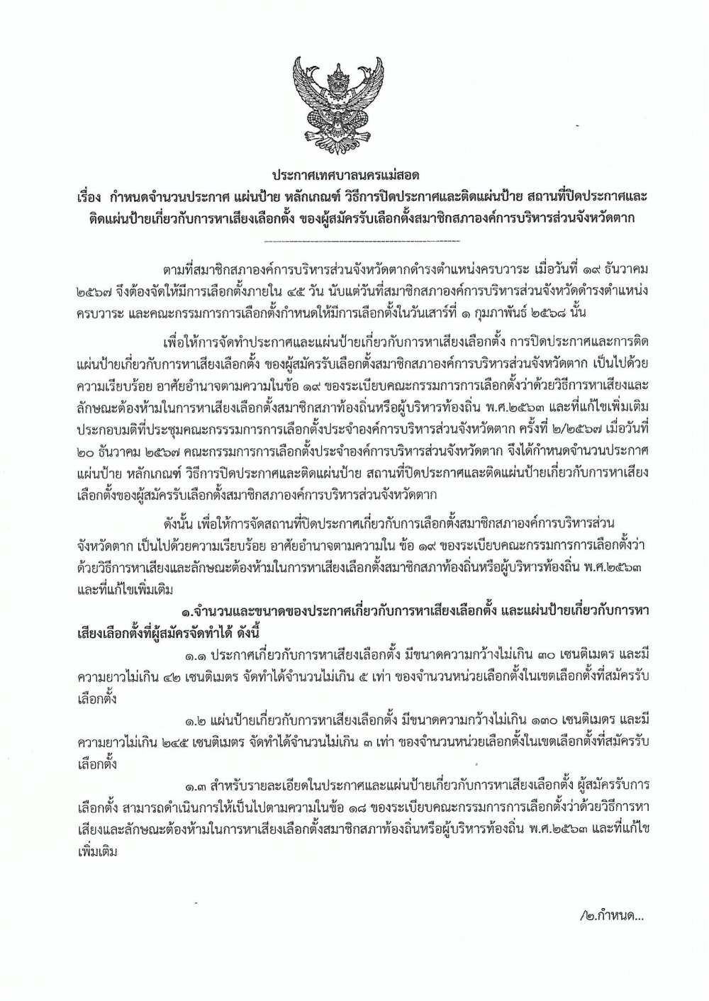 ประกาศเทศบาลนครแม่สอด เรื่อง กำหนดจำนวนประกาศ แผ่นป้าย หลักเกณฑ์ วิธีการปิดประกาศและติดแผ่นป้าย สถานที่ปิดประกาศและติดแผ่นป้ายเกี่ยวกับการหาเสียงเลือกตั้ง ของผู้สมัครรับเลือกตั้งสมาชิกสภาองค์การบริหารส่วนจังหวัดตาก