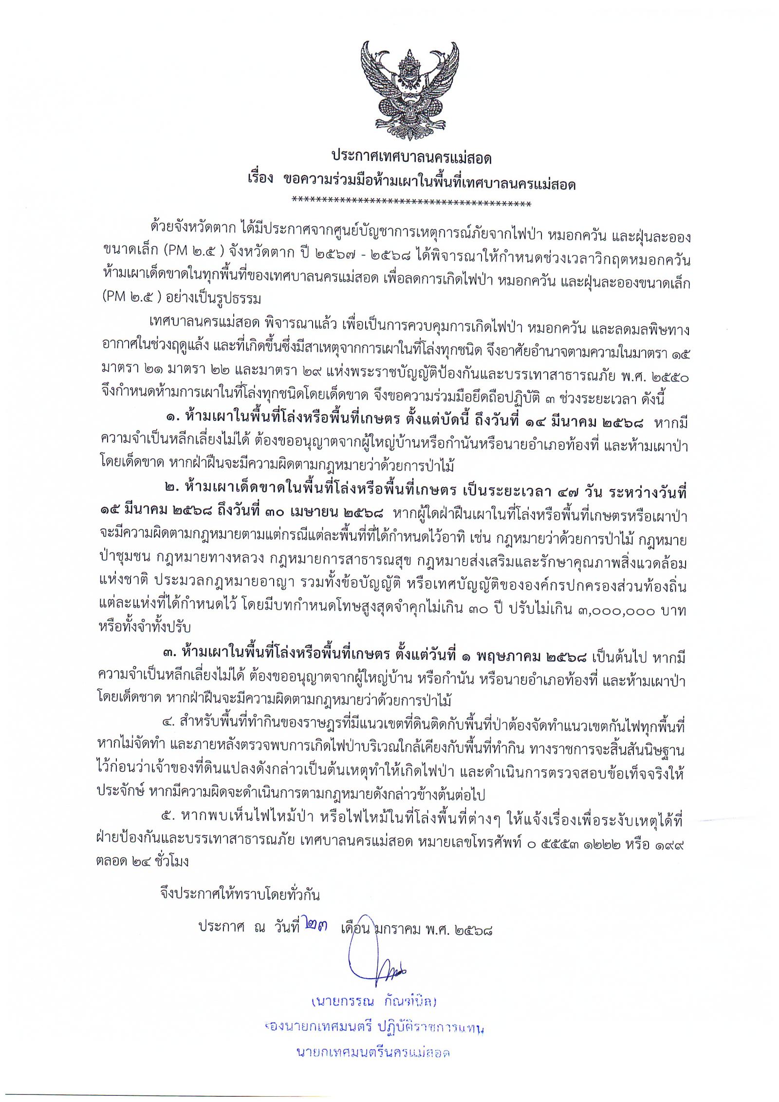 ประกาศเทศบาลนครแม่สอด เรื่อง ขอความร่วมมือห้ามเผาในพื้นที่เทศบาลนครแม่สอด