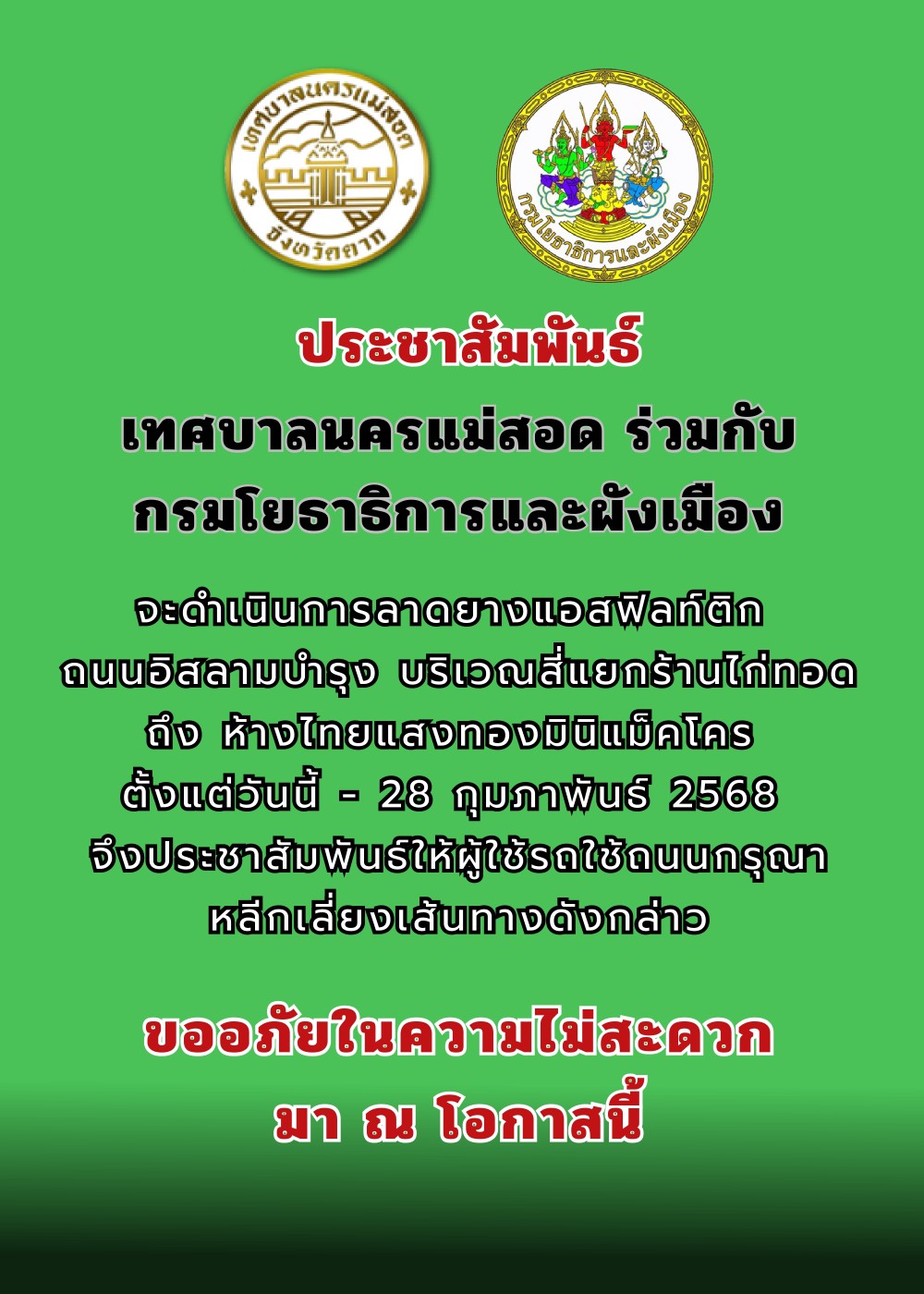 ประชาสัมพันธ์เทศบาลนครแม่สอดร่วมกับกรมโยธาธิการและผังเมืองจะดำเนินการลาดยางแอสฟิลท์ติก ถนนอิสลามบำรุงบริเวณสี่แยกร้านไก่ทอดถึงห้างไทยแสงทองมินิแม็คโคร ตั้งแต่วันนี้ - 28 กุมภาพันธ์ 2568 จึงประชาสัมพันธ์ให้ผู้ใช้รถใช้ถนนกรุณาหลีกเลี่ยงเส้นทางดังกล่าวขออภัยในความไม่สะดวกมา ณ โอกาสนี้