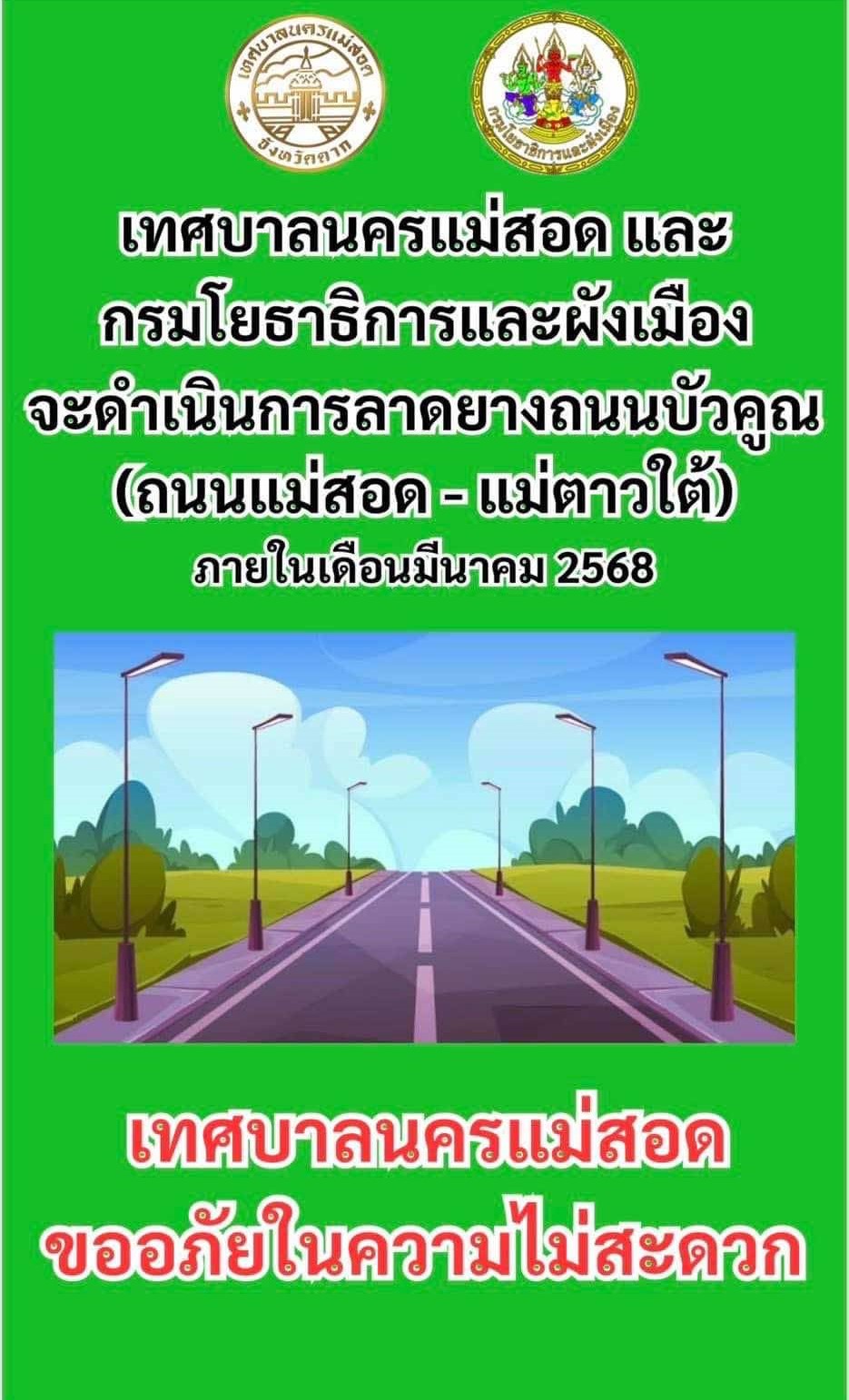 ประชาสัมพันธ์เทศบาลนครแม่สอดร่วมกับกรมโยธาธิการและผังเมืองจะดำเนินการลาดยางแอสฟิลท์ติก ถนนบัวคูณ (ถนนแม่สอด - แม่ตาวใต้) ภายในเดือน มีนาคม 2568 จึงประชาสัมพันธ์ให้ผู้ใช้รถใช้ถนนกรุณาหลีกเลี่ยงเส้นทางดังกล่าวขออภัยในความไม่สะดวกมา ณ โอกาสนี้