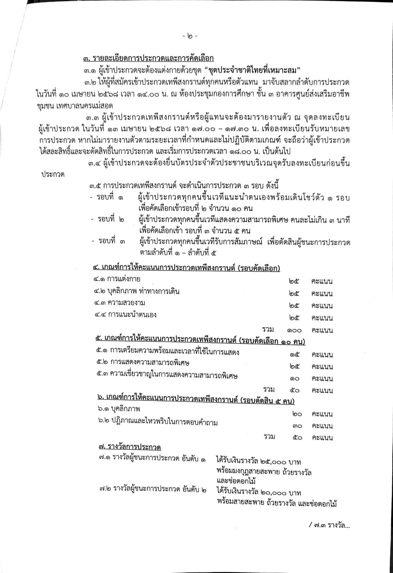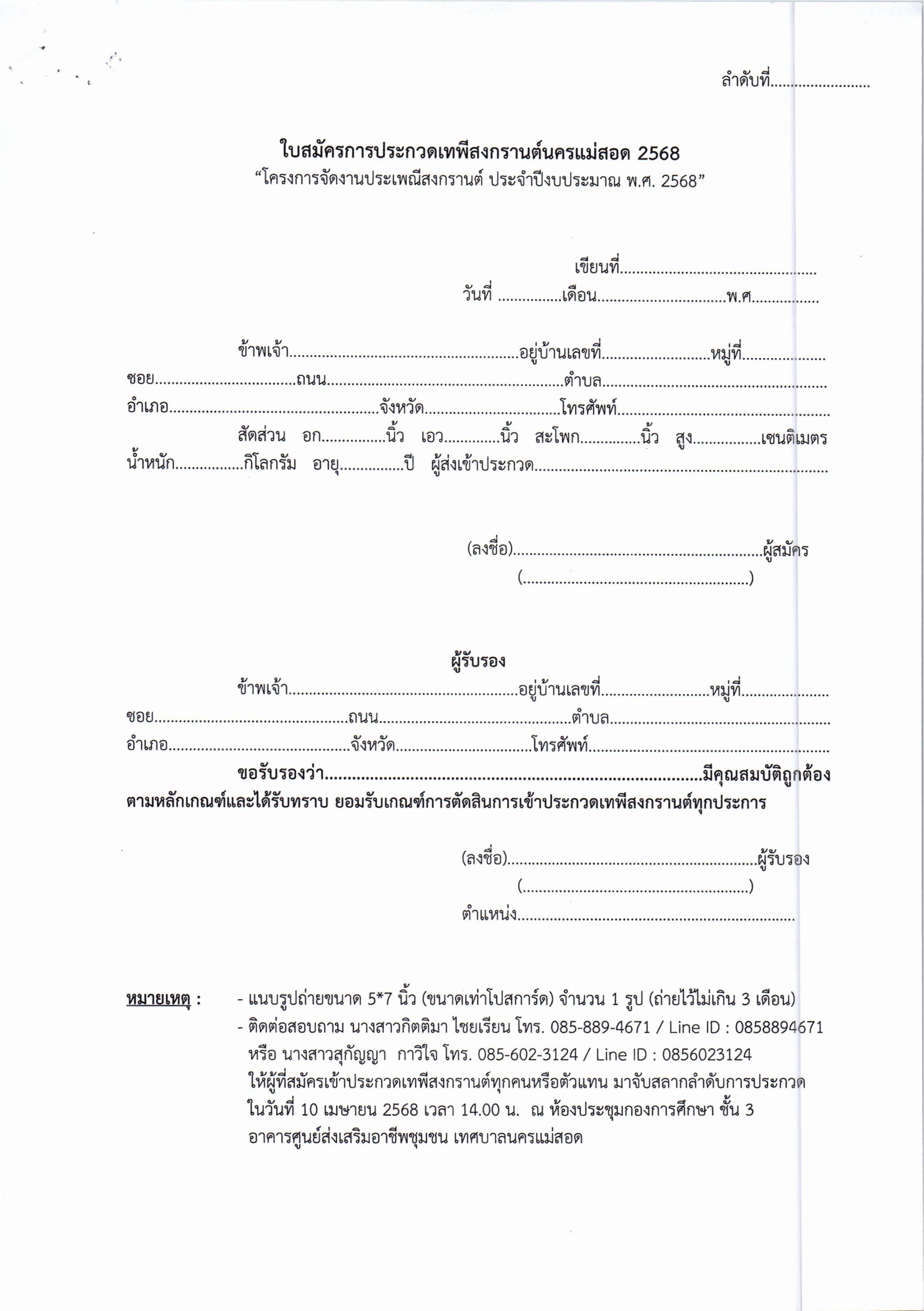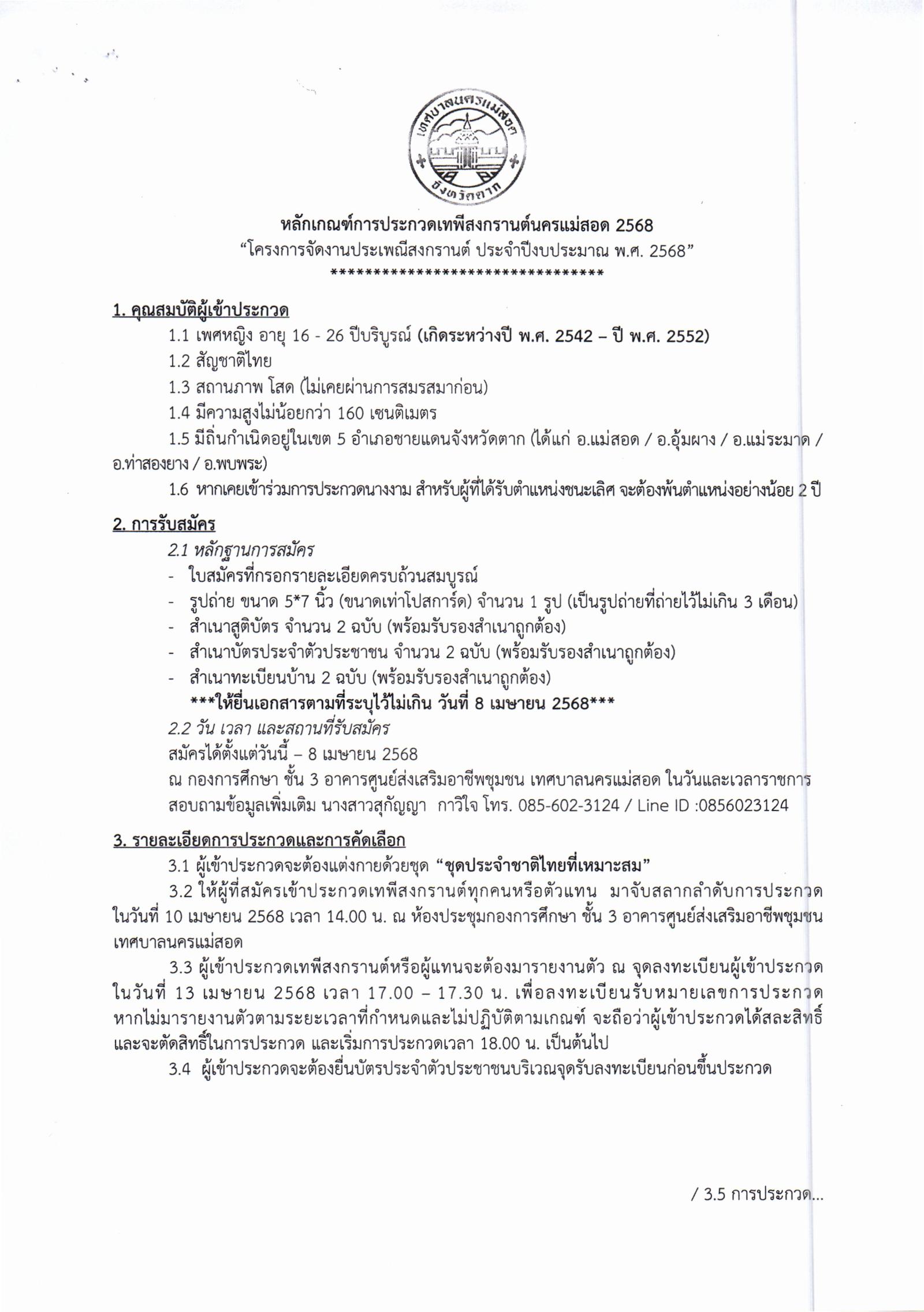 ประกาศเทศบาลนครแม่สอด เรื่อง การรับสมัครผู้เข้าประกวดเทพีสงกรานต์นครแม่สอด 2568 ตามโครงการจัดงานประเพณีสงกรานต์