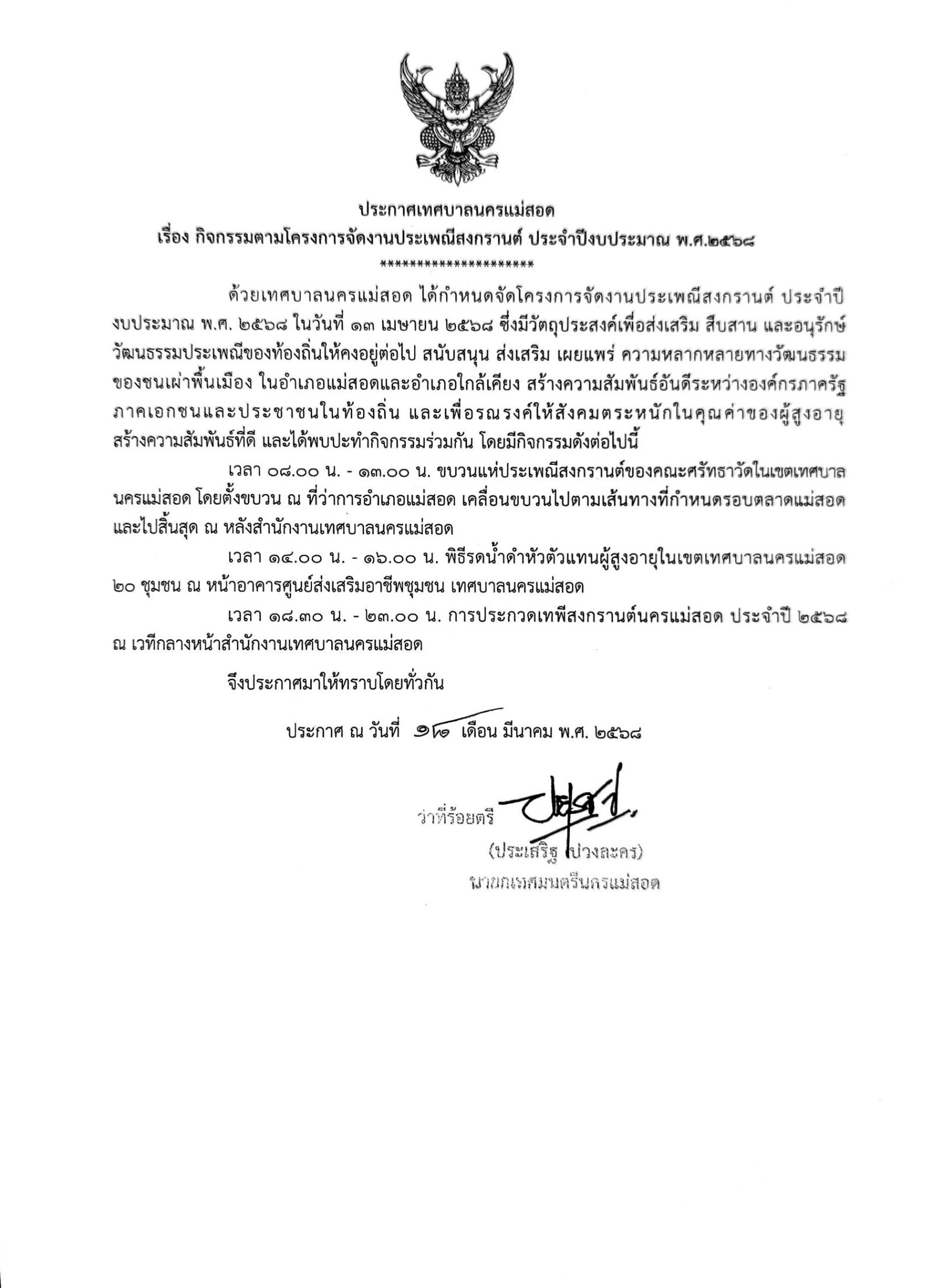 ประกาศเทศบาลนครแม่สอด เรื่อง กิจกรรมตามโครงการจัดงานประเพณีสงกรานต์ ประจำปีงบประมาณ พ.ศ. 2568 (ขบวนแห่สงกรานต์/พิธีรดน้ำดำหัวผู้สูงอายุ/การประกวดเทพีสงกรานต์นครแม่สอด)