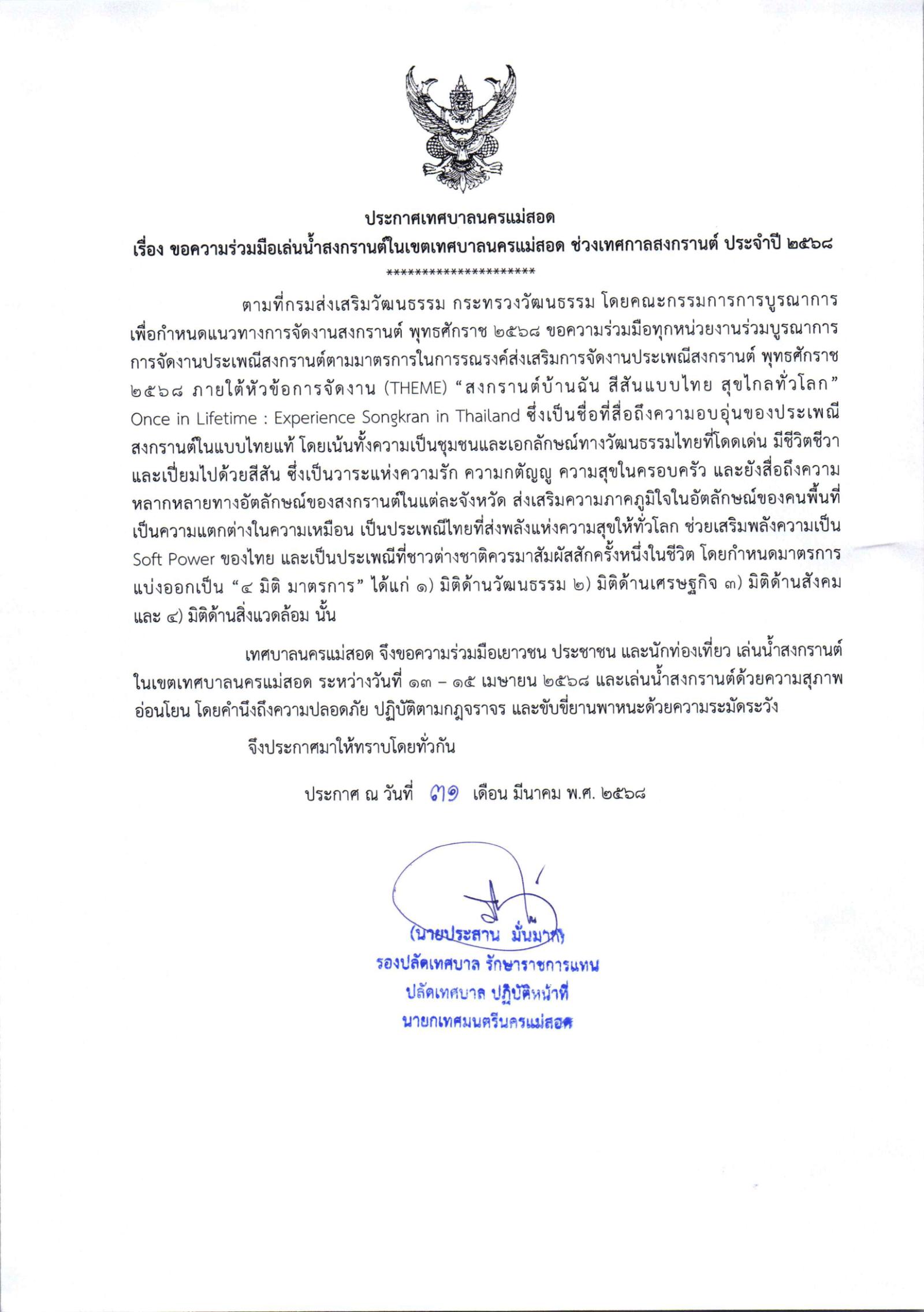 ประกาศเทศบาลนครแม่สอด เรื่อง ขอความร่วมมือเล่นน้ำสงกรานต์ในเขตเทศบาลนครแม่สอด ช่วงเทศกาลสงกรานต์ ประจำปี 2568
